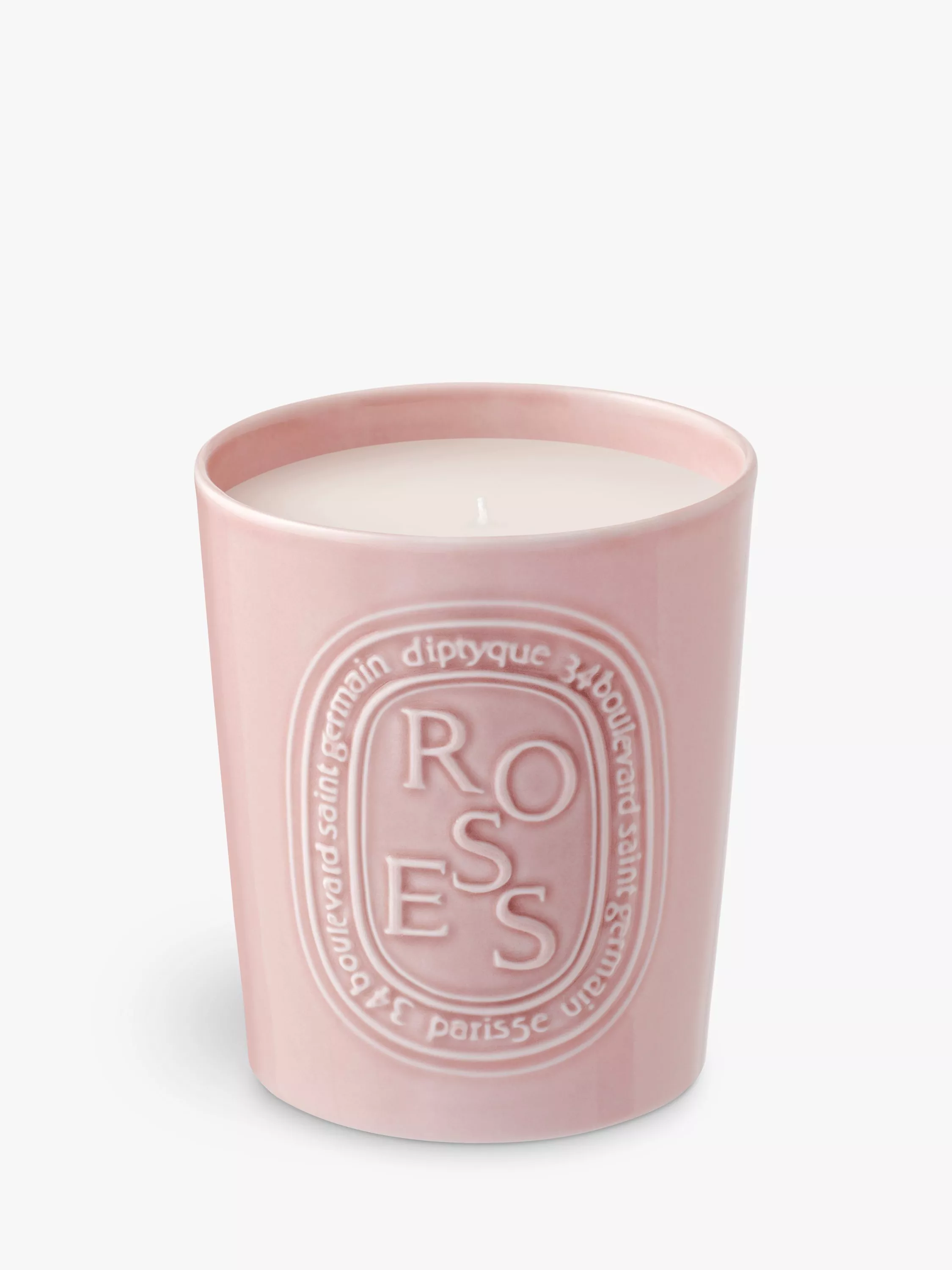 A bouquet of fresh roses, blooming in the heart of winter. The handmade porcelain container features the Diptyque oval in an antique rose.