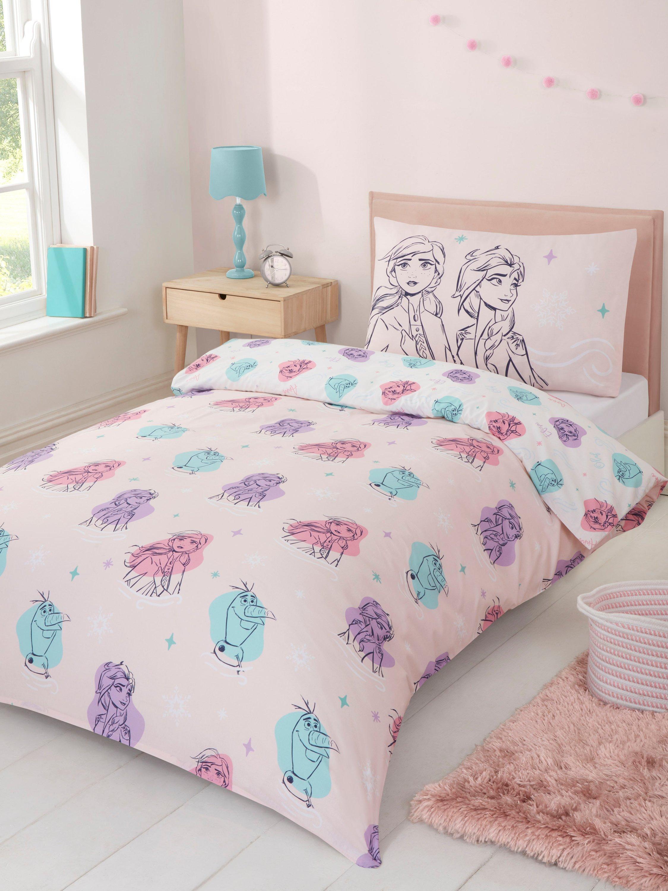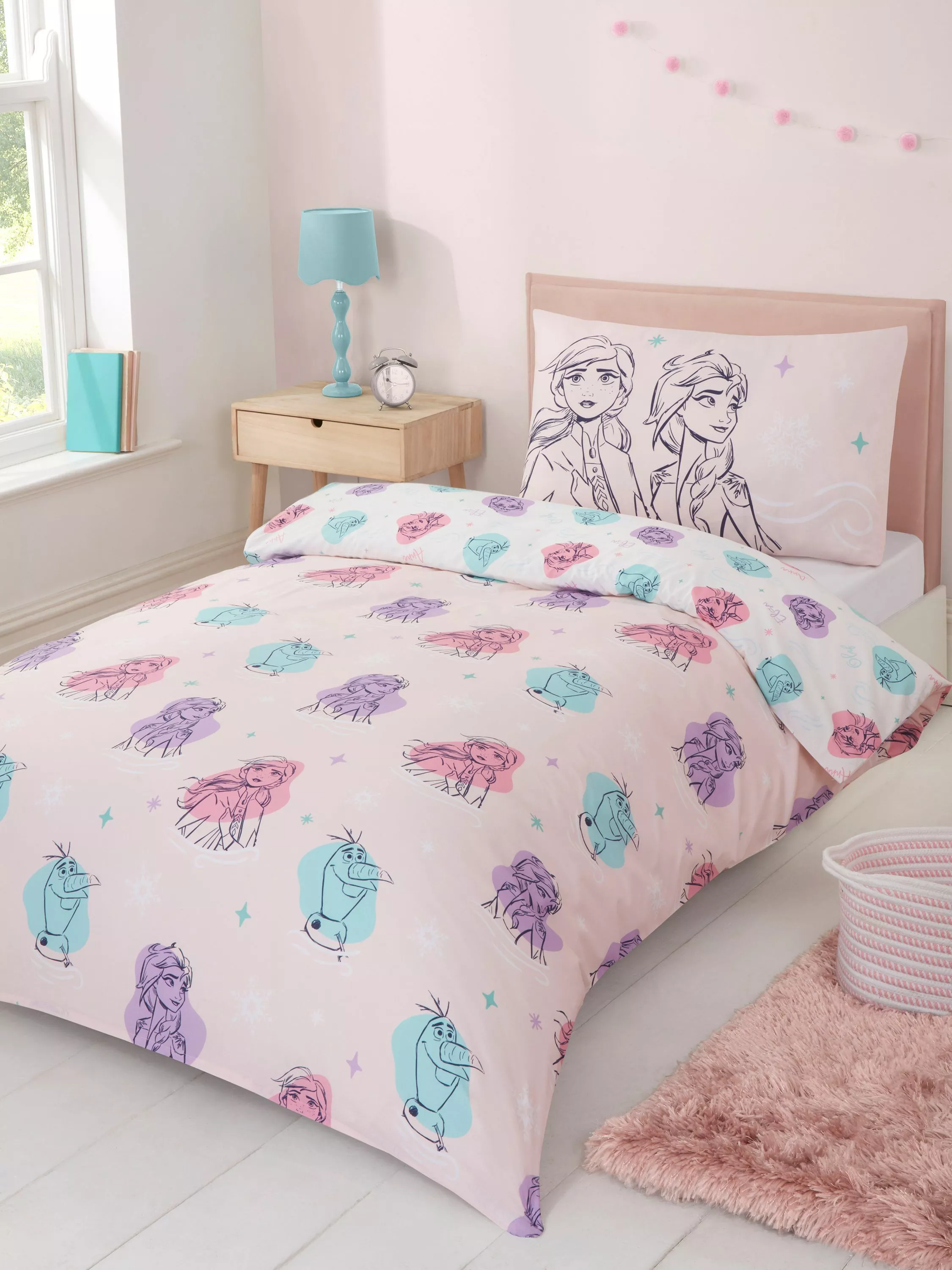 A 100% cotton duvet set featuring Frozen-favourites, Elsa, Anna and Olaf. With a reversible design you can switch the style after every wash.