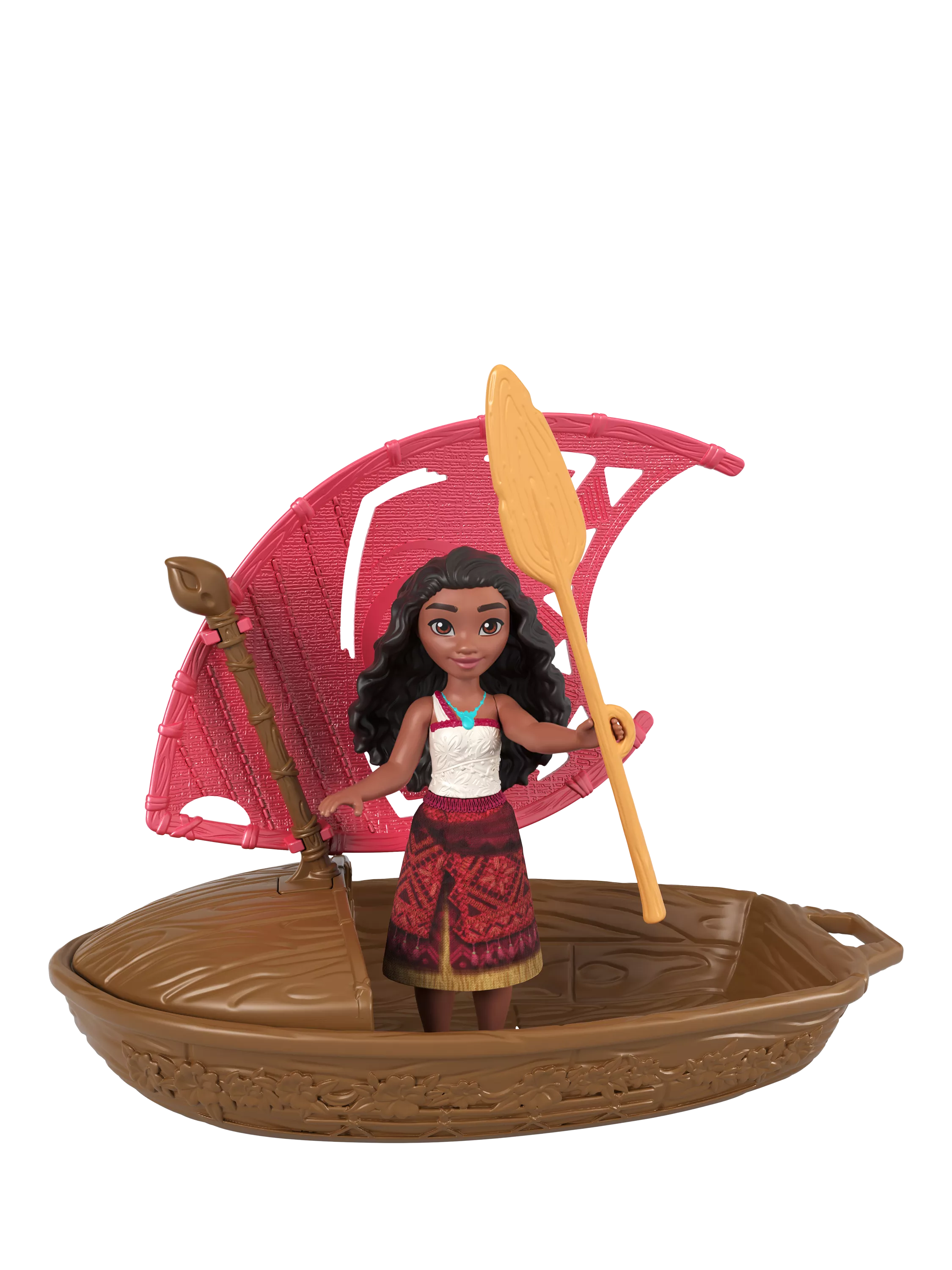 Unbox a surprise inside each Wayfinder Wonders small doll set inspired by Disney's Moana 2, the theatrical movie sequel to the original film. Lift the sail and uncover a character doll nestled in the canoe. Assemble the toy canoe and set off on an ocean adventure. It really floats!