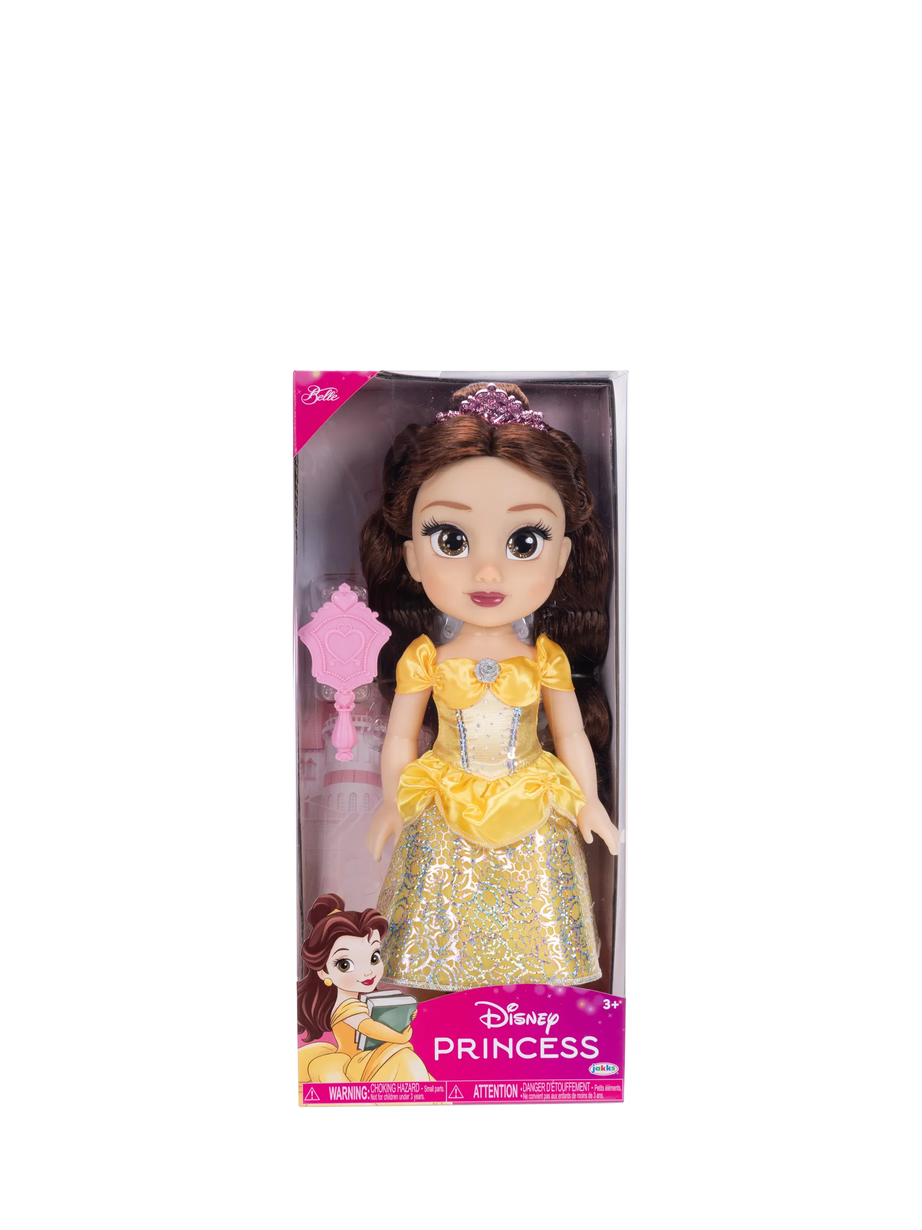 Inspired by Disney's Beauty and the Beast, this beautiful Belle fashion doll features a platinum holofoil print skirt embellished with roses and hand-held mirrors that glimmer in the light. She has shimmery glitter eyes, a removable princess dress, a princess tiara, easy-on, easy-off shoes and a brush to style her long-flowing hair with a stylish bun.