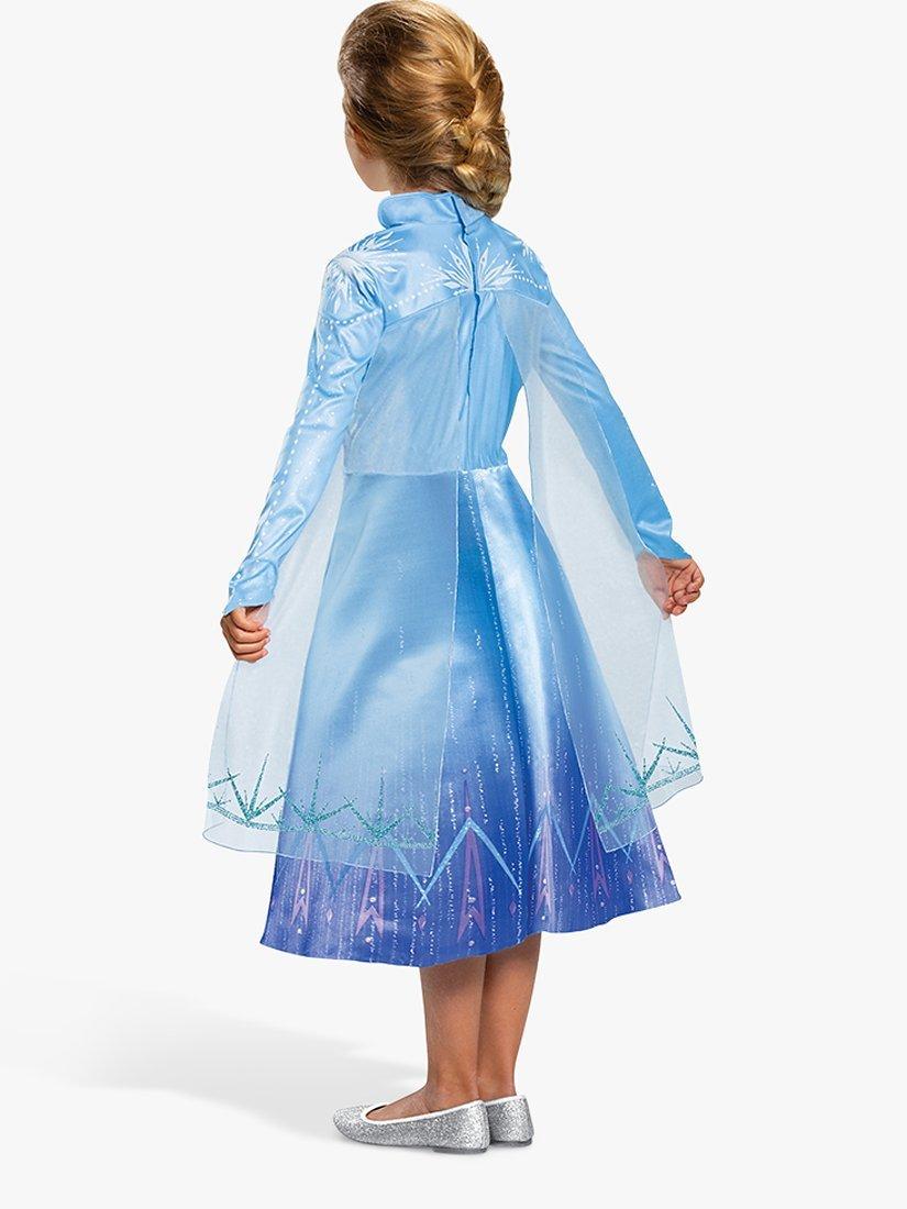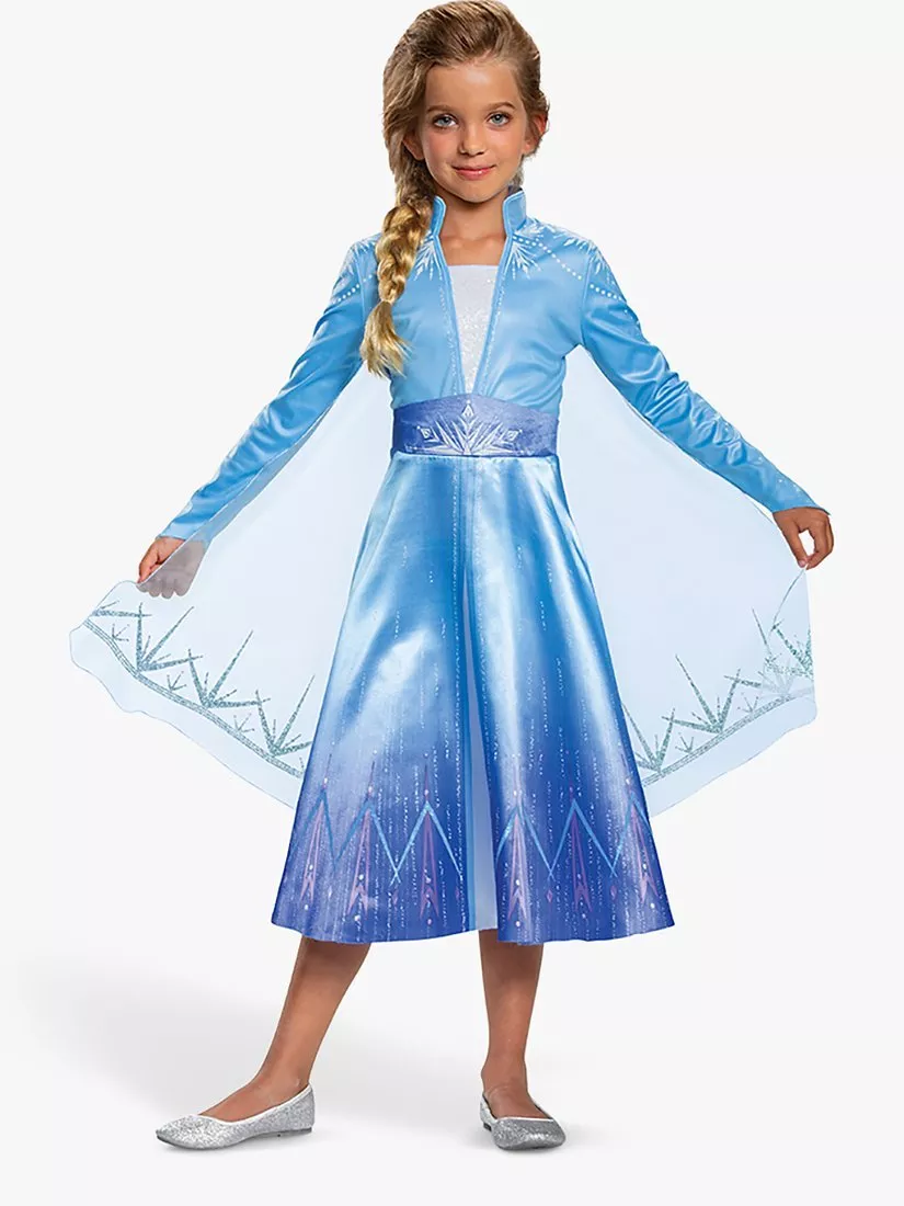 Look absolutely regal in this gorgeous Elsa Deluxe Frozen 2 Costume. This beautiful satin dress features glitter print and mini sequin detail. The attached organza cape sparkles with a high-shine glitter print.