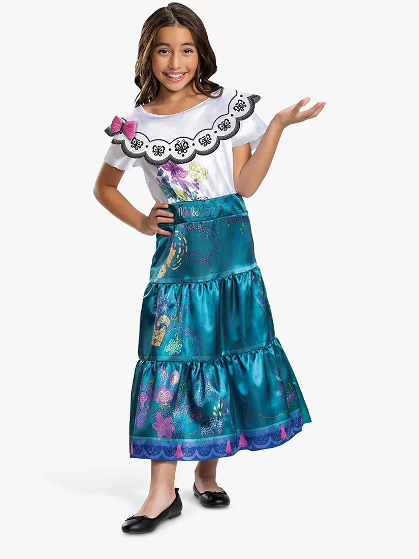 Search for your gift and become a part of the Madrigal family in this Mirabel Deluxe costume! This satin dress features neckline ruffle detailing with black glitter screen print.