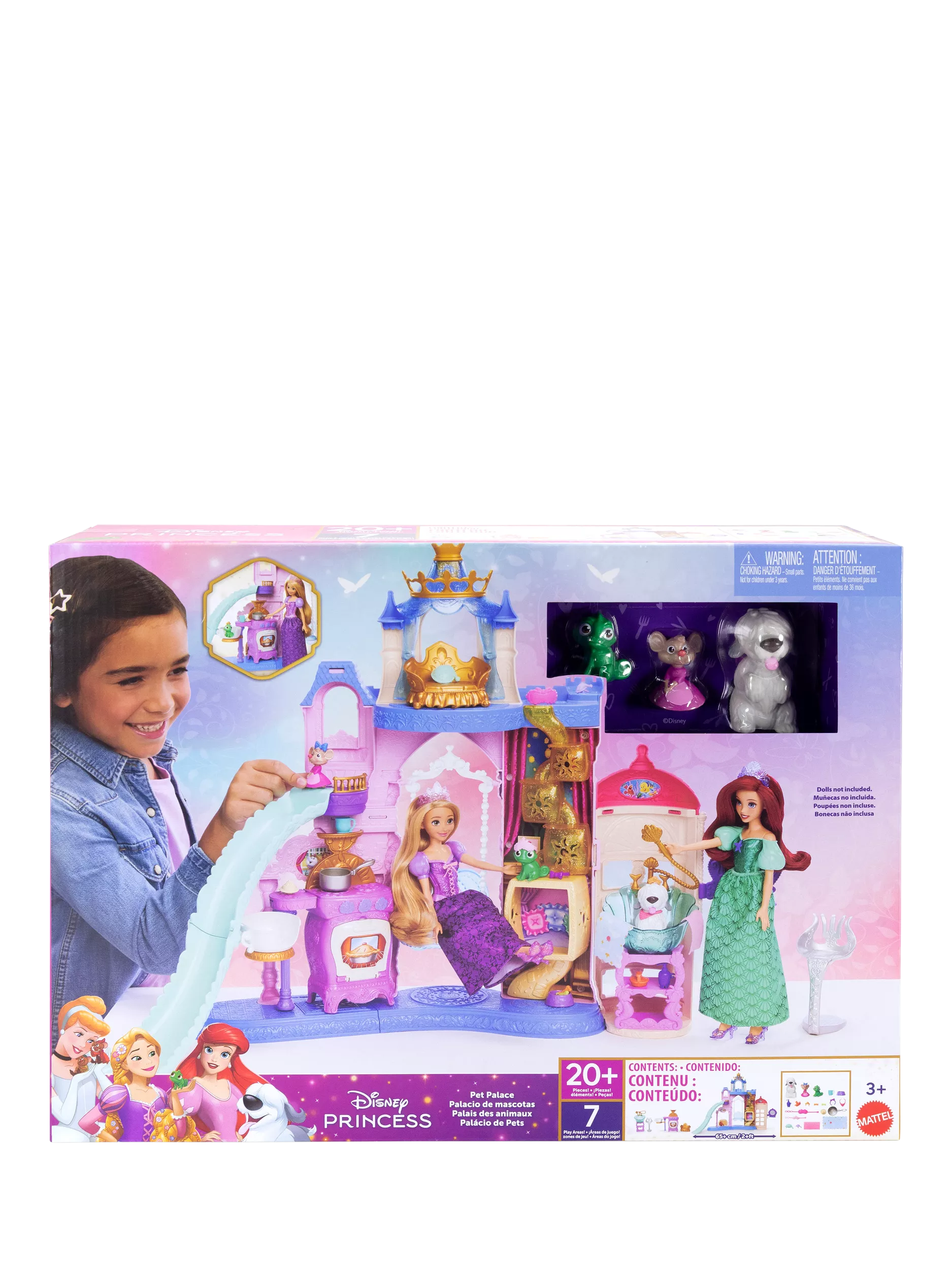 Beloved animal friends inspired by Disney movies come together in the Disney Princess Pet Palace playset. Measuring more than two feet (65cm) wide and featuring seven Princess-inspired play areas, this playset is a dream come true for precious animal friends.