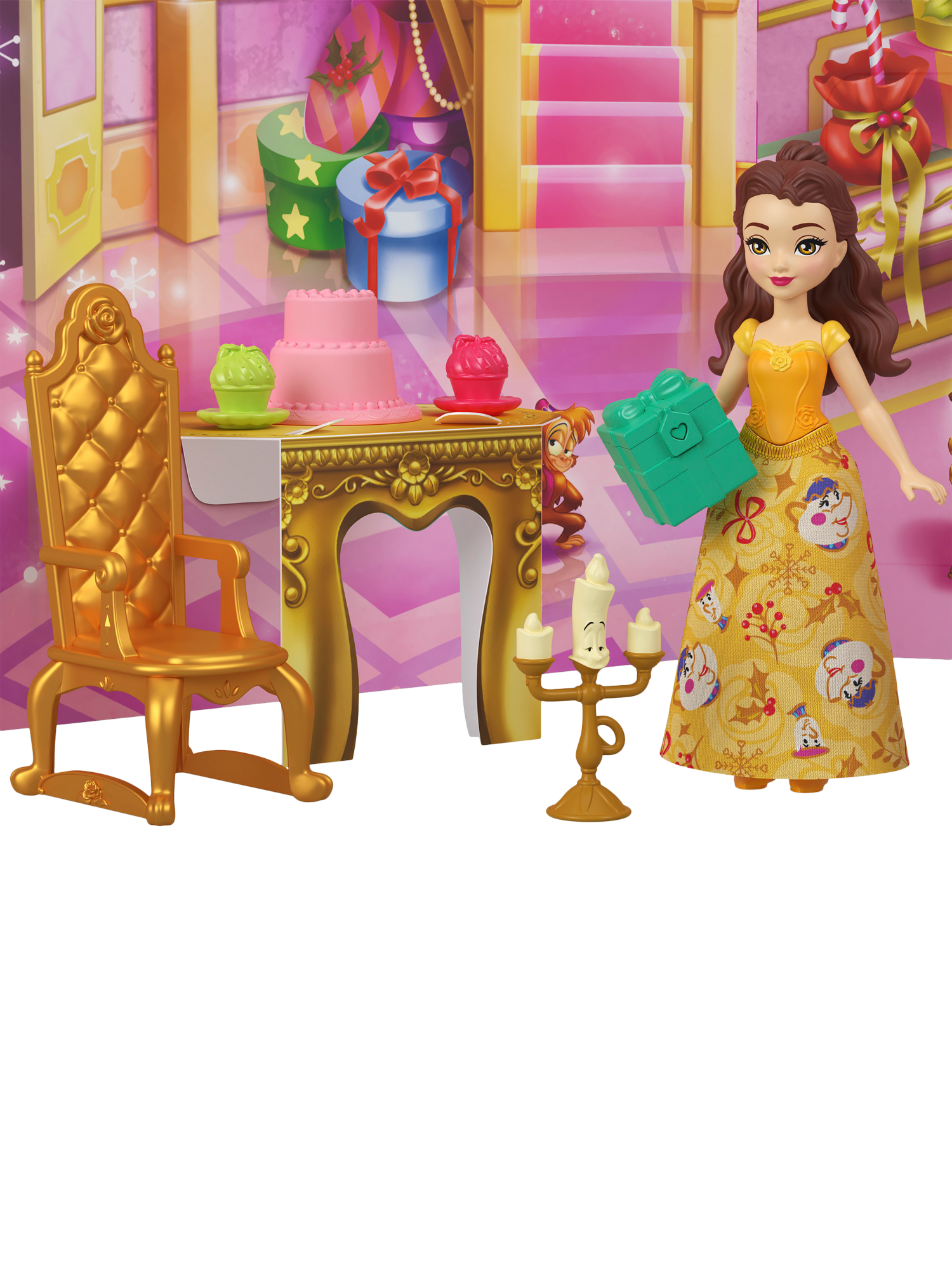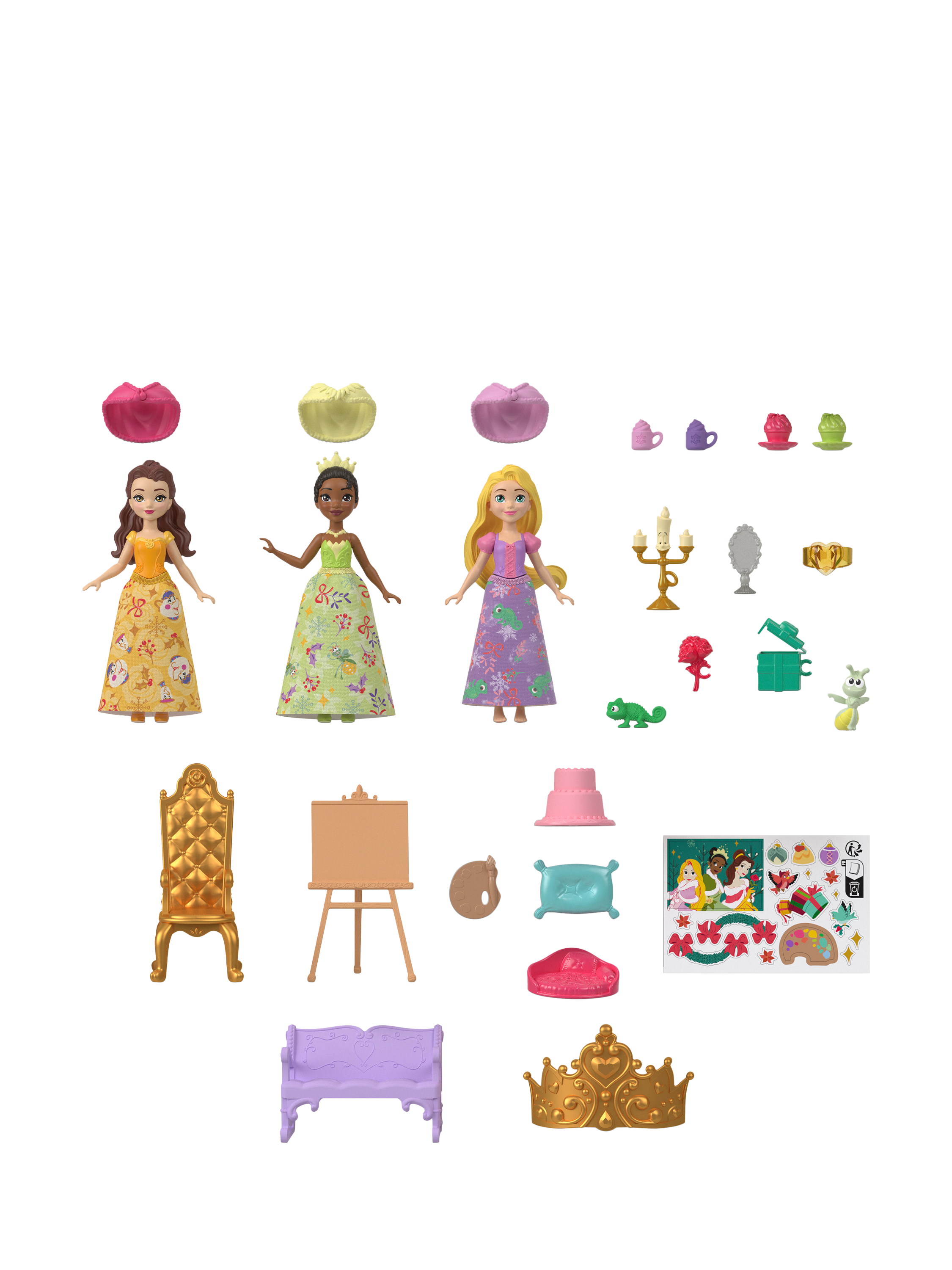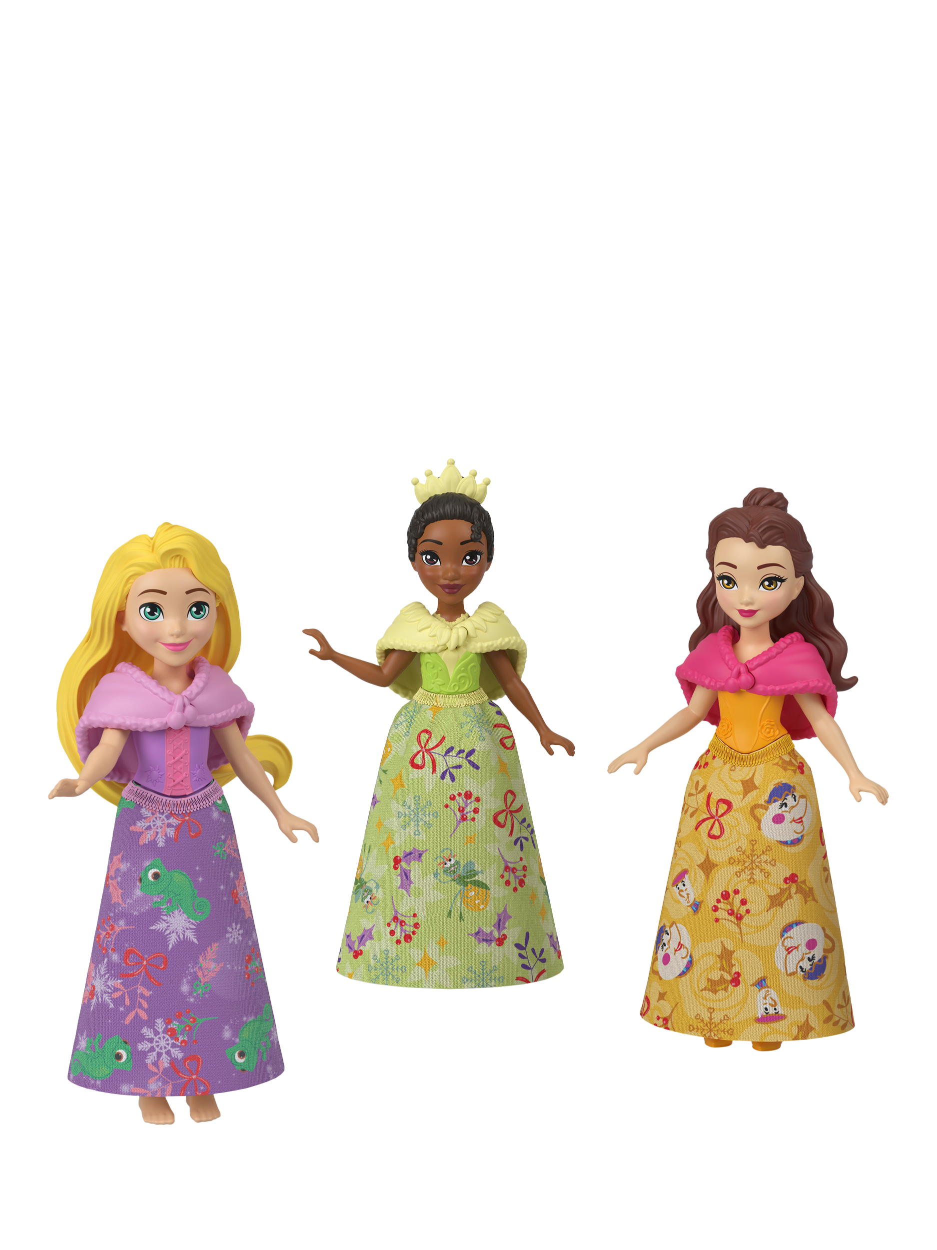 Gifts include three Disney Princess small dolls in holiday-themed fashions, three beloved character friends, 22 accessories and a festive scene with additional pop-out play pieces from the package.