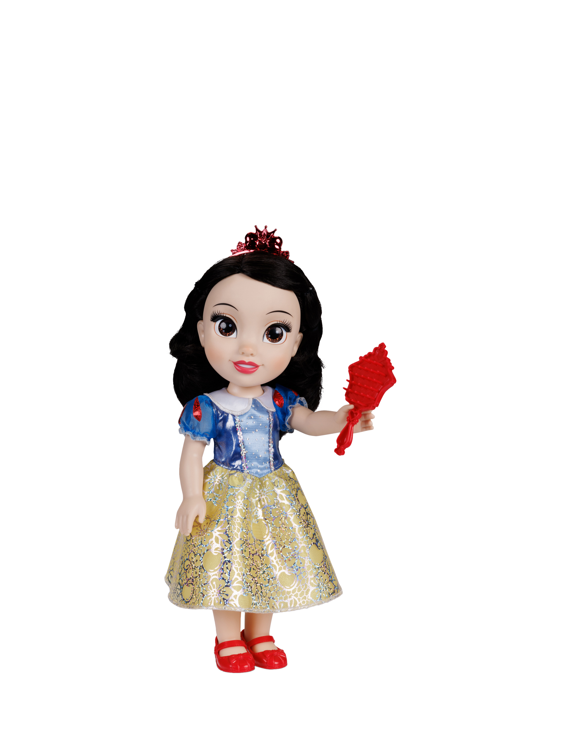 Inspired by Disney's Snow White, this beautiful fashion doll features a platinum holofoil print skirt embellished with flowers and apples that glimmer in the light. She has shimmery glitter eyes, a removable princess outfit, a princess tiara, easy-on, easy-off shoes and a brush to style her gorgeous flowing hair.