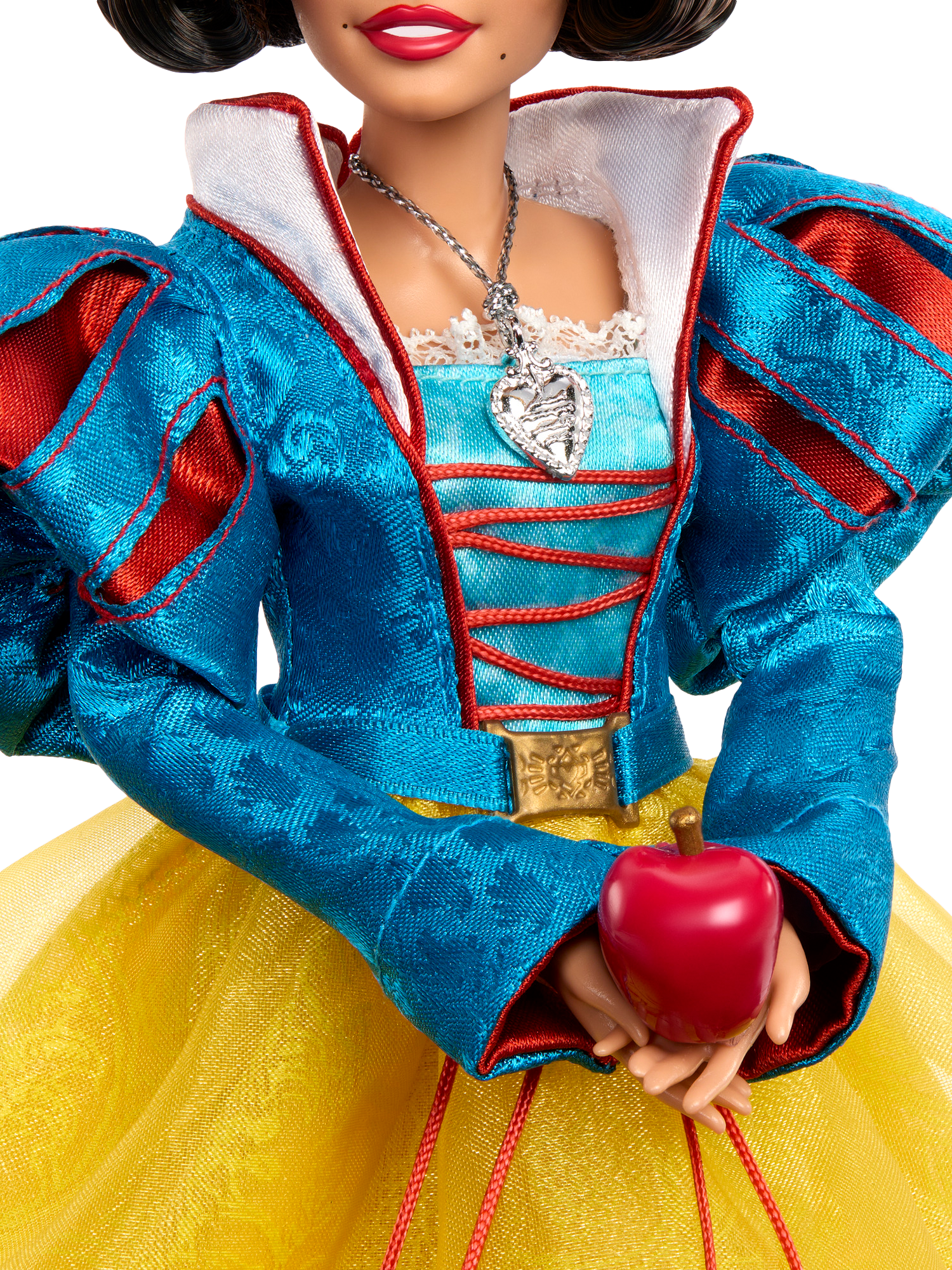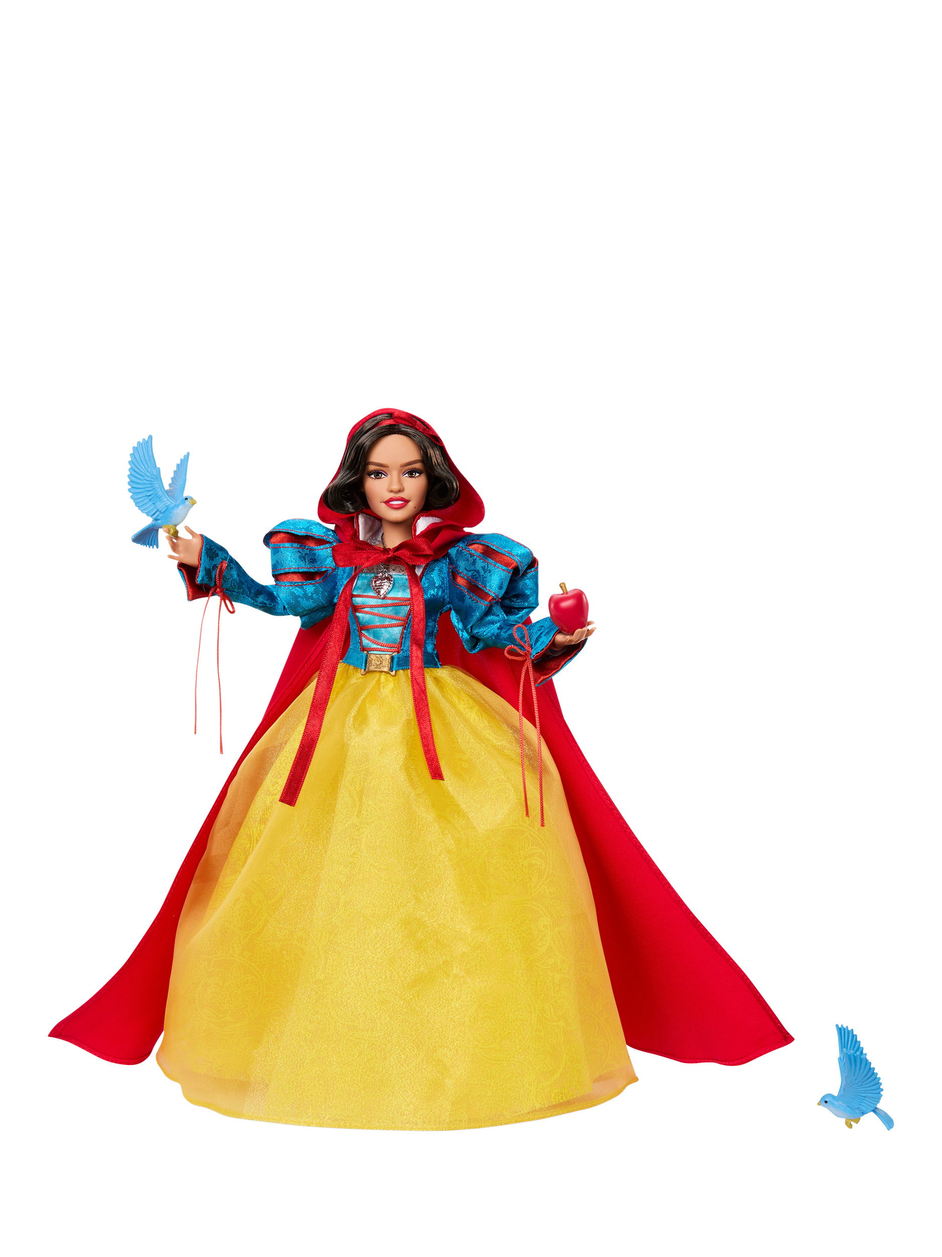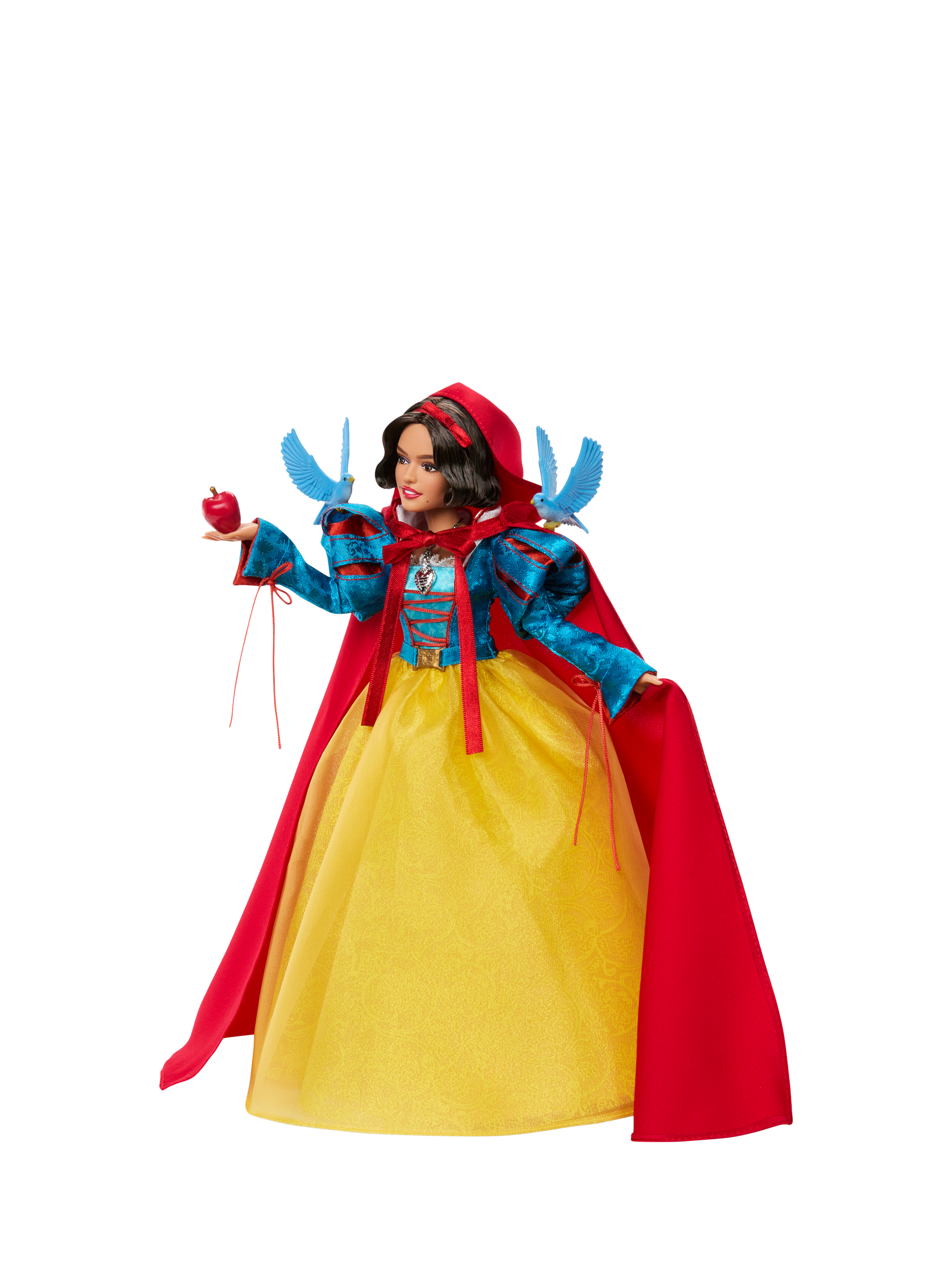 Disney fans of all ages will love this special collector edition Disney Snow White doll, inspired by Disney's 2025 live-action movie. Inspired by the courageous heroine envied by the jealous Evil Queen, Snow White doll's stunning look features a yellow satin and sheer layered skirt, a red charmeuse hooded cape and signature red lips and headband.
