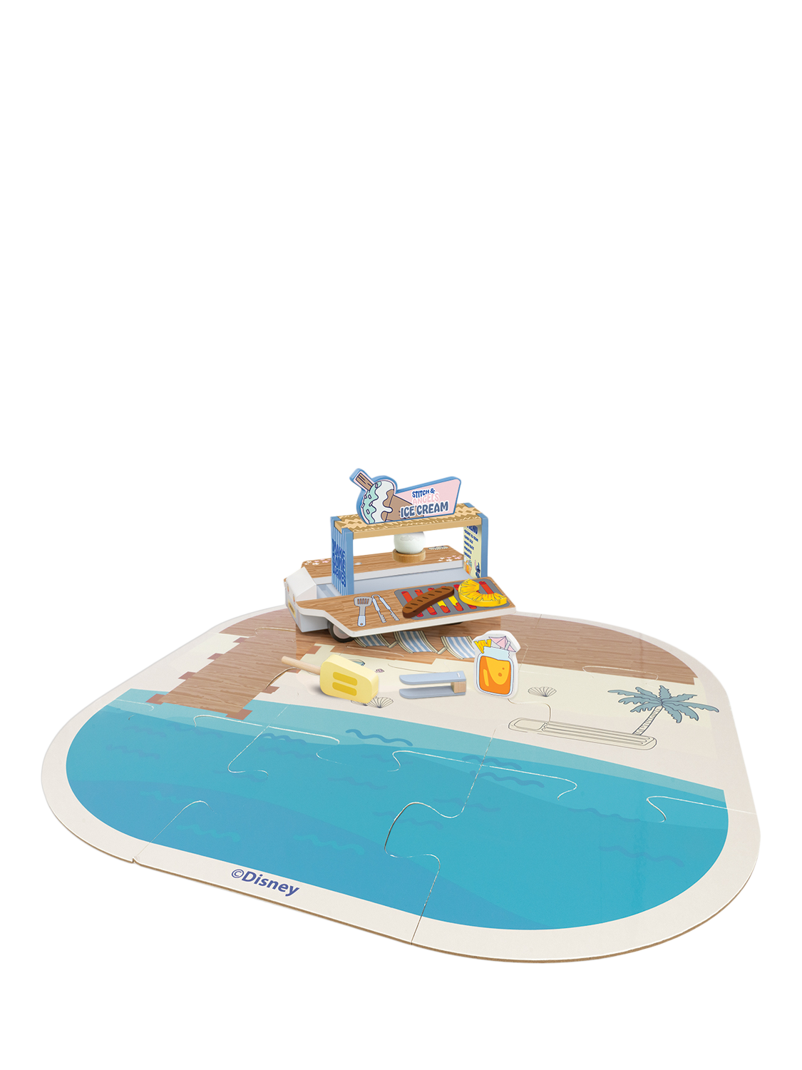 This vibrant vehicle opens to reveal an exciting beach shack playset complete with a puzzle playmat showcasing the ocean and sandy shore. Kids can dive into imaginative play with Stitch and Angel figures, ready to hit the waves on their surfboards. The set includes delightful accessories like wooden ice creams, Ice Lollies, felt sausages, pineapples, and a set of wooden tongs for beachside BBQ fun. Perfect for Stitch fans, this playset combines creative play and adventure, bringing the beach and the fun-loving spirit of Stitch into your home.
