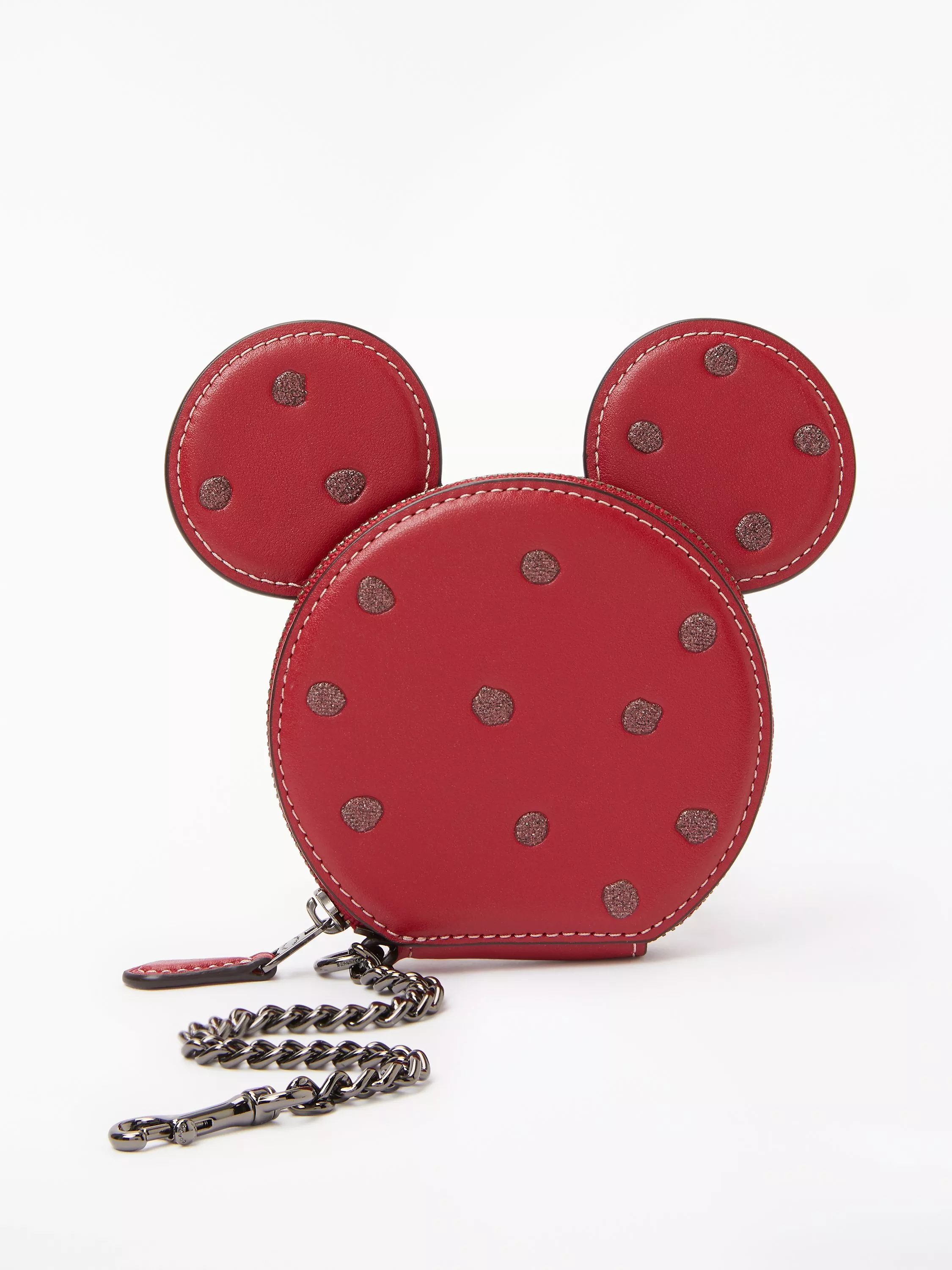 Crafted from supple leather, this cute little purse has Disney's classic mouse head shape and is decorated with pretty glitter spots. It is secured with a zip around fastening and come with a chunky chain with dog clasp that allows you to attach the purse to a handbag or belt loop.