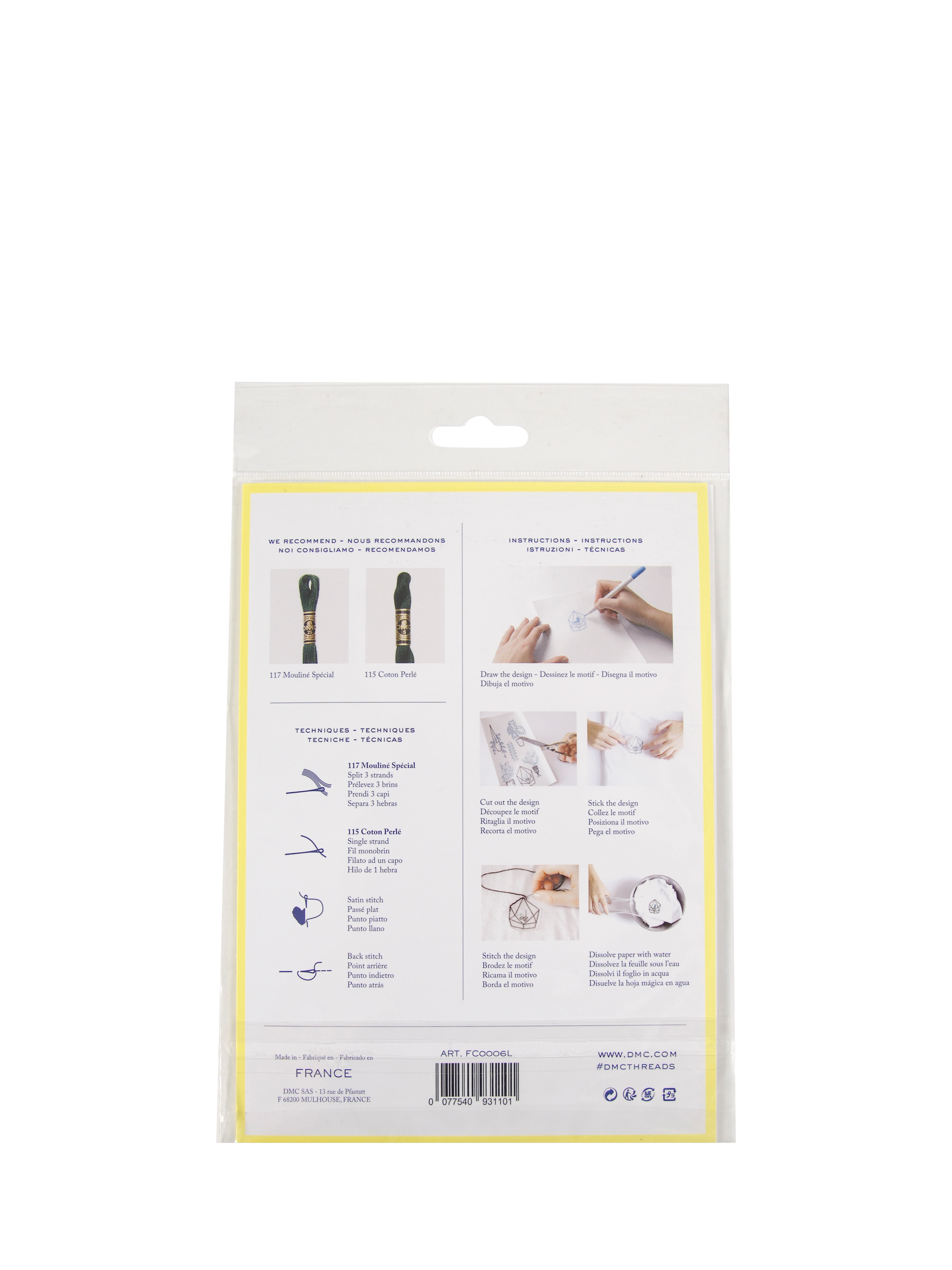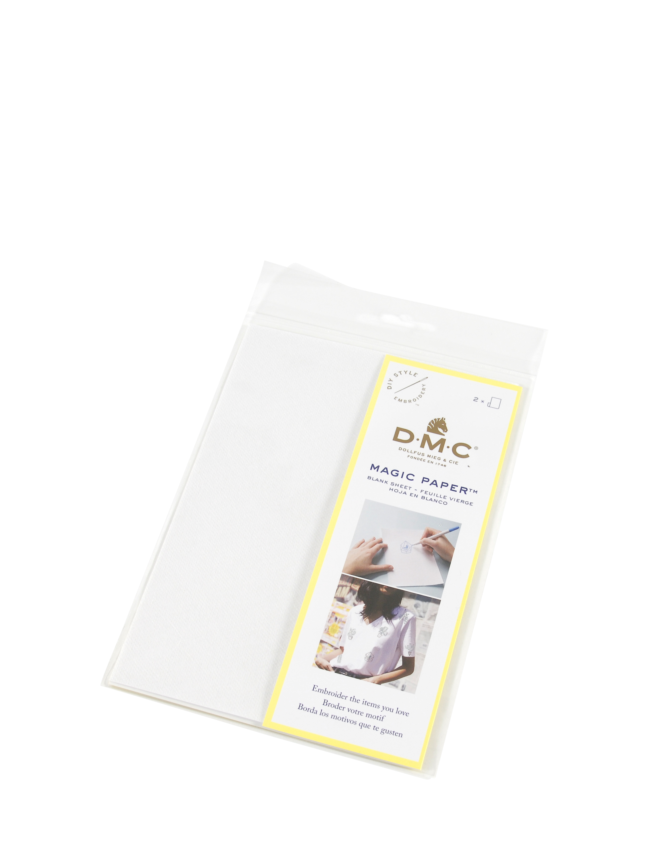 Sketch or trace your design onto the paper, cut it out, peel off the backing and stick onto your fabric. Once you are happy with the positioning, stitch through the soft fabric-like transfer paper using the printed design to guide you. Once you’ve finished stitching, a quick rinse under water for a few seconds will completely dissolve the Magic Paper leaving behind your beautiful needlework.