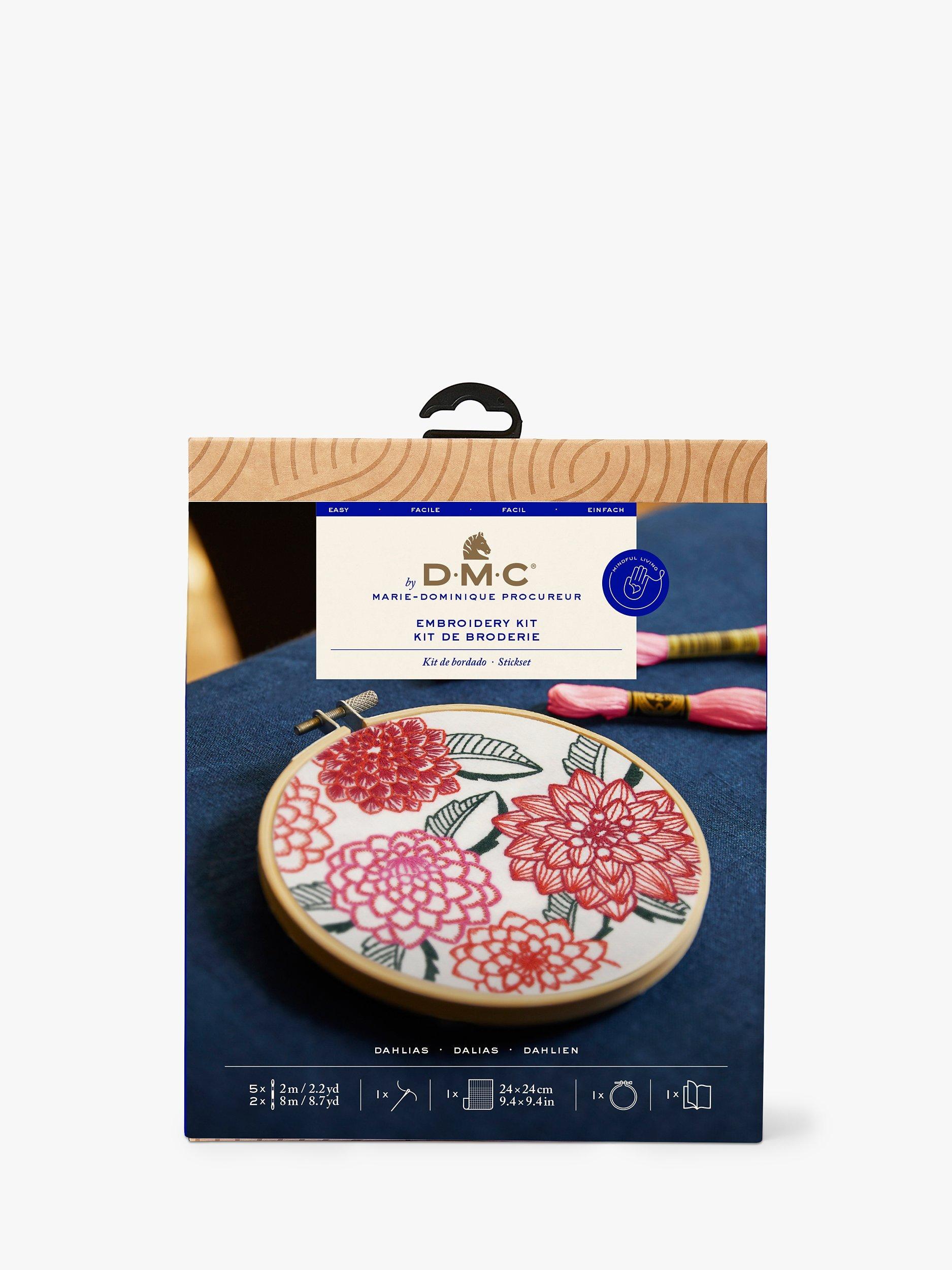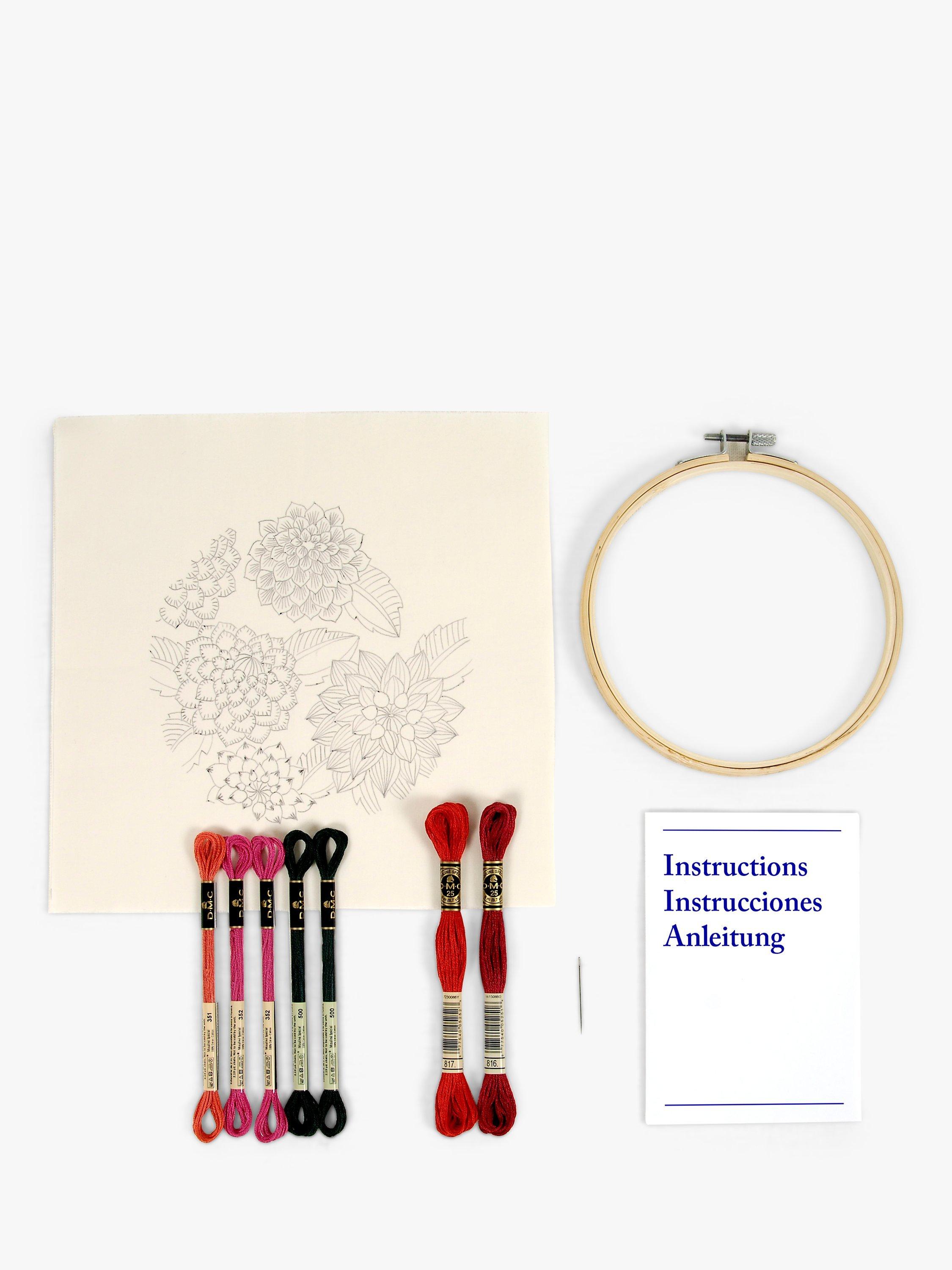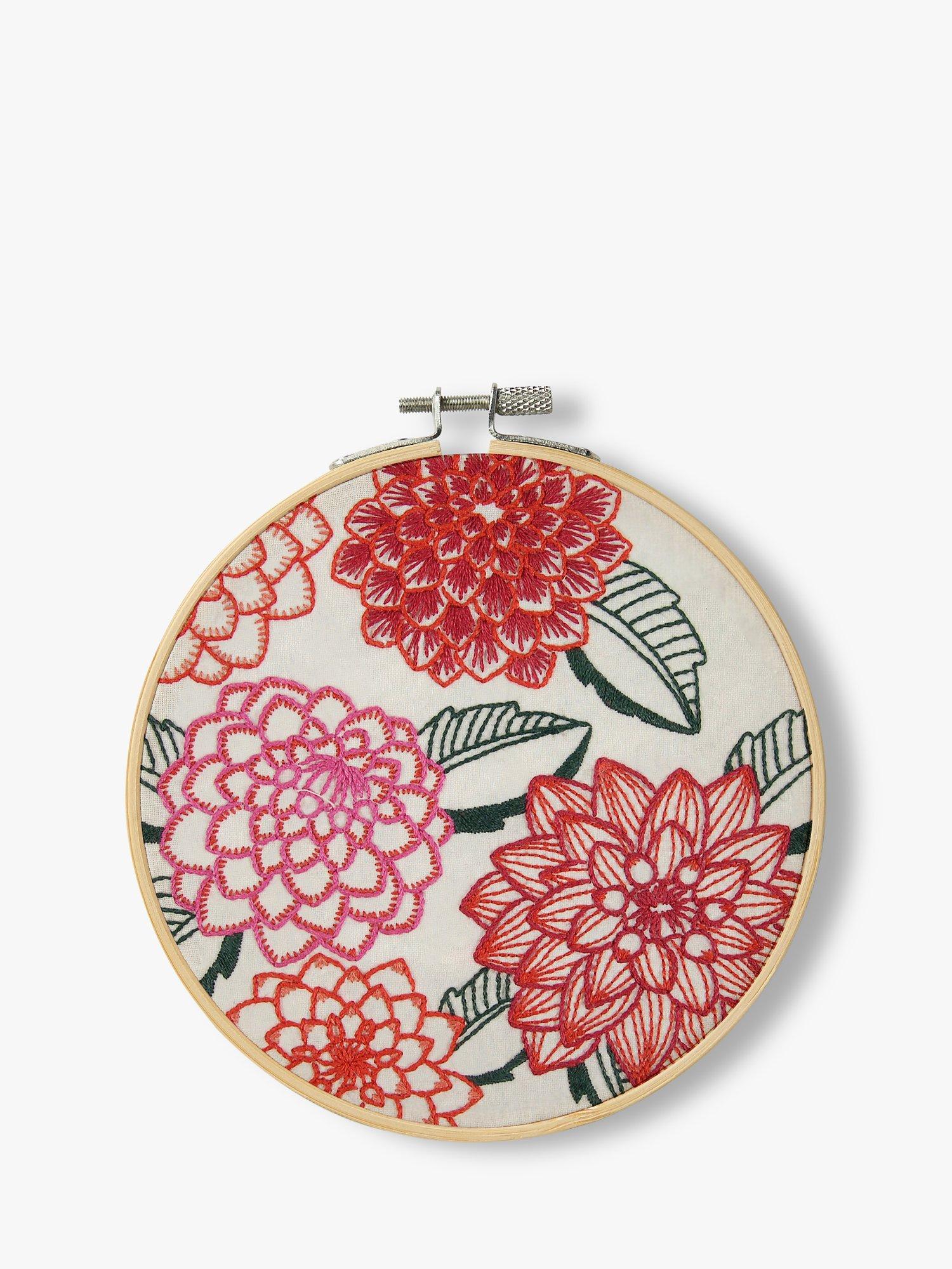 Marie-Dominique Procureur has captured the shapes of the leaves and petals using a combination of straight, back, stem and satin stitch in bold reds and pink threads. You can use the hoop contained in the kit to display your completed needlework.
