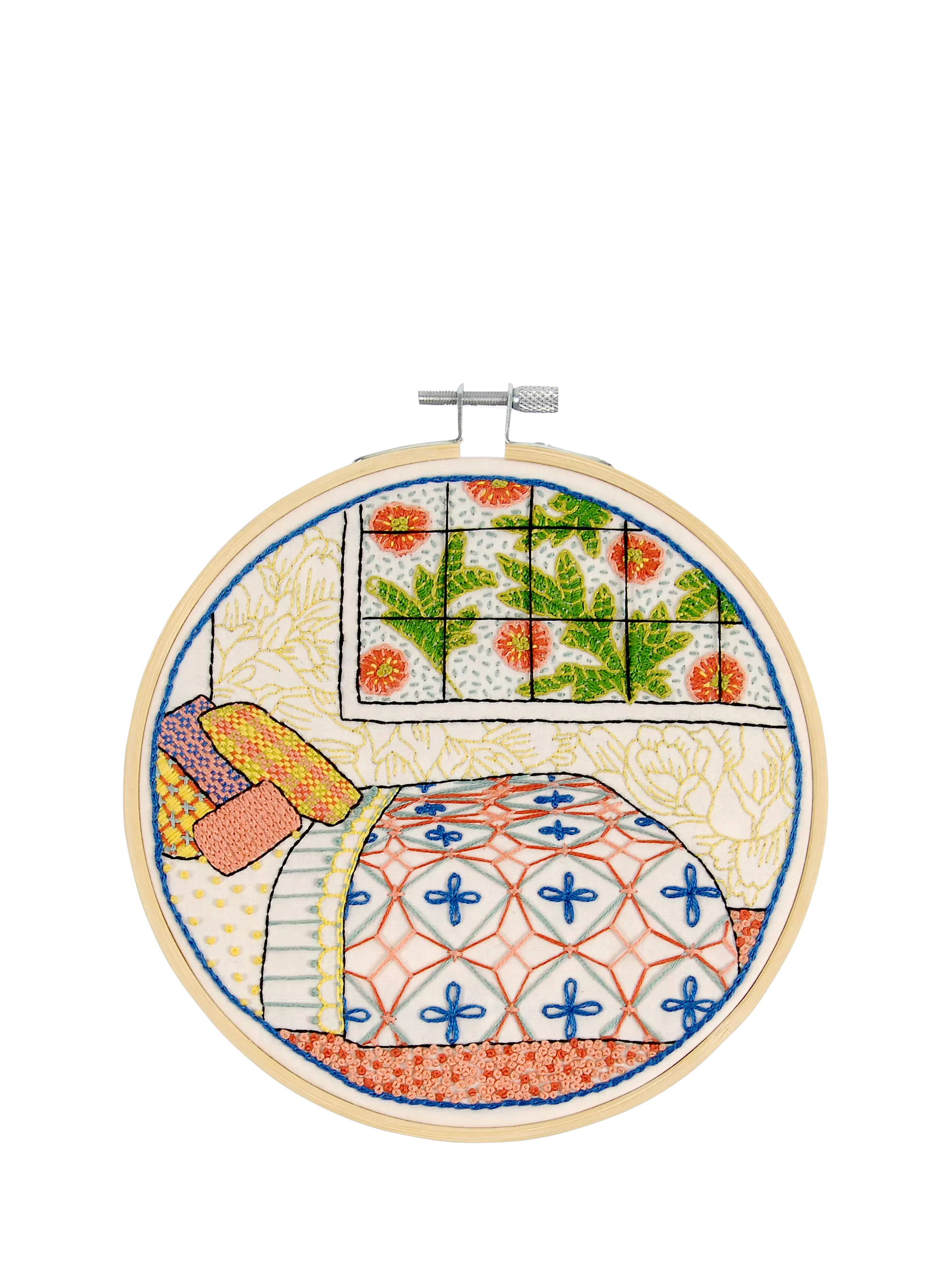Use a selection of stitches to embroider this inviting design from Karin Fast. The different textures and layered prints create a homely bedroom scene.