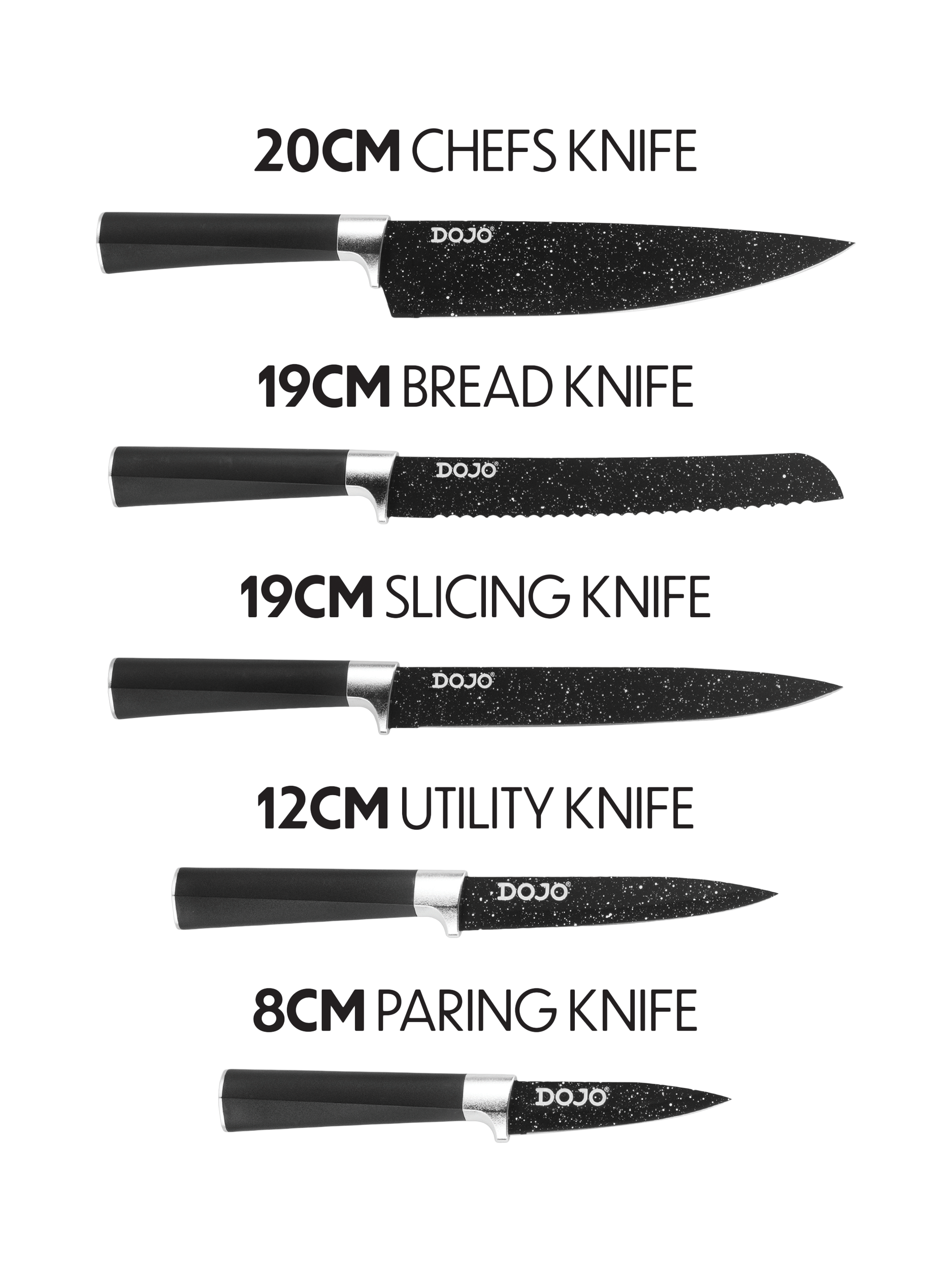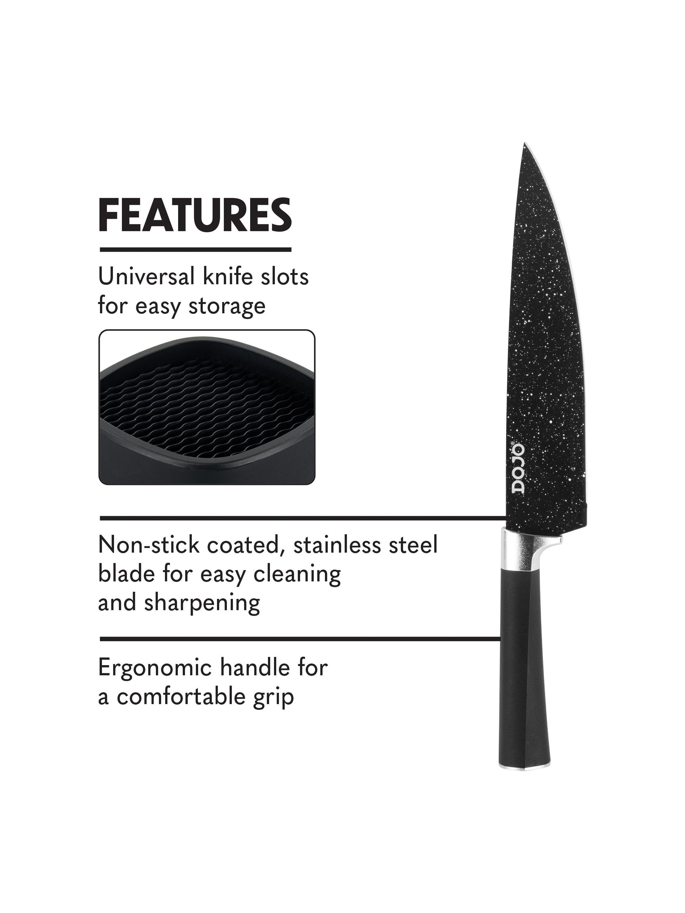 Make chopping, slicing and dicing a breeze with the Dojo 5-Piece Knife Block Set. Designed for everyday use, this sleek set includes five different knives for a wide range of kitchen tasks.