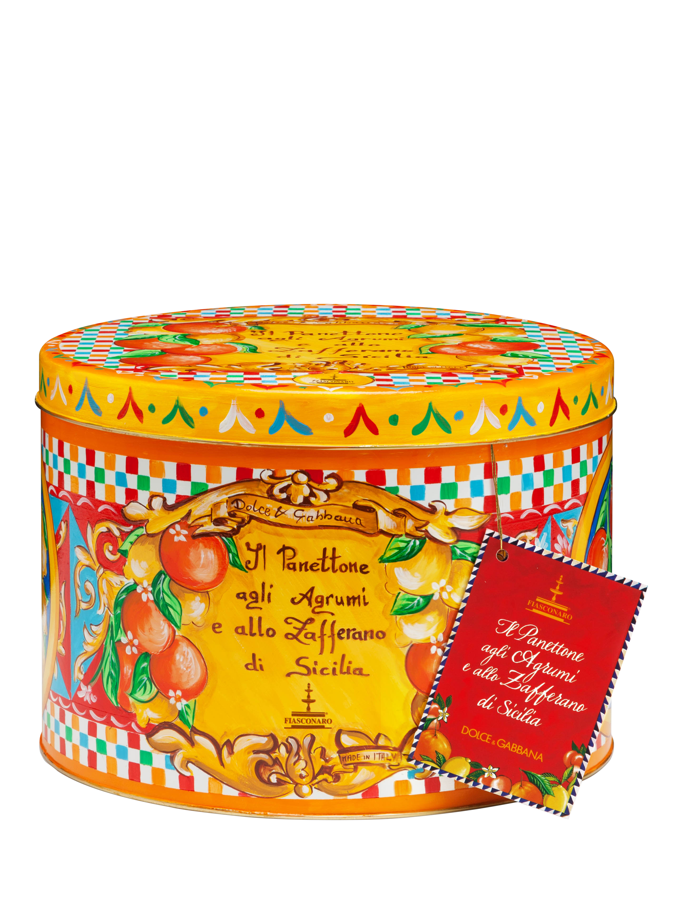 Panettone cake with Sicilian candied citrus and saffron, without raisins. Presented in an elegant tin designed by Dolce & Gabbana.