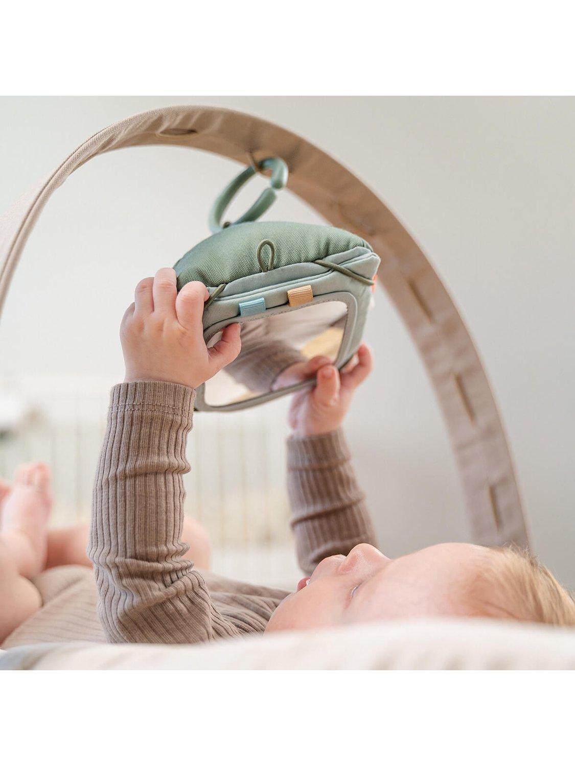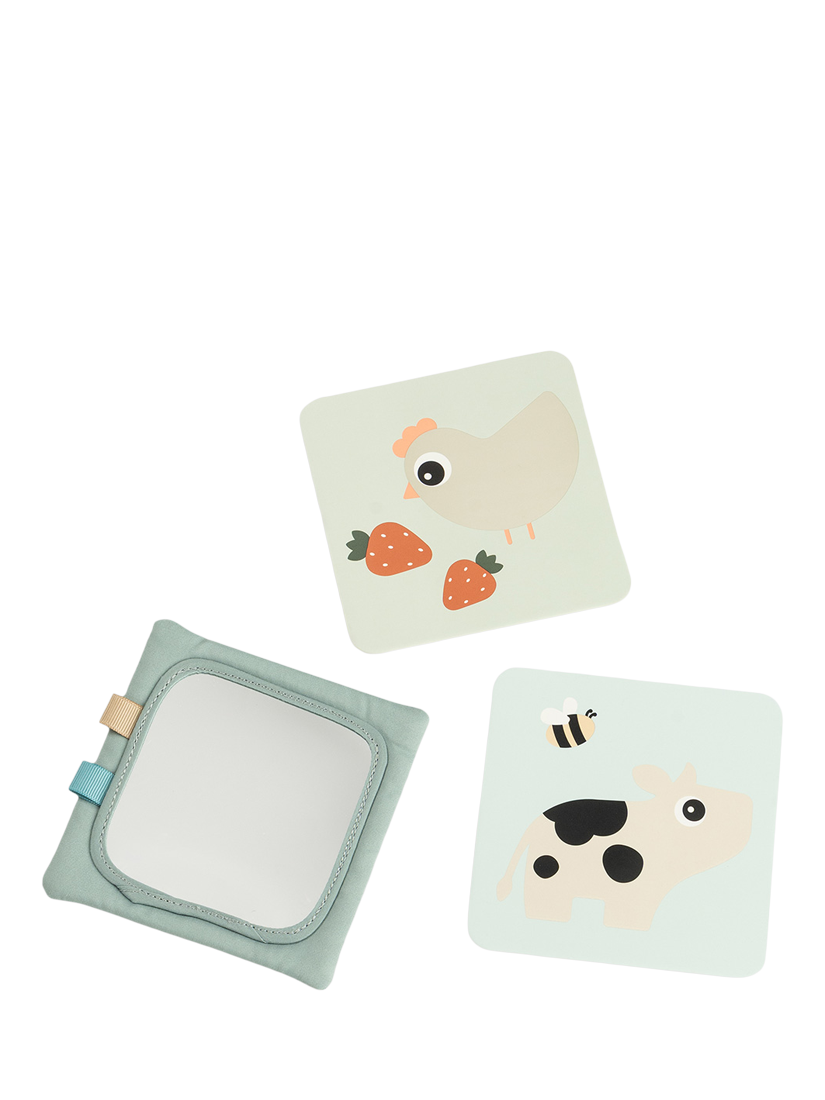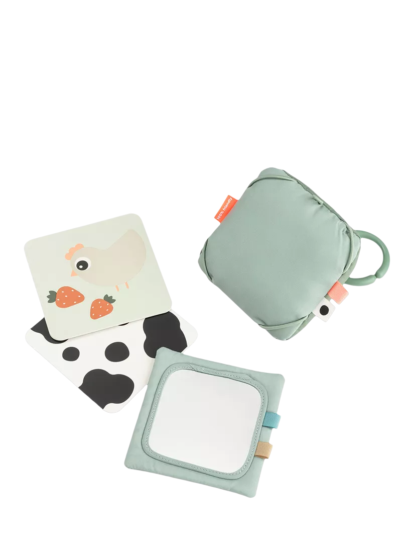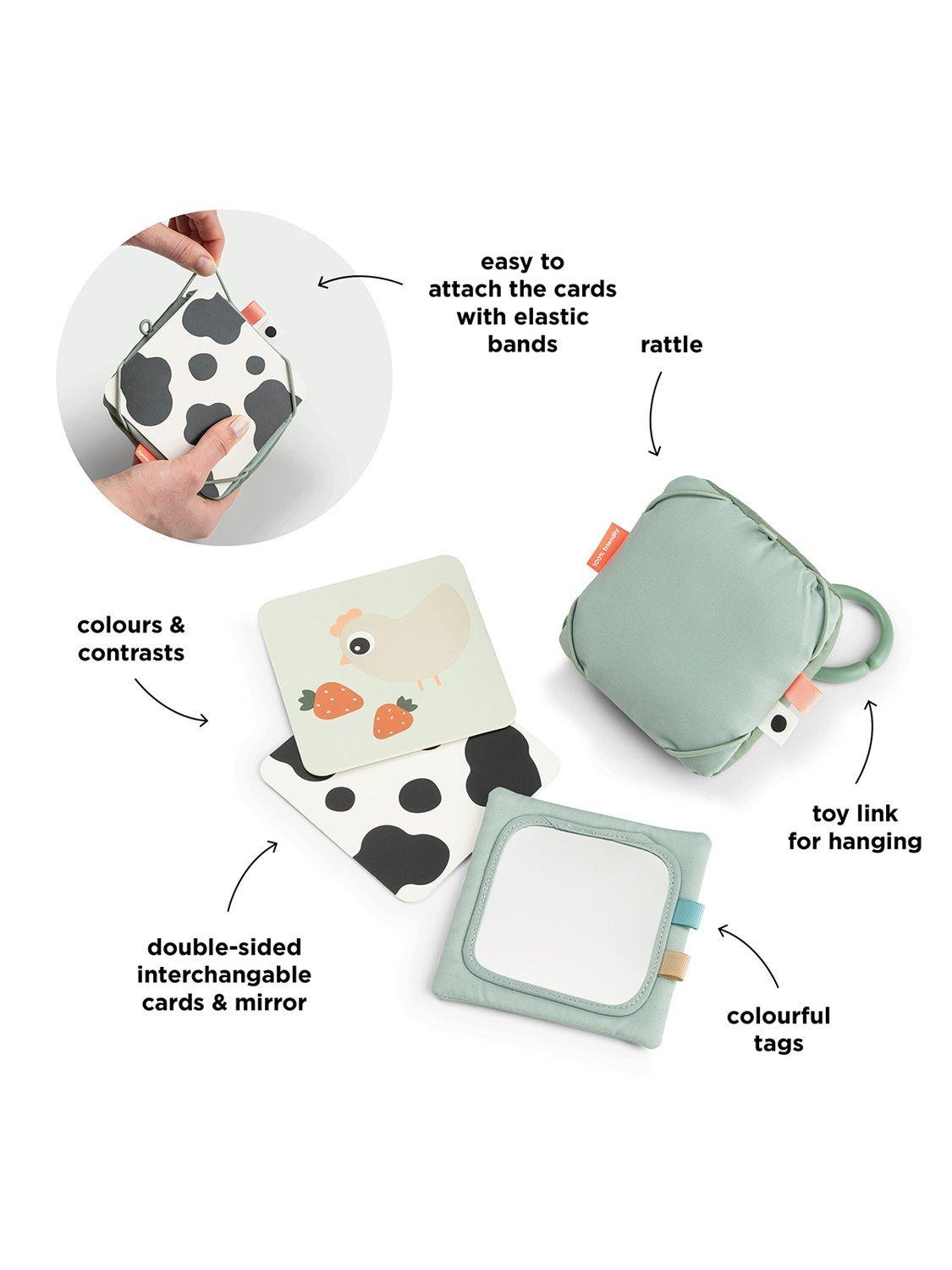 Introducing your baby to visual exploration, this textile card holder is suitable from birth, fostering newborns' sight development. The customisable frame allows personalisation by adding your own picture or drawing. Included features, like a mirror and two double-sided farm-themed cardboard contrast cards, provide varied visual stimulation. Versatile in use, hang it from an activity gym, playmat, or place it on the floor for engaging tummy time.