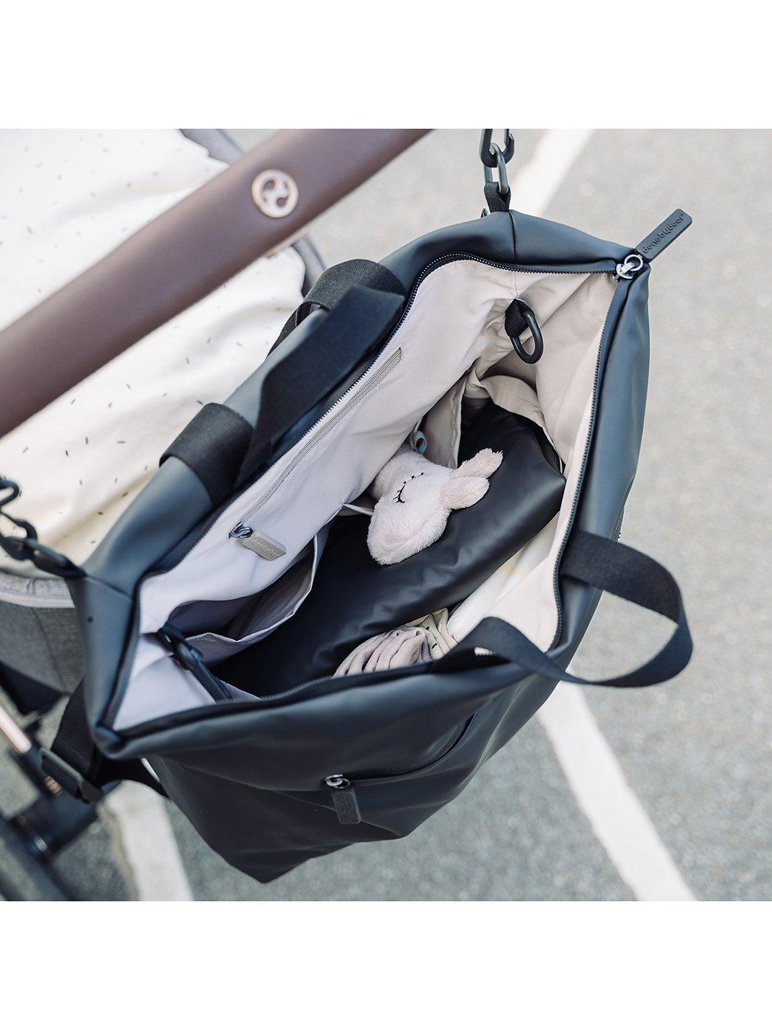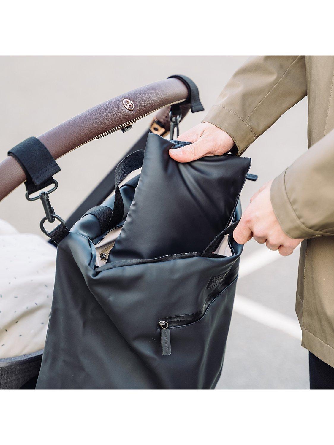 Adjustable shoulder and sternum straps allow you to adjust the fit for comfortable carrying. A foldable changing mat with a waterproof surface and two pram/stroller hooks are included. Both the waterproof zippers and surface make it weatherproof. It's not 100% waterproof and may let in water around the zip areas in very wet conditions.