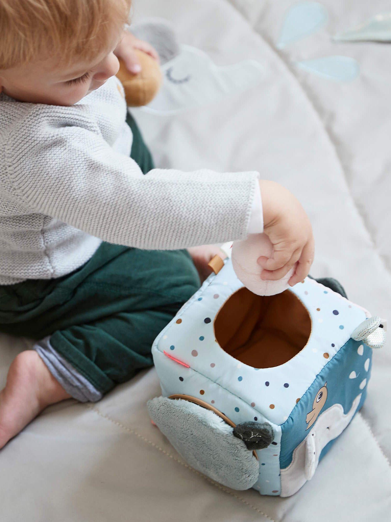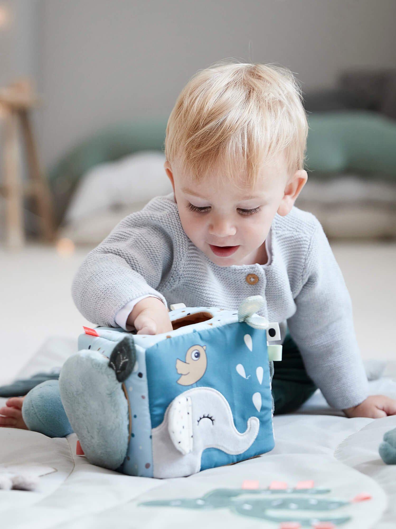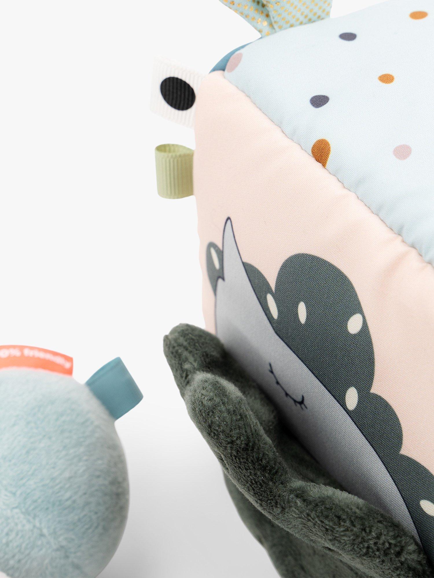 The discovery cube with the Deer friends is a fun and educational toy for babies and toddlers. Enjoy the many sensory activities and stimulating features and the cute Deer friends in soft colours. Leaves that crinkle, a soft baby mirror and Croco hiding behind the door are just some of the cool features of this cube. Hide your own treasures inside the cube or use the three squeezable rattle balls in cute colours that are included. The fun activity cube is printed with Deer friends and sprinkled with colourful happy dots.