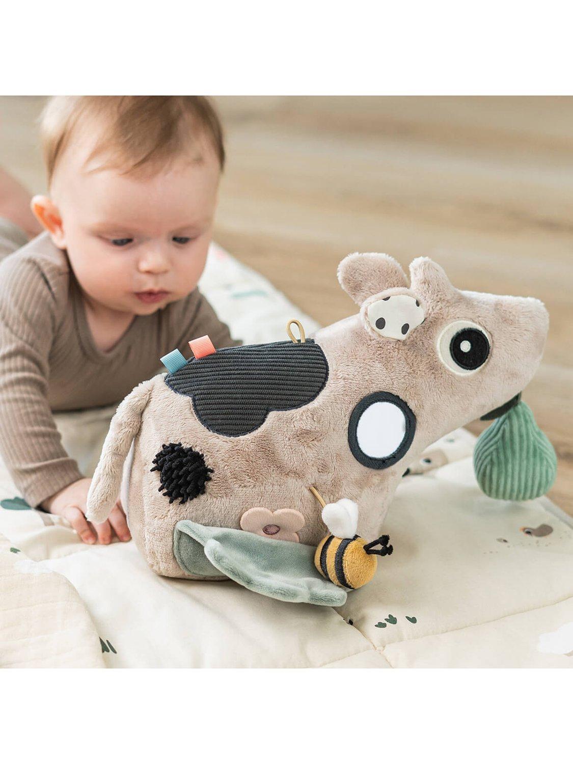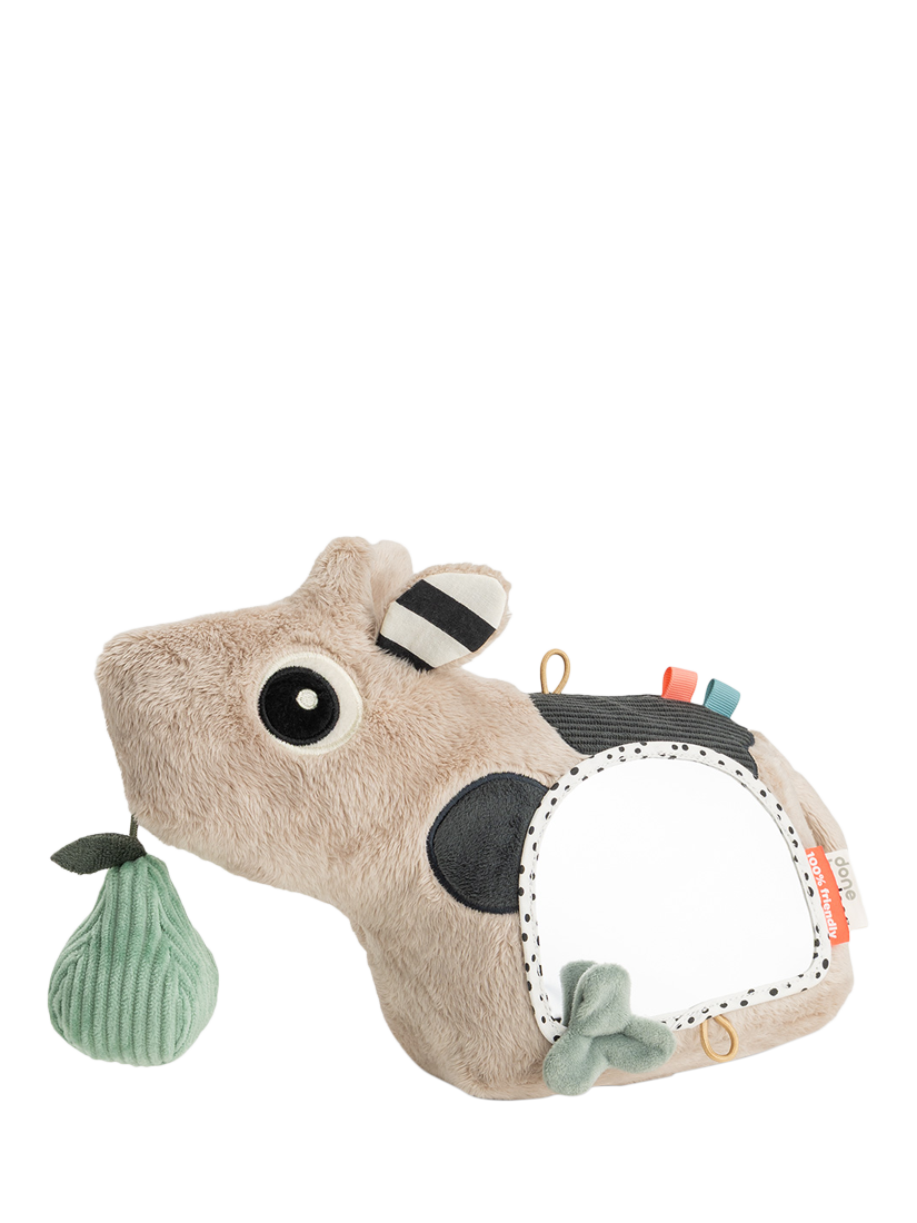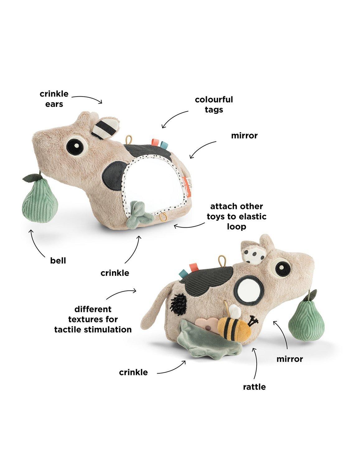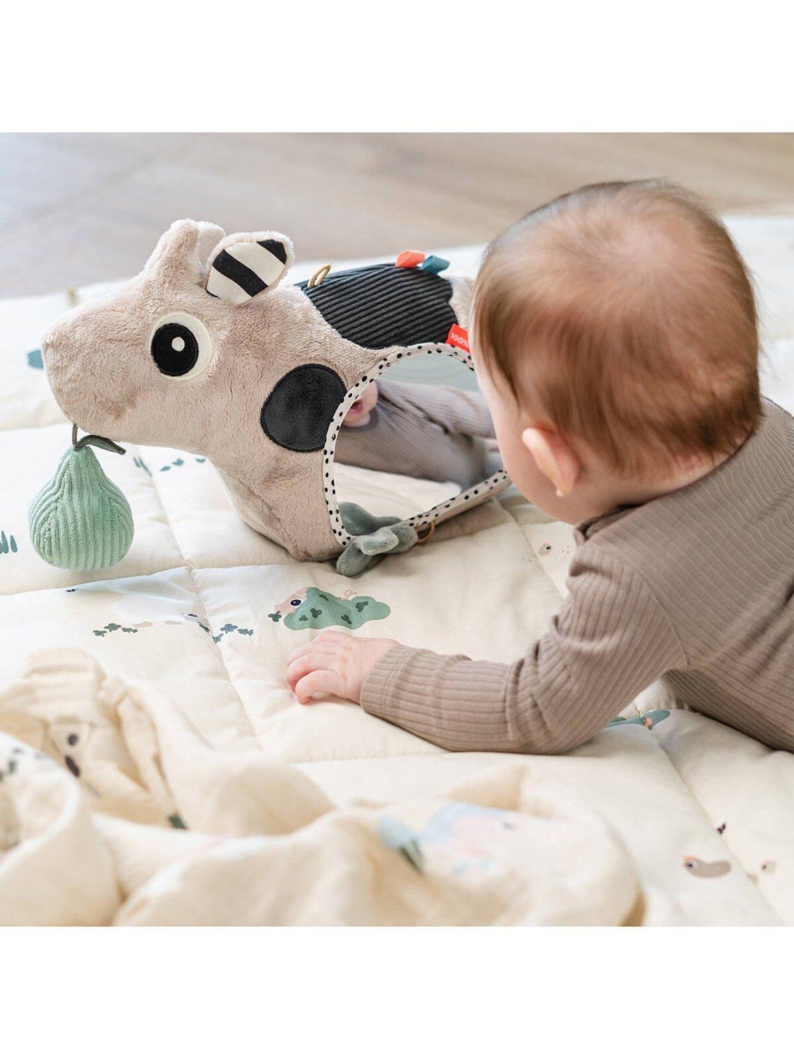 An adorable first toy with many interactive details that will encourage little ones to reach, grasp and explore. The Dotti activity floor mirror supports sensory development through tactile, auditory and visual stimulation, and the mirror supports curiosity and early self-recognition. This activity floor mirror can be used as a key stage to engage in tummy time development or later, when sitting up during floor play.