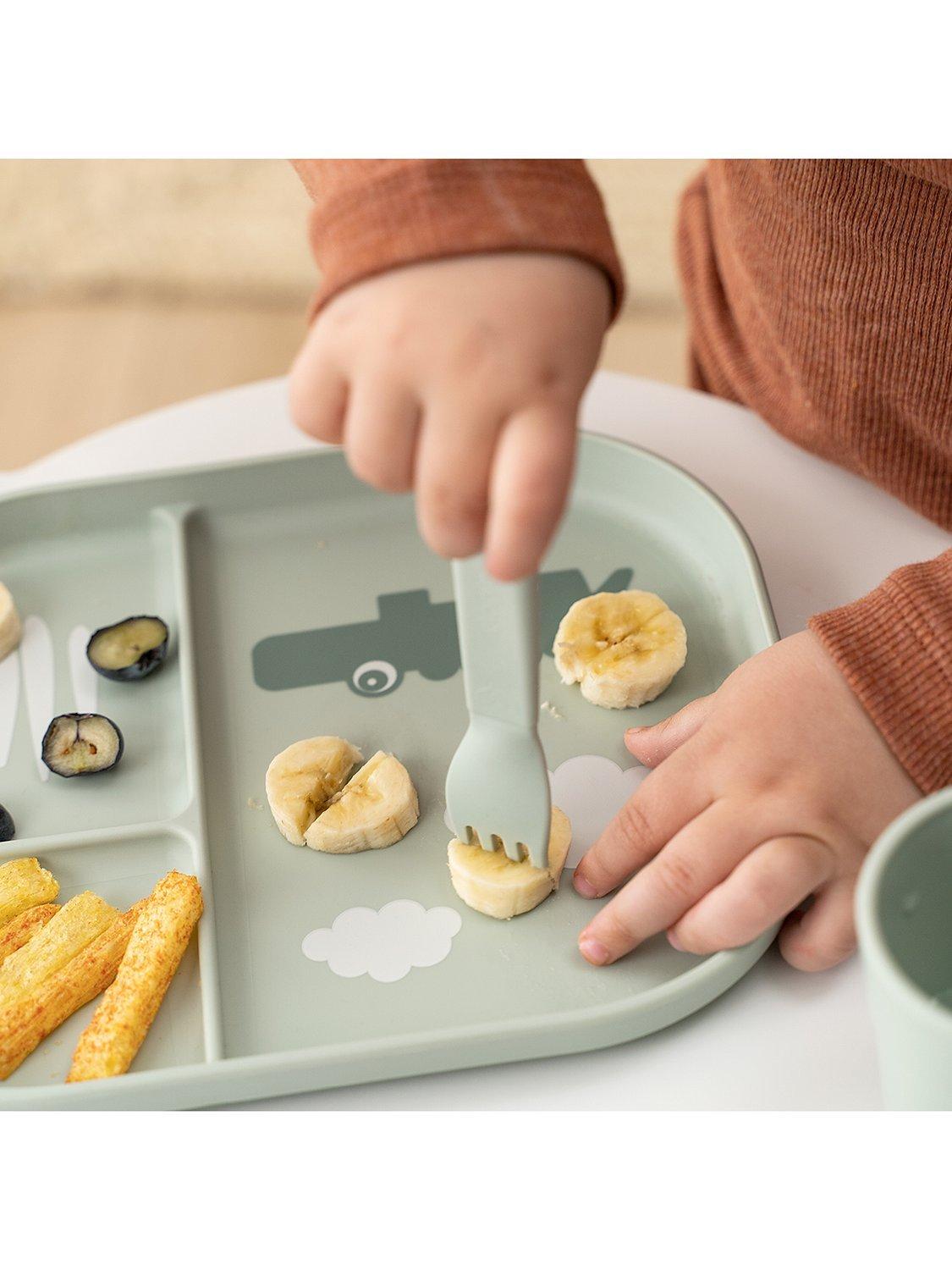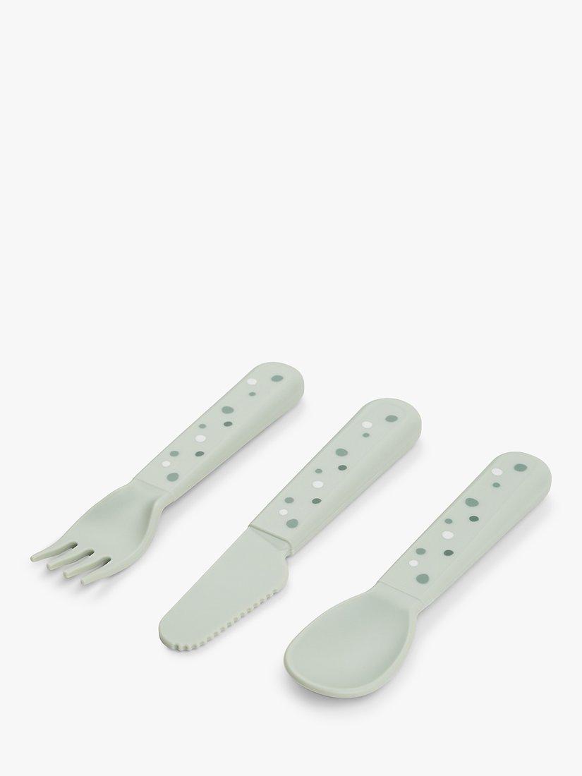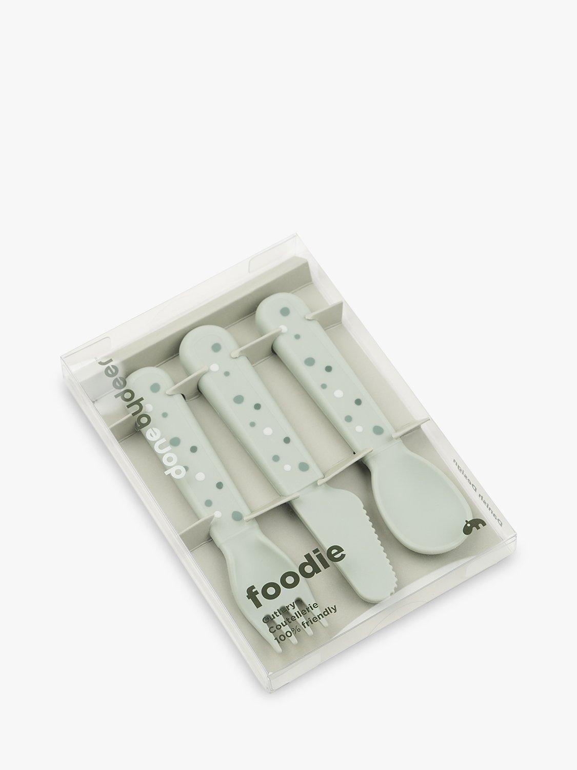 The Foodie cutlery set has soft, rounded edges making them safe for little ones practicing eating on their own. The cutlery fits perfectly into small hands and has been thoroughly tested by kids. The cute cutlery set for babies and toddlers consists of a spoon, fork, and knife. Once the cutlery has served its purpose through countless family dinners, it can be sorted as plastic and recycled into new everyday life products. The cute green cutlery set covered with playful Happy dots will brighten up any meal. Its silky matt surface matches the rest of the Foodie collection.