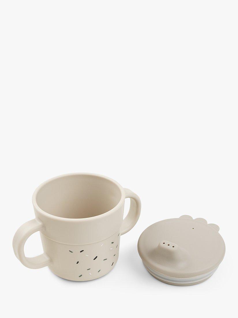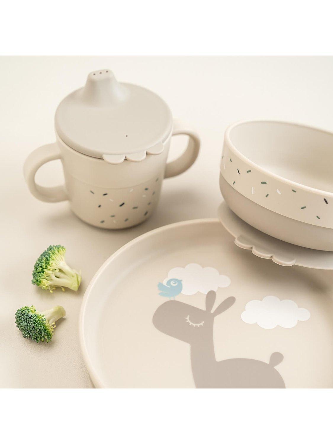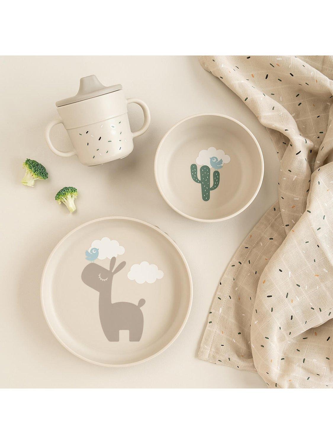 The dinner set has a cute print. The plate has a motif of Lalee and Birdee and the bowl is with Birdee on a cactus. Confetti has been sprinkled on the bowl and 2-handle spout cup.