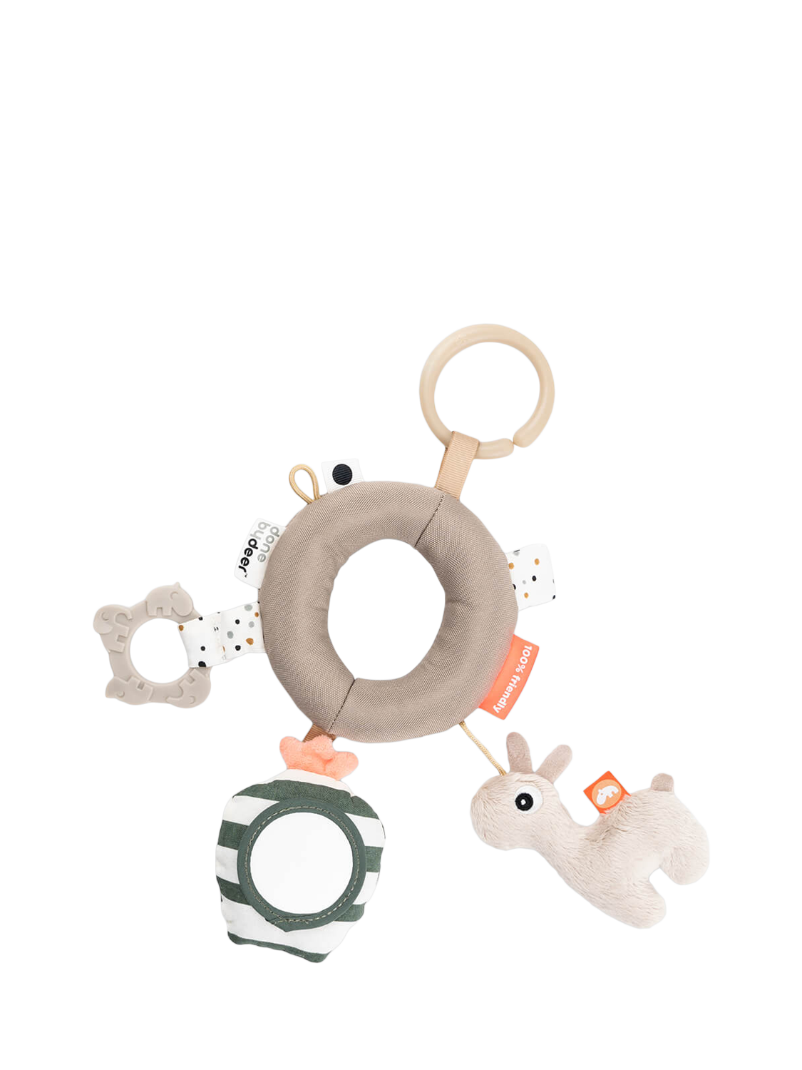 The activity ring will encourage babies to be curious and investigate the sensory features - a soft teether for itchy gums, a mirror with rattle, a softly textured Lalee, crinkle sounds and fun tags. Easy to grasp and hold for little fingers with an elastic loop to keep a pacifier or another toy close by. Can be attached to a play mat, stroller, car seat or cot.