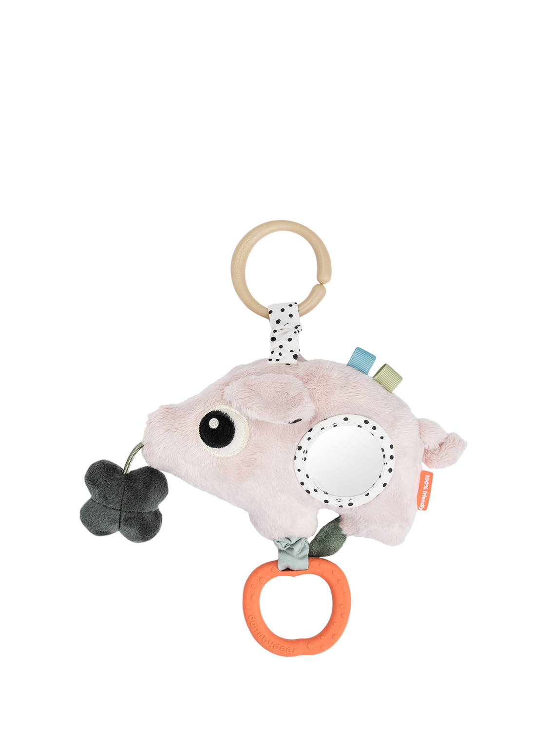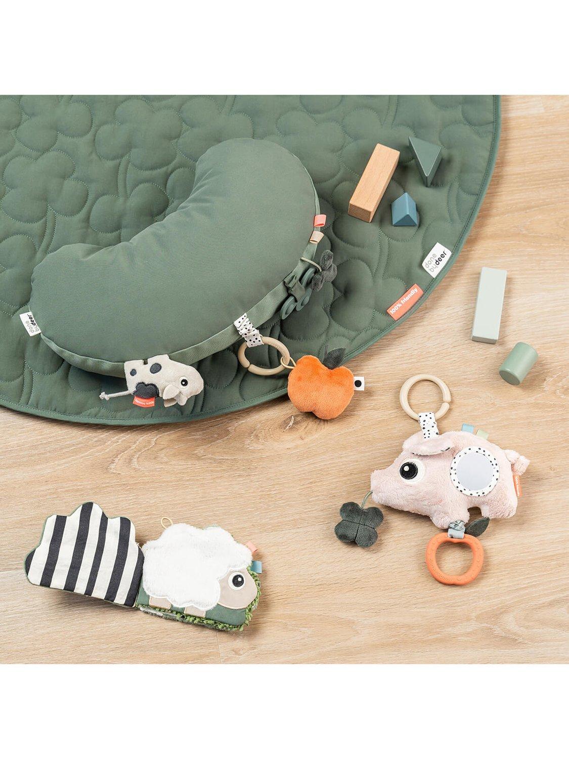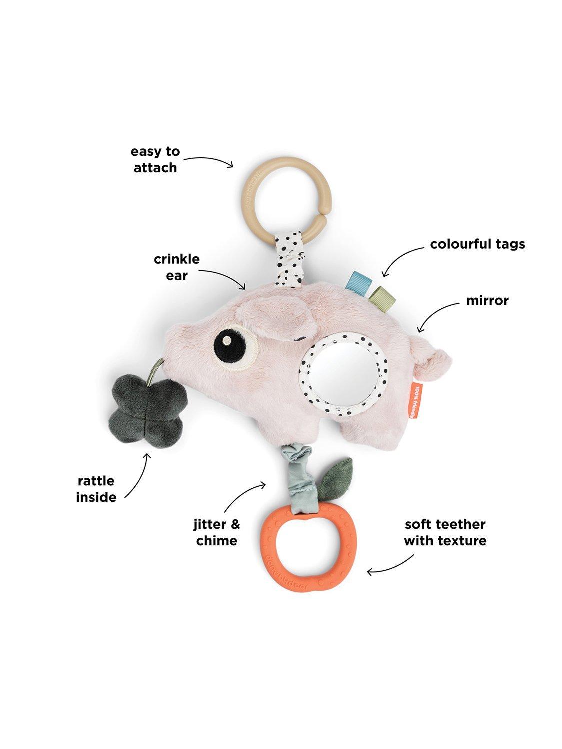 This sensory activity toy is full of exciting features to engage your baby’s senses. With a rattle, chime, and crinkle, it stimulates hearing and touch, while the mirror invites your little one to discover themselves. Pulling the apple-shaped teether activates a fun jitter, adding extra delight to playtime. Made from food-grade silicone, the teether provides soothing relief for itchy gums. Contrasting colours and playful details ensure visual stimulation, while Pigee can be easily attached to a play mat, stroller, car seat or cot.