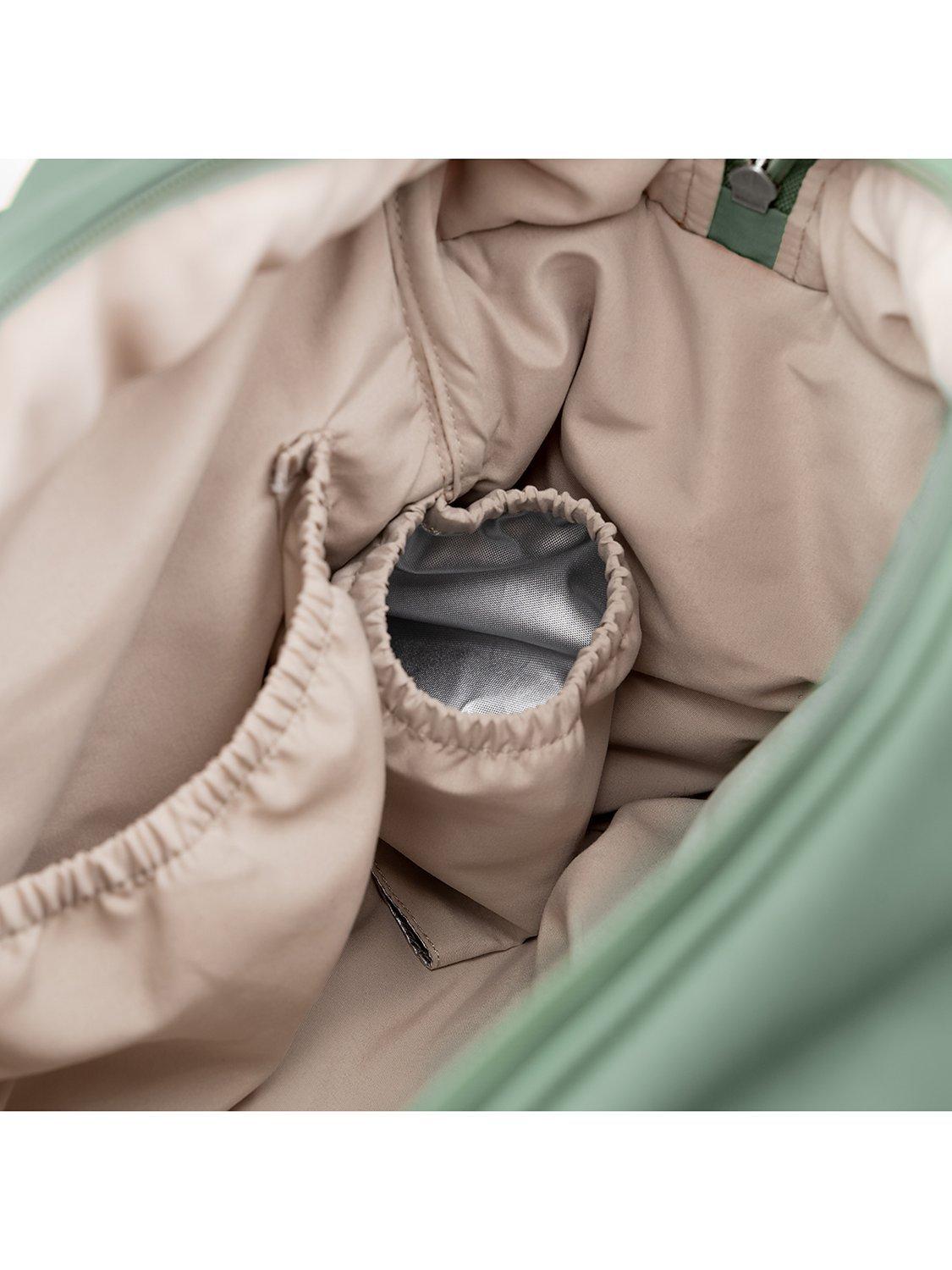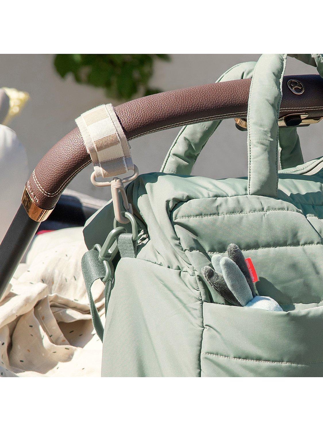 It has pockets both on the inside and outside and an insulated pocket inside to keep fluids hot or cold. The straps on the outside make it easy to attach the bag to your pram. The bag is weatherproof but not waterproof and may let in water around the zip areas in very wet conditions.