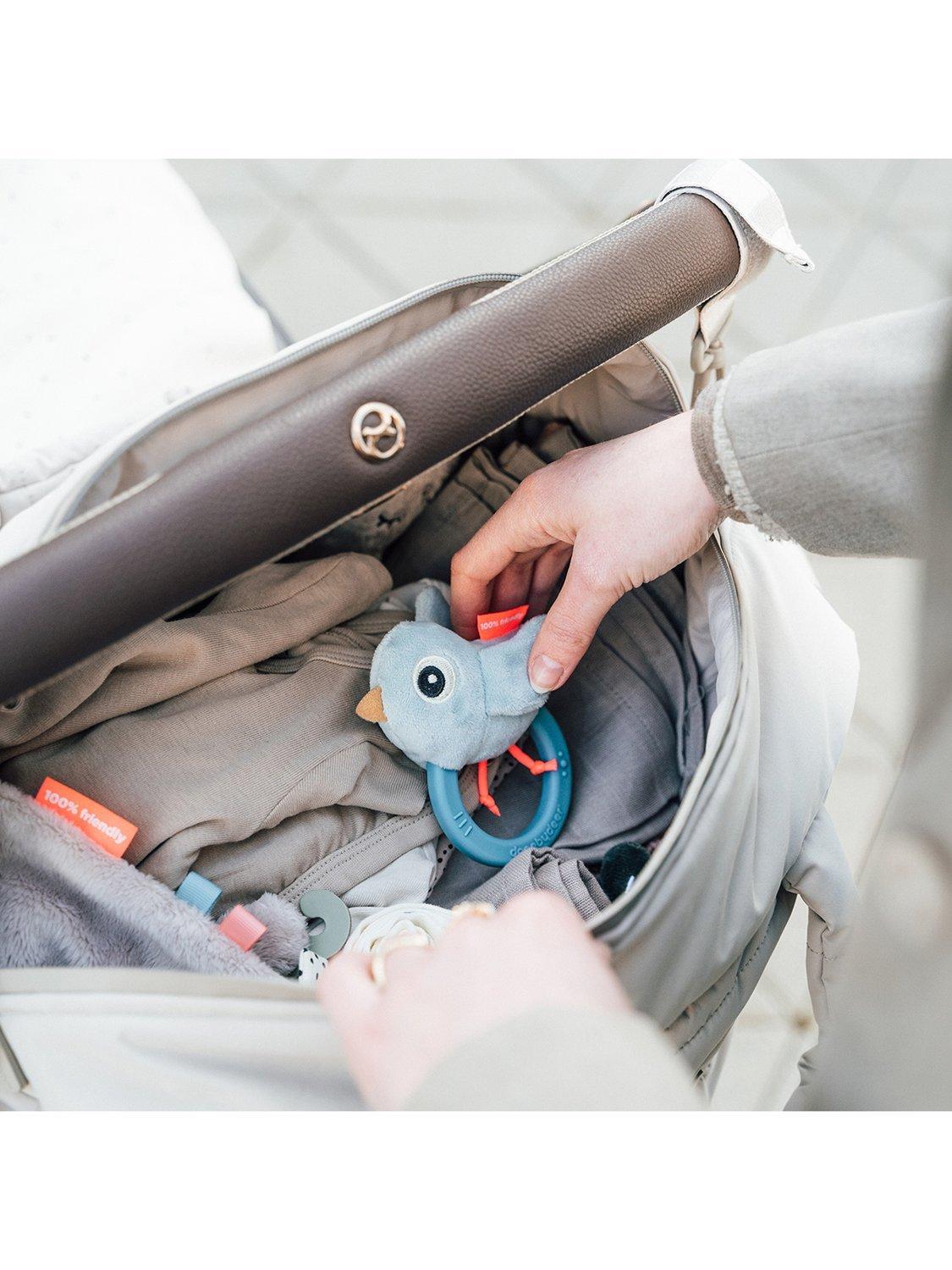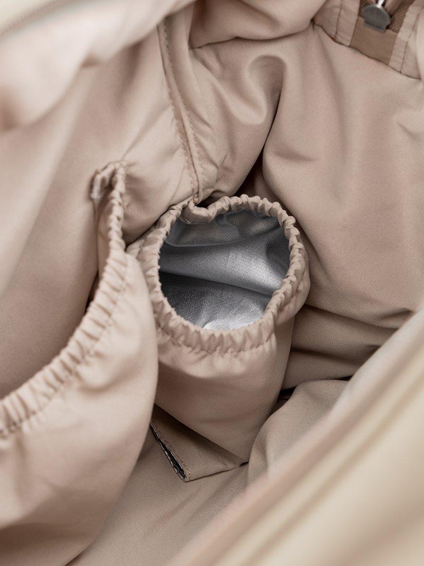 It has pockets both on the inside and outside and an insulated pocket inside to keep fluids hot or cold. The straps on the outside make it easy to attach the bag to your pram. The bag is weatherproof but not waterproof and may let in water around the zip areas in very wet conditions.