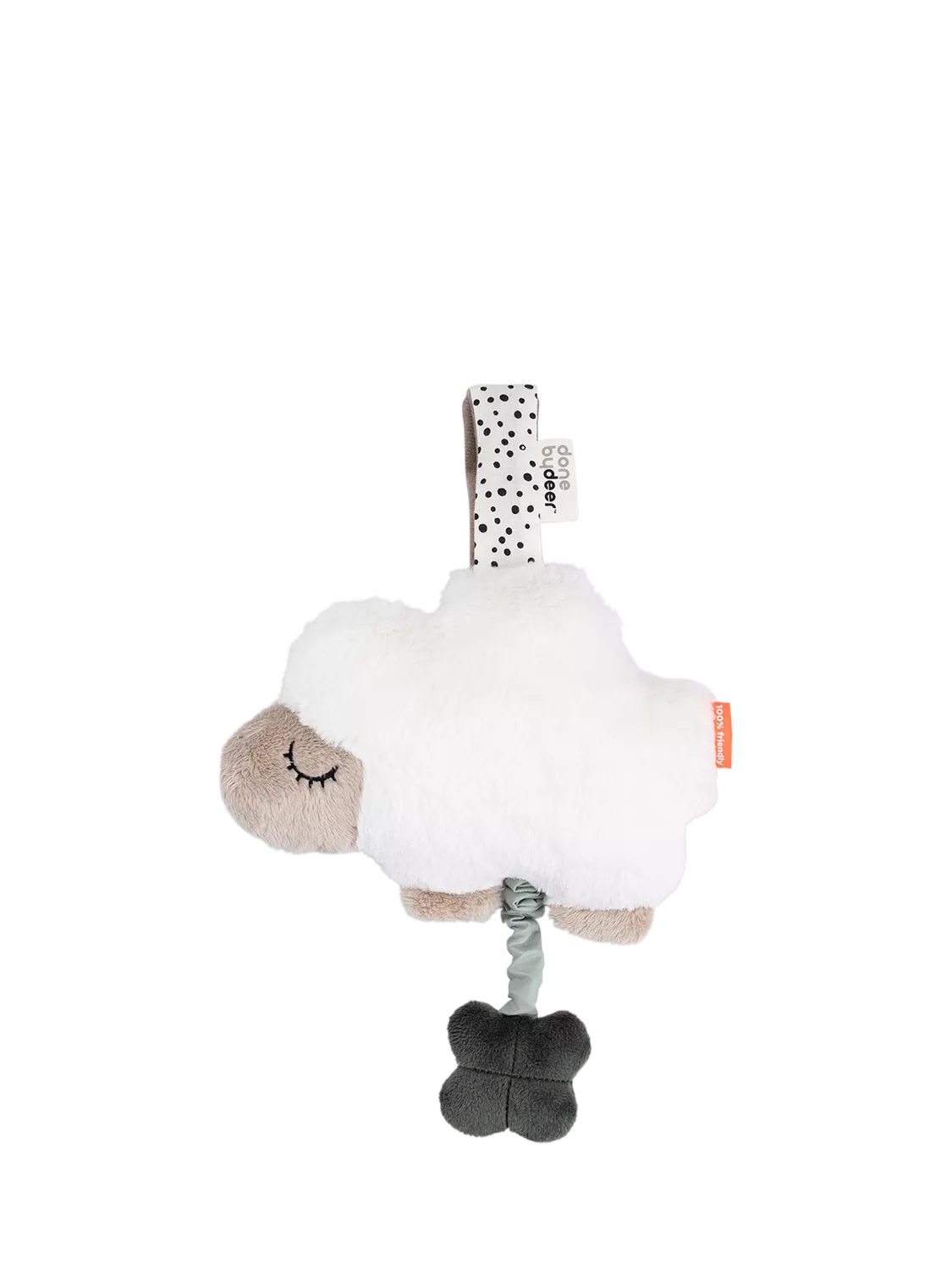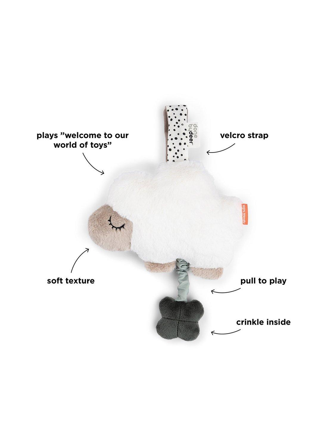 Musical toy to soothe and entertain your little one. Pull the crinkly clover and enjoy the calming tune of 'Welcome to our world of toys', creating a peaceful moment for your baby. With soft colours and contrasting details, it offers visual stimulation, while the cute Sheepy design adds a playful touch.