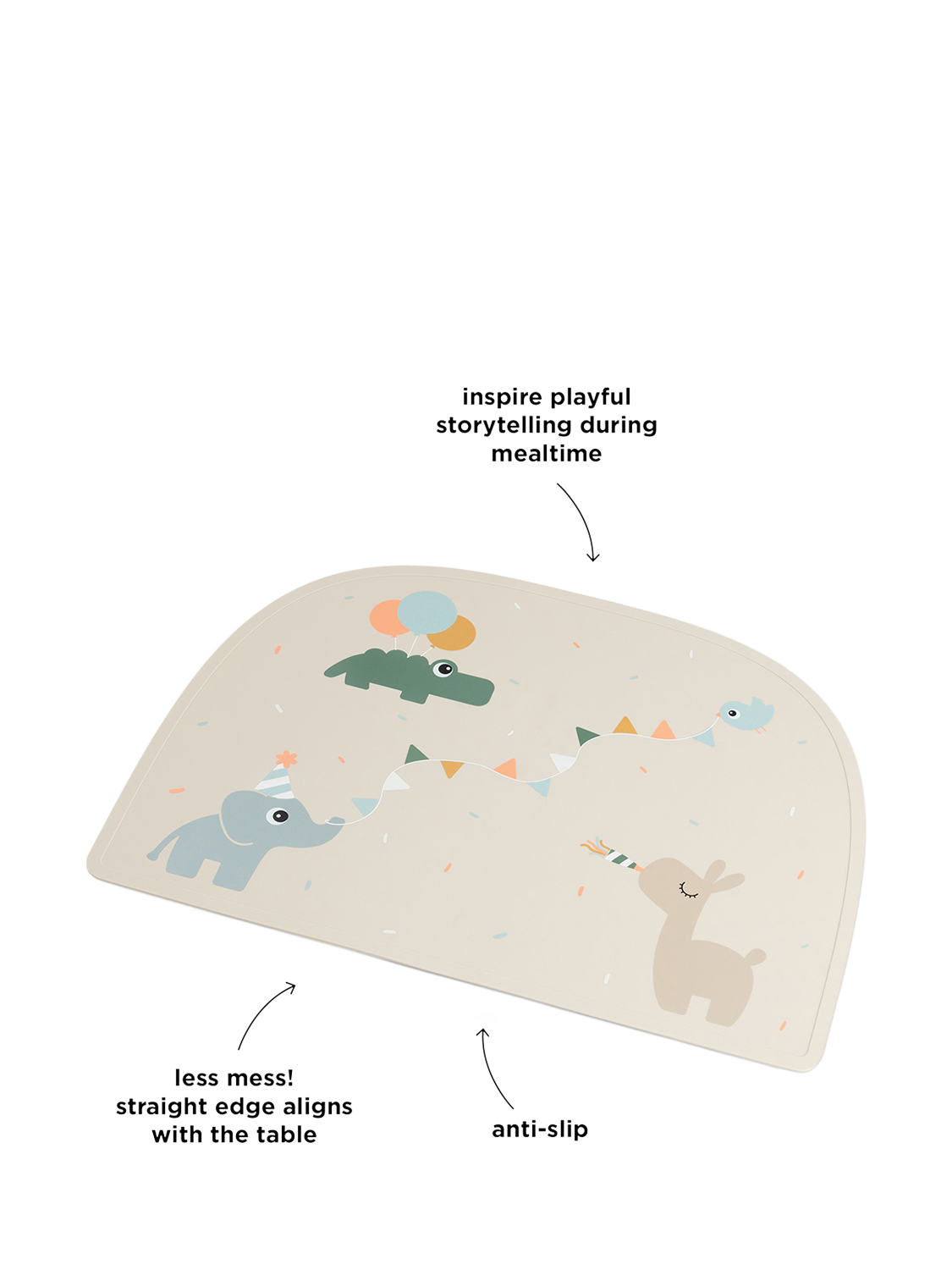 This silicone placemat will protect your table from scratches, spilled liquids and messy mealtimes. The straight edge aligns with the table so that it is easy to fit and protect the table, and the silicone is naturally anti-slip to keep it in place during mealtimes. Easy to wipe clean (and also dishwasher-safe) it's handy for playtime and creative activities as well as meals.