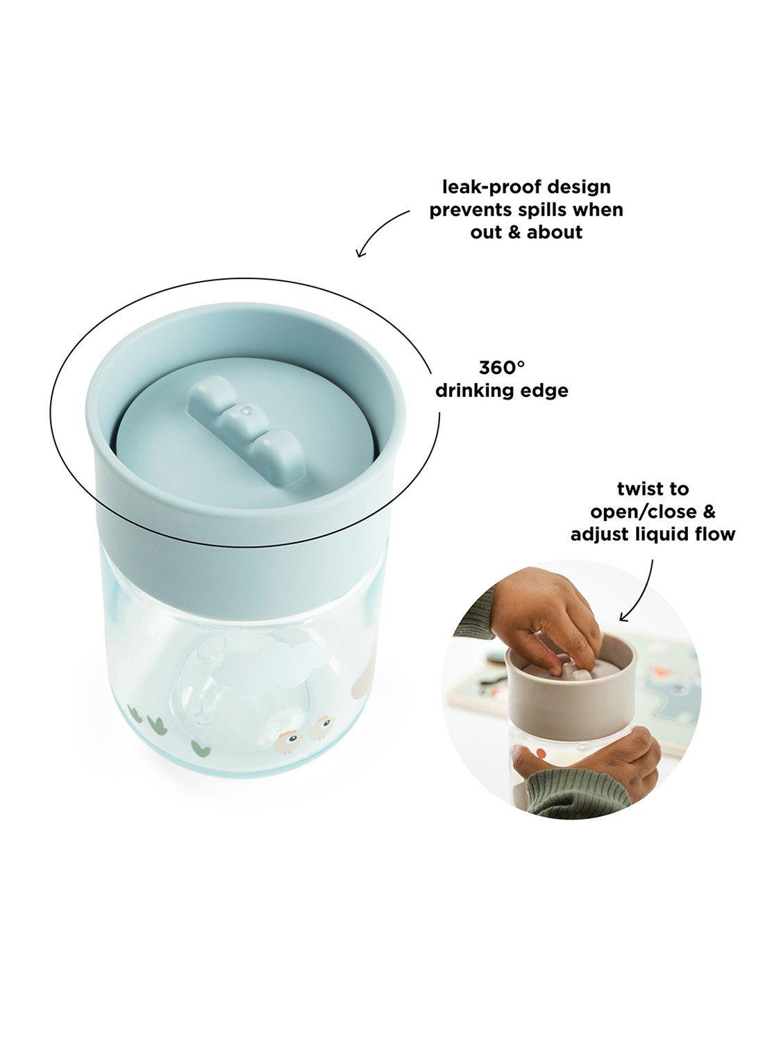 Done by Deer's 360° learning cup allows your little one to sip from any side of the cup, helping to support those early drinking skills. The twistable lid adjusts the flow of liquid to match the child’s drinking stage, making sure the flow is not too fast or too slow. The leak-proof design prevents spills when out and about and the titled rim supports smooth and confident sipping.