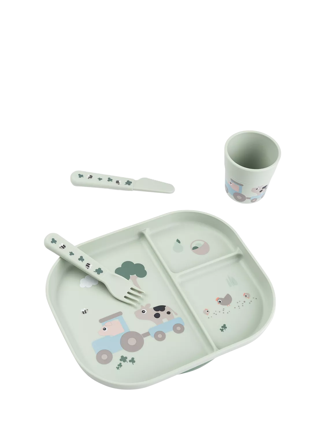 Dinner set including a 3-section compartment plate, knife, fork and mini mug.