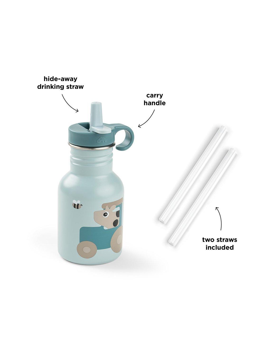 Perfect for the kids' backpack or at home in the garden, the Tiny Farm metal drinking bottle is made of 18/8 steel to be sturdy and long lasting. Designed with a practical hideaway straw and comes with a spare. There are no coatings on the inside of the bottle and it does not release any kind of flavour or chemicals.