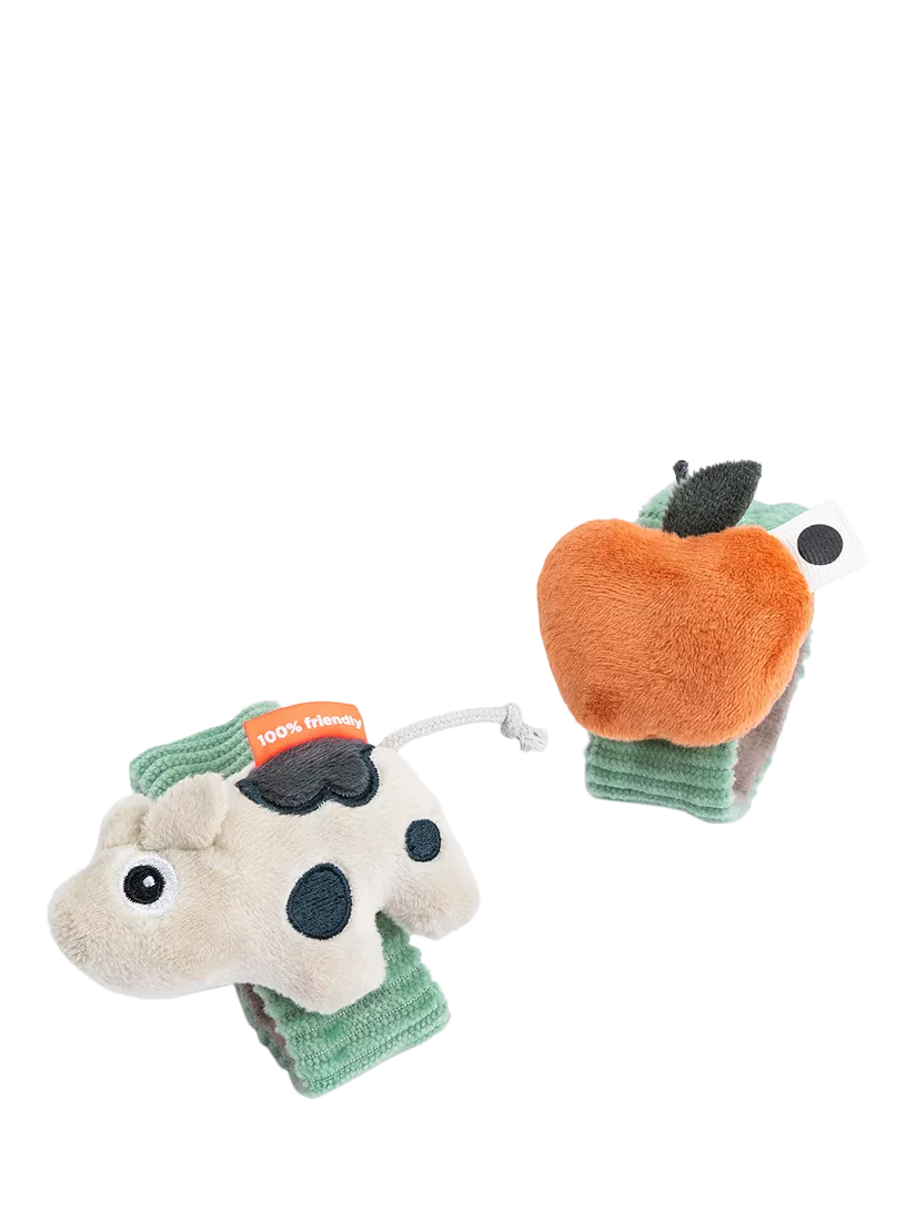 The contrasting dots and stripes promote visual stimulation whilst the rattling and crinkling sounds stimulate your child's hearing. One bracelet has Dotty the cow, while the other has stripes and a colourful apple. The Velcro closing makes it easy to put on and remove the rattles easily.