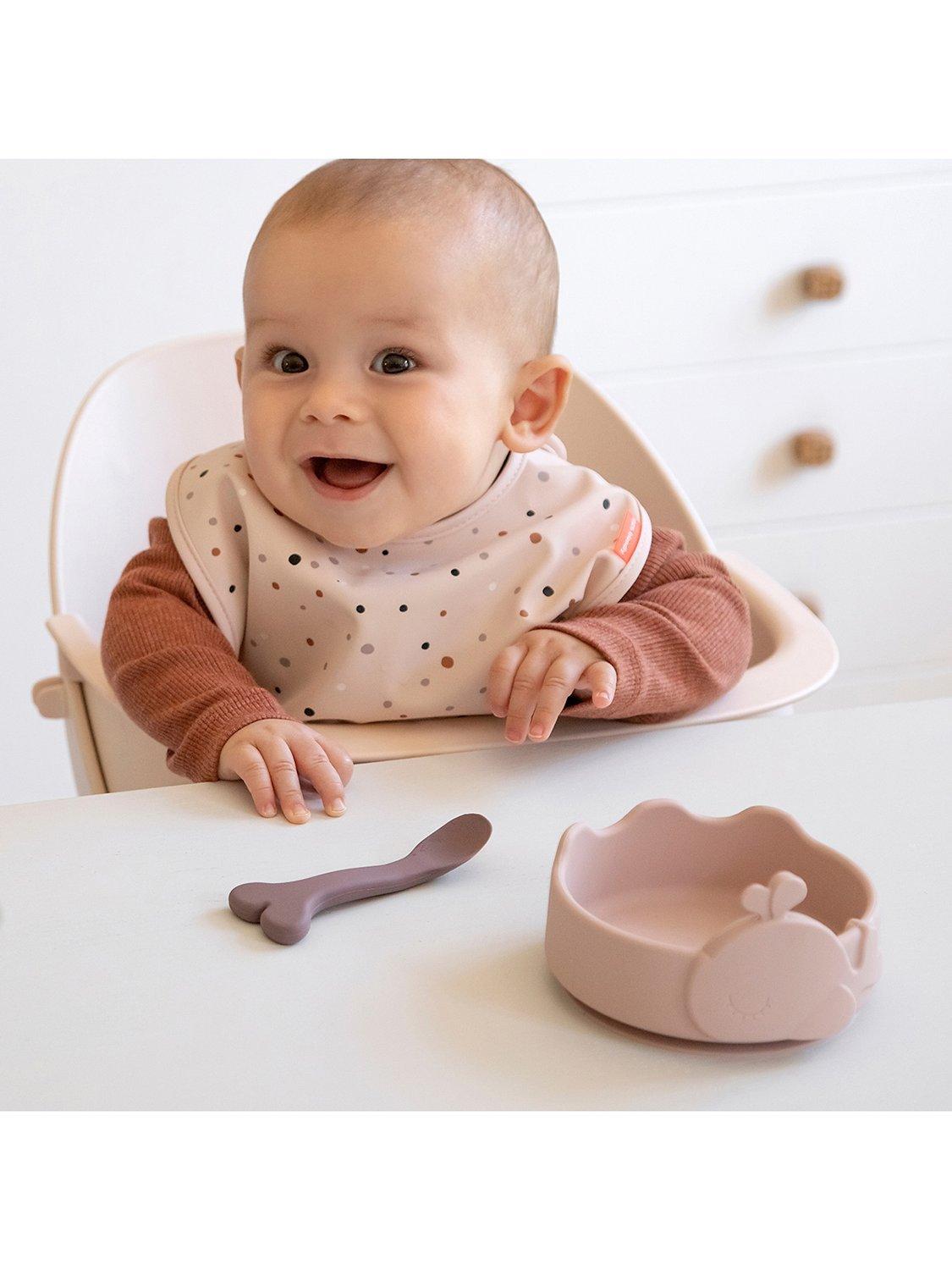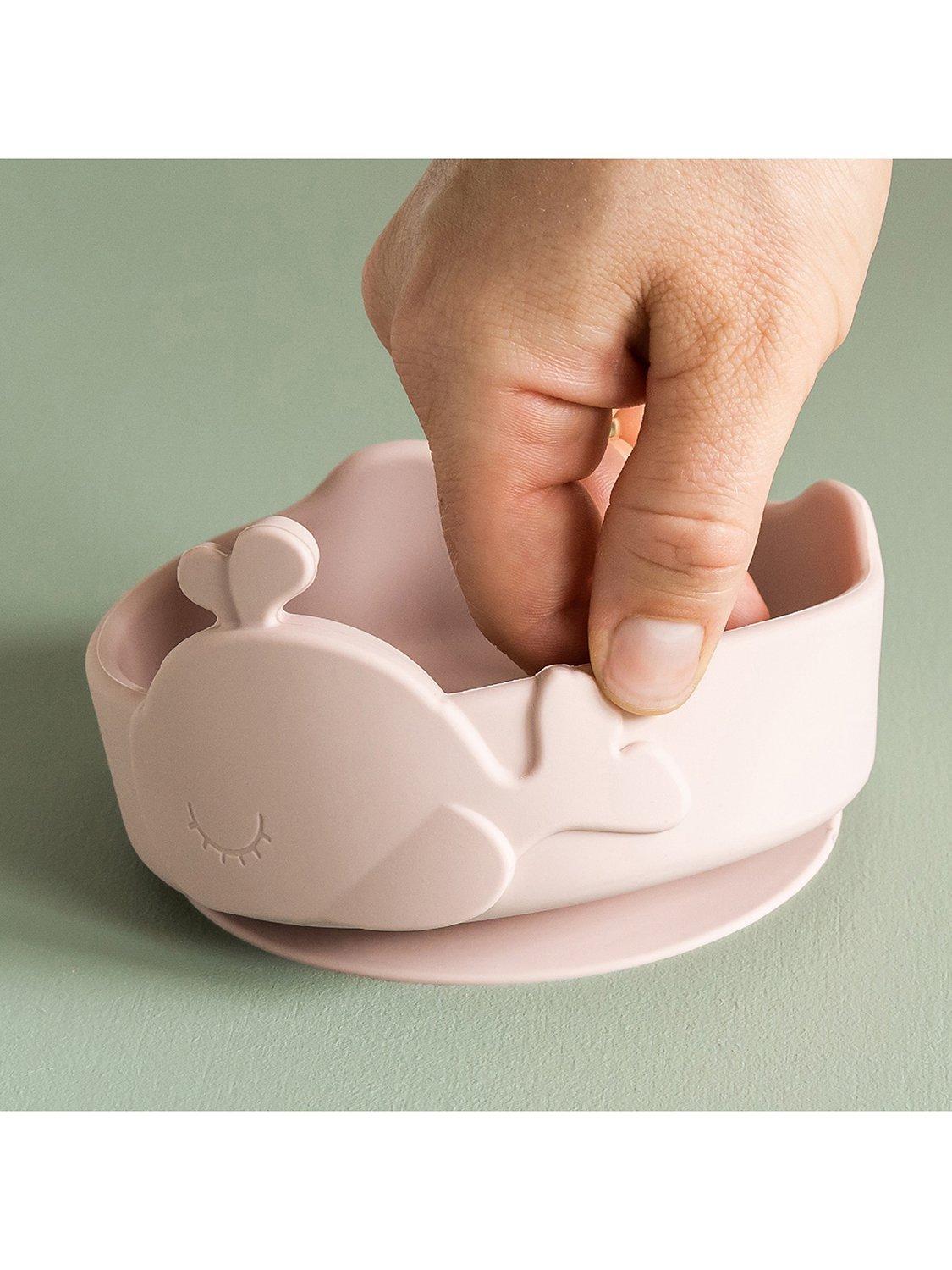 Press the bowl down and it will stick to most smooth surfaces with natural suction. The bowl's high edge makes it easy to scoop up the food and the waves create a place for the spoon to rest. The soft spoon is suitable for both feeding and eating. Little ones will enjoy exploring a meal with Wally, and Wally can't wait to see what's on the menu.