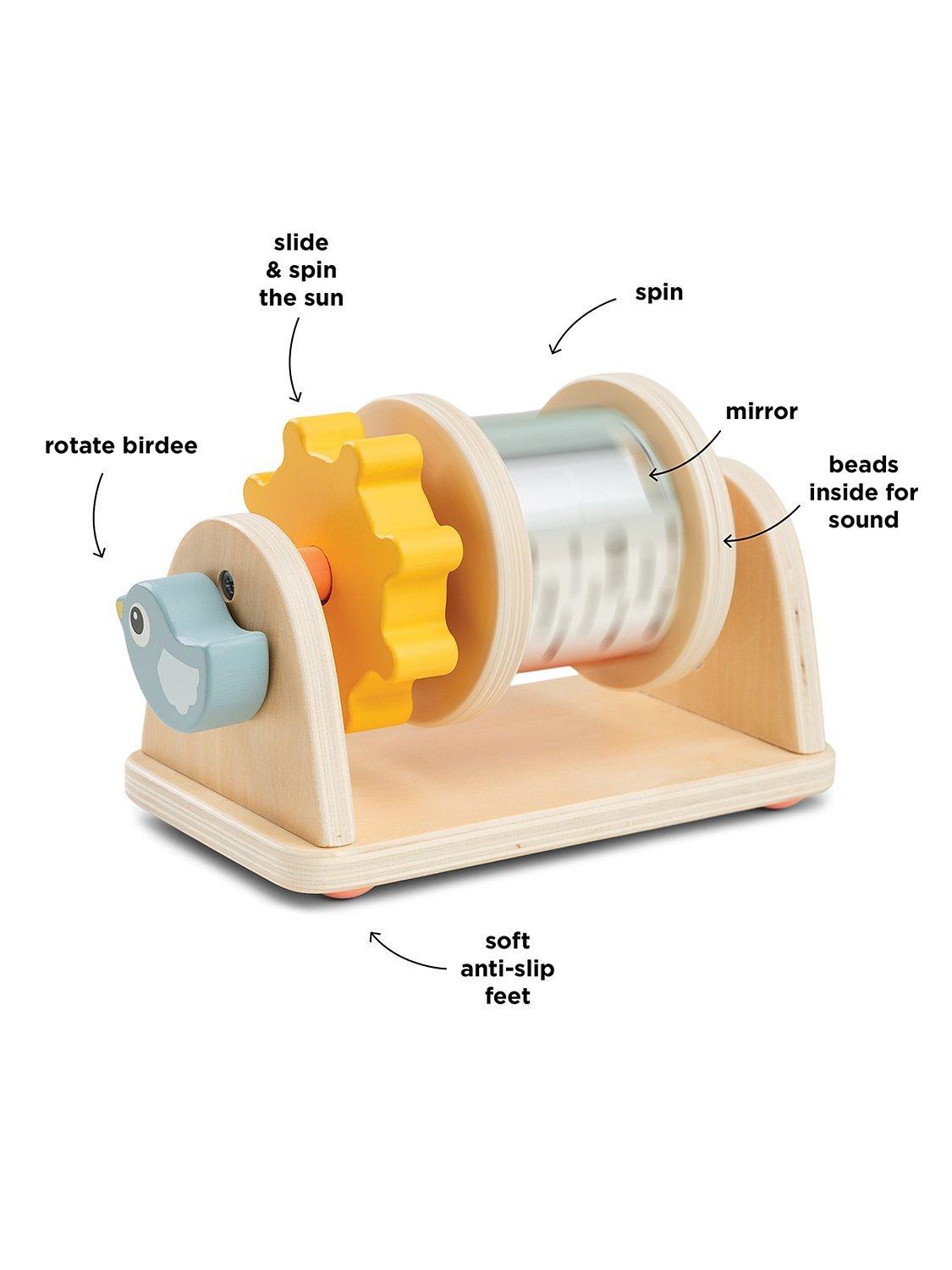 The Done by Deer Birdee wooden activity spinner toy is full of different materials for tactile stimulation.