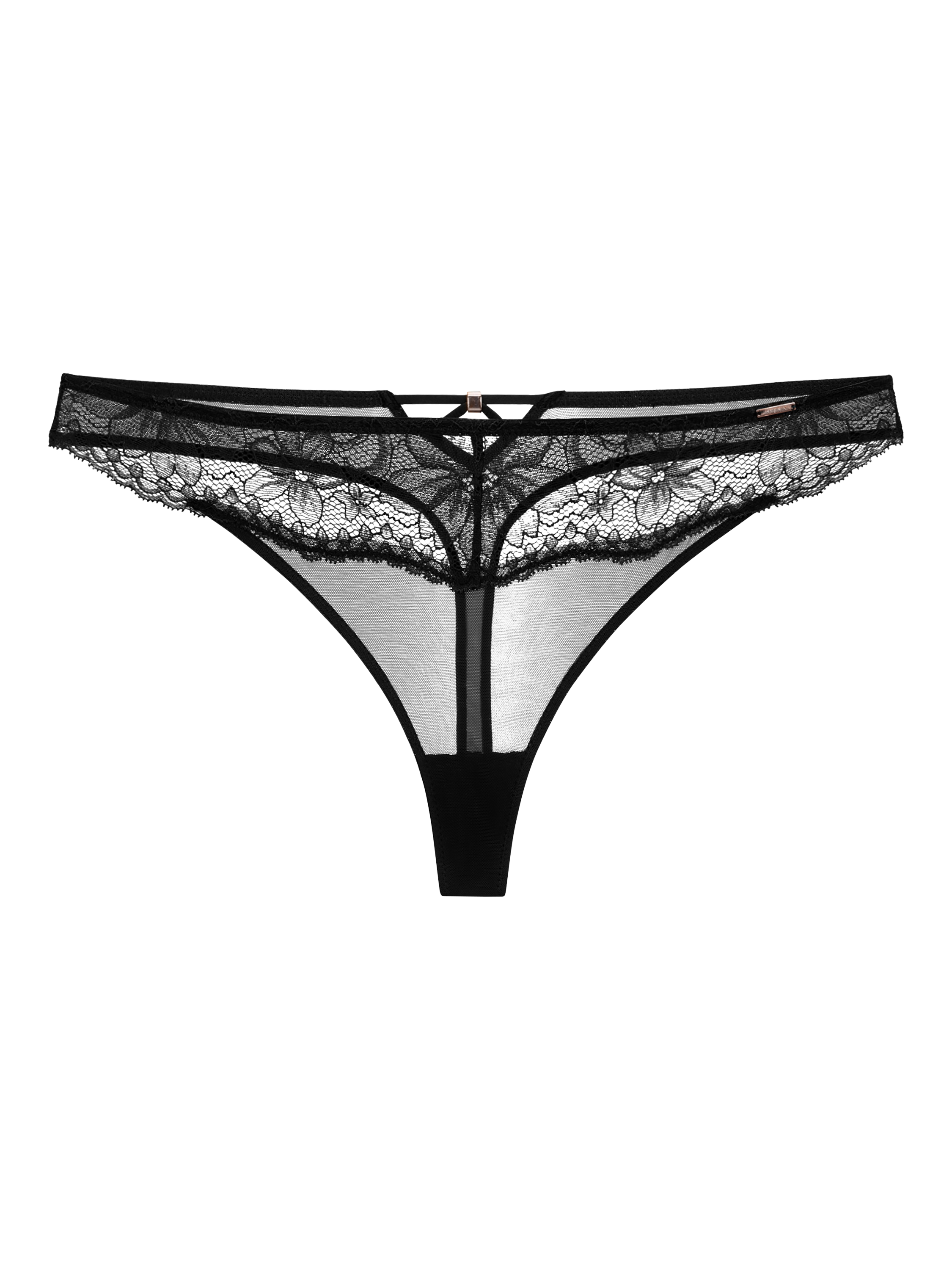 Delicately placed floral lace at the front adds a touch of finesse to this thong, while maintaining coverage where needed. At the back, it adopts a classic lace g-string shape with slightly sheer mesh, offering a flattering silhouette. The criss-cross straps at the centre, accompanied by a golden accessory, add a subtle and modern detail.