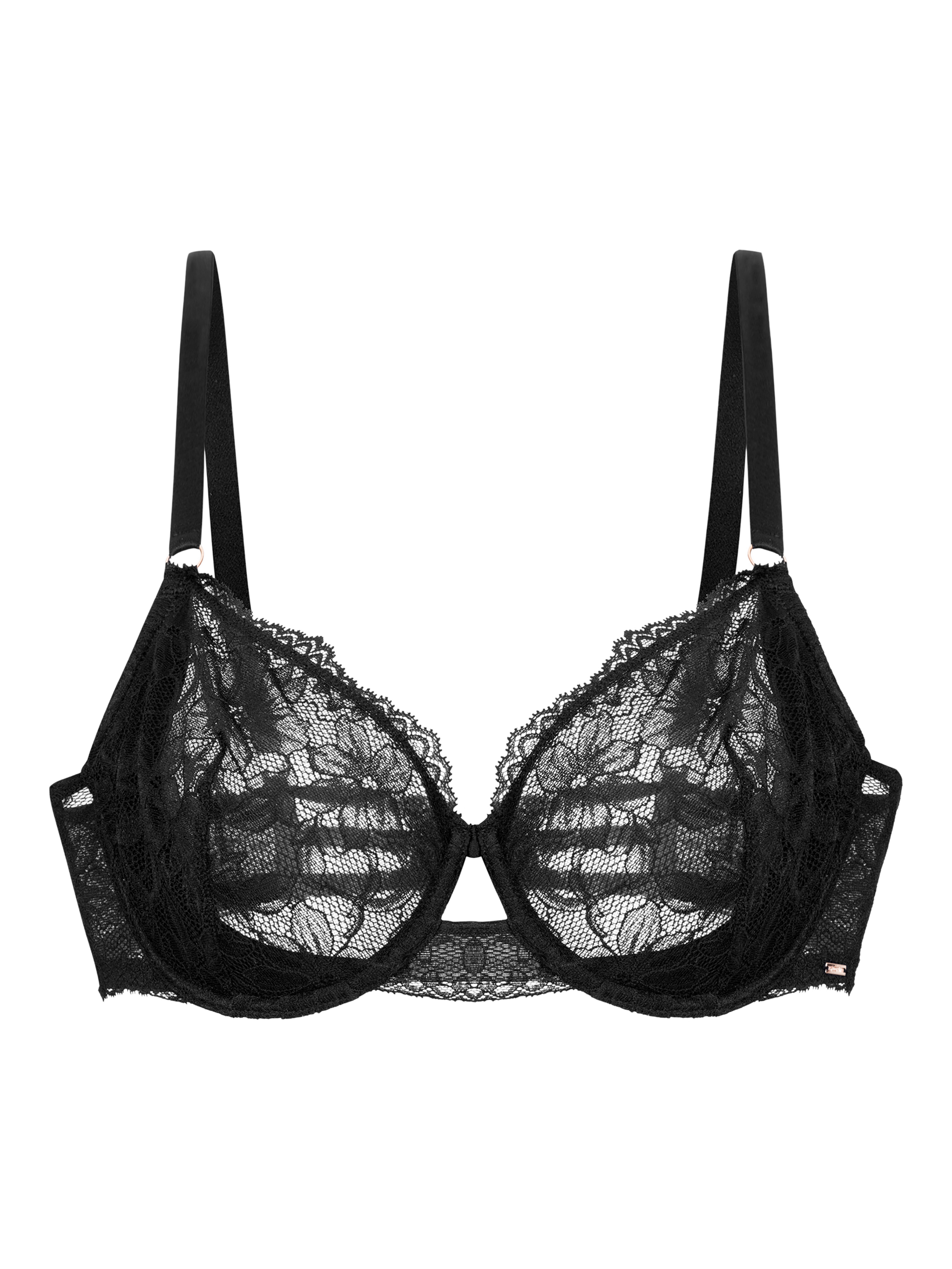 The Kikky Full Cup bra combines comfort with sensuality, offering full coverage support in a romantic, floral lace design. The lace extends from the cups to the underbust with a keyhole detail at the front. Strappy back detail adds allure and elegance, making it both supportive and visually stunning.