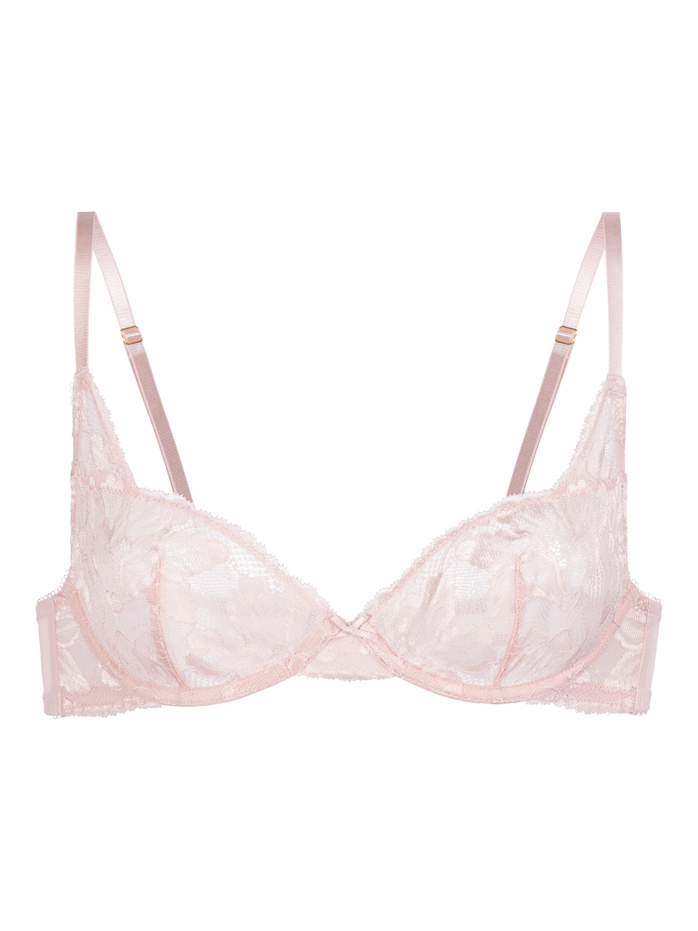 A scooping three-quarter cup bra with a plunge silhouette and zero padding for a natural shape. Features a delicate lace overlay for a romantic, flirty look.