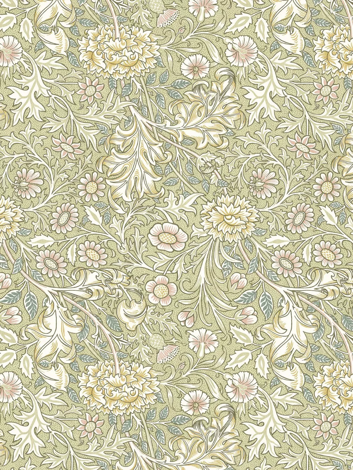 Double Bough was originally designed as a chintz textile in 1877. This charming pattern features a blend of flowers, including: pinks, thistles and chrysanthemums, set against a dotted background, entwined with acanthus leaves. This intricate floral design has been expertly printed on cotton.