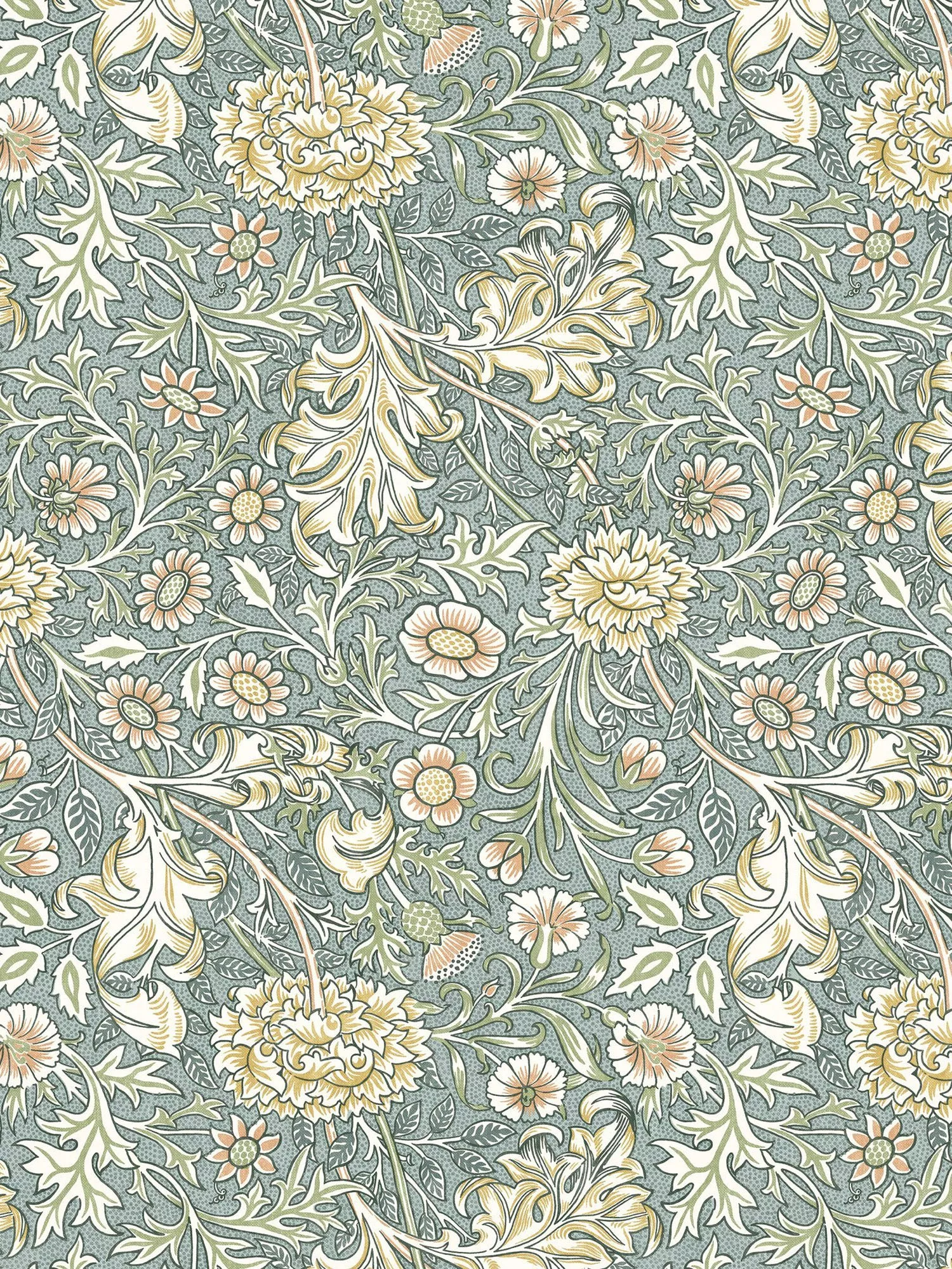 Double Bough was originally designed as a chintz textile in 1877. This charming pattern features a blend of flowers, including: pinks, thistles and chrysanthemums, set against a dotted background, entwined with acanthus leaves. This intricate floral design has been expertly printed on cotton.