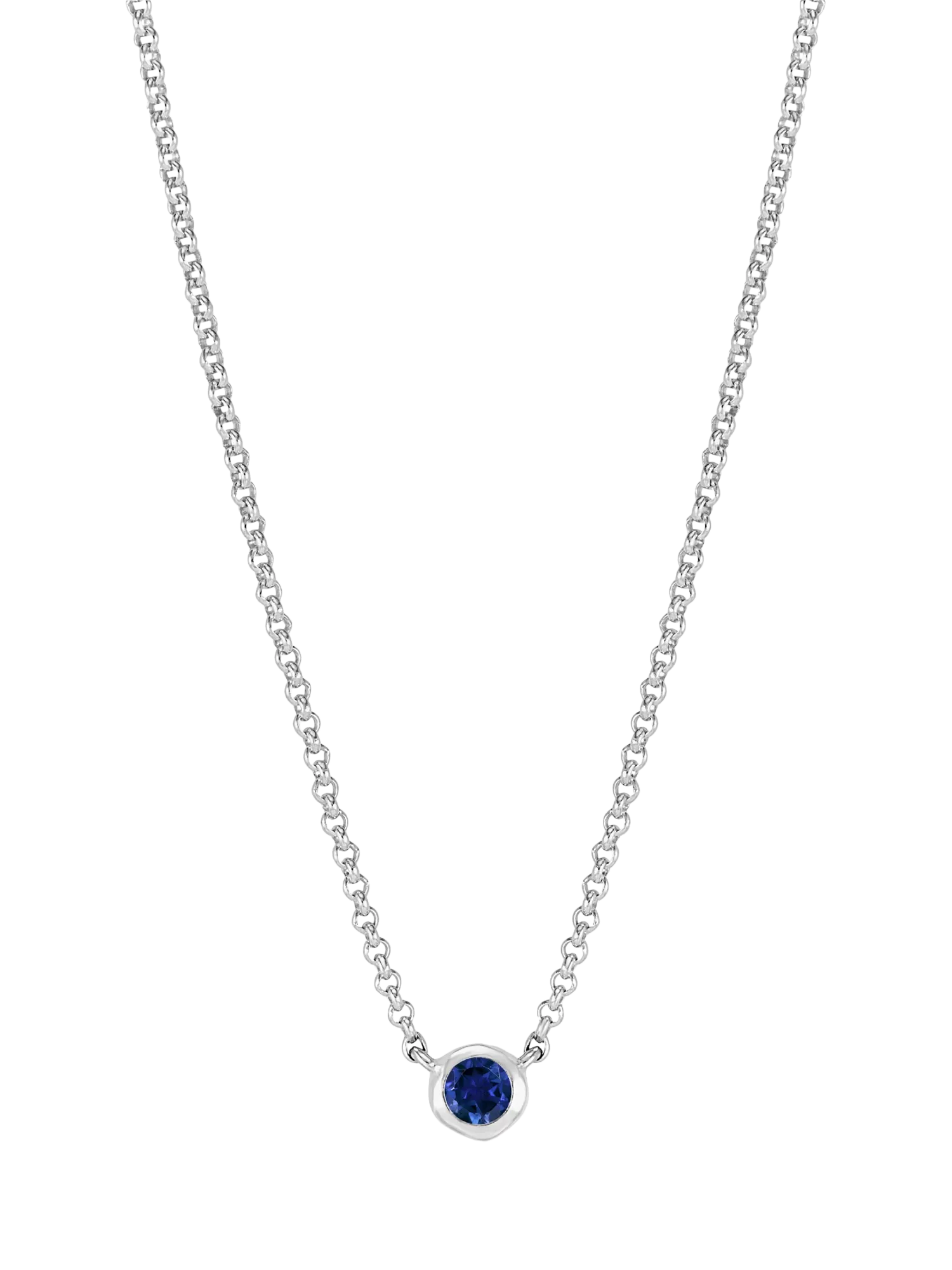 Perfect worn alone or with layered up with other jewellery, this dainty sterling silver round Dewdrop pendant is set with a 4mm sapphire and suspended on fine belcher chain.
