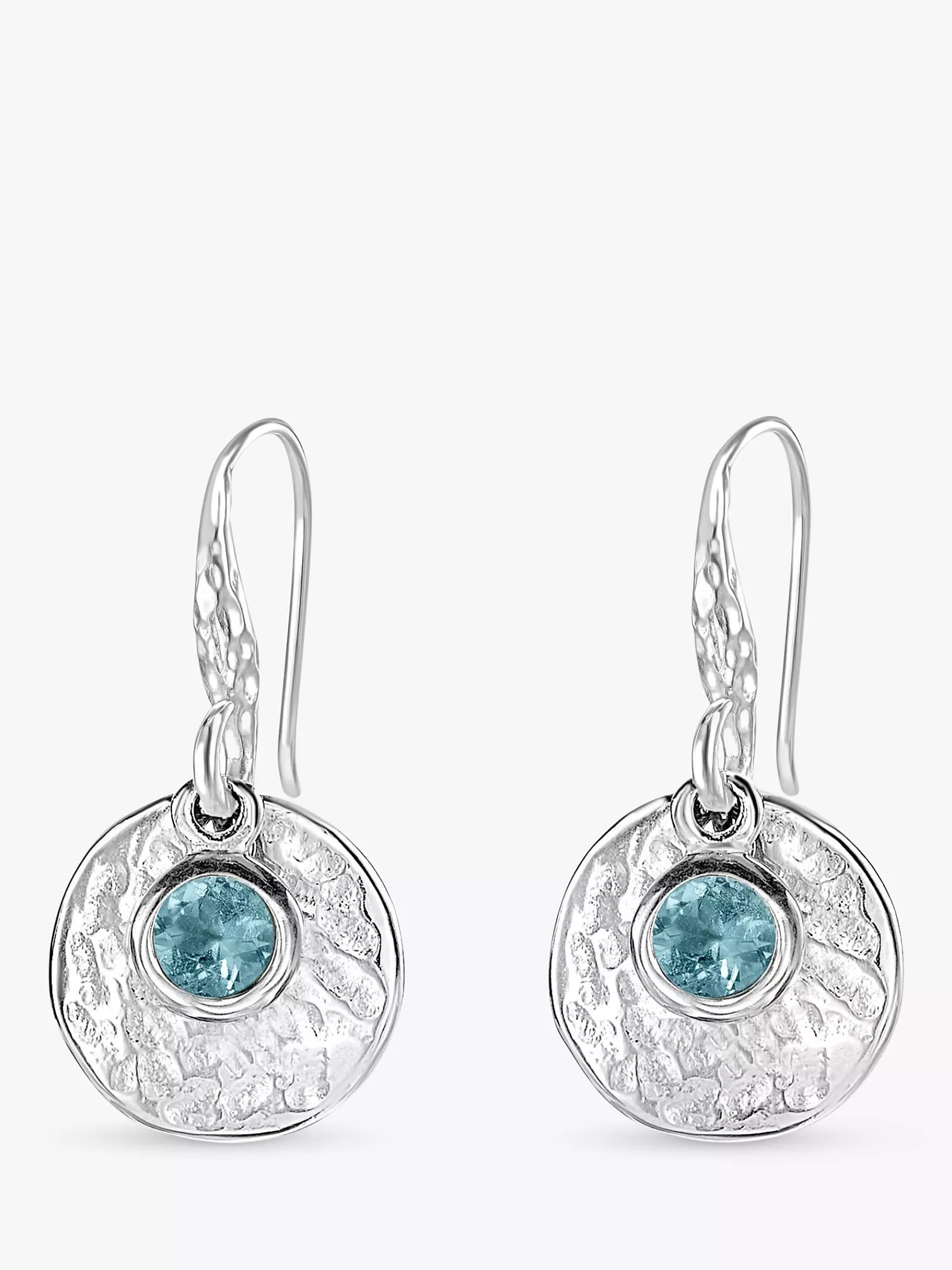 Sterling silver drop earrings featuring radiant aquamarines, layered with round hammered discs. The drops are suspended on contemporary ear wires.