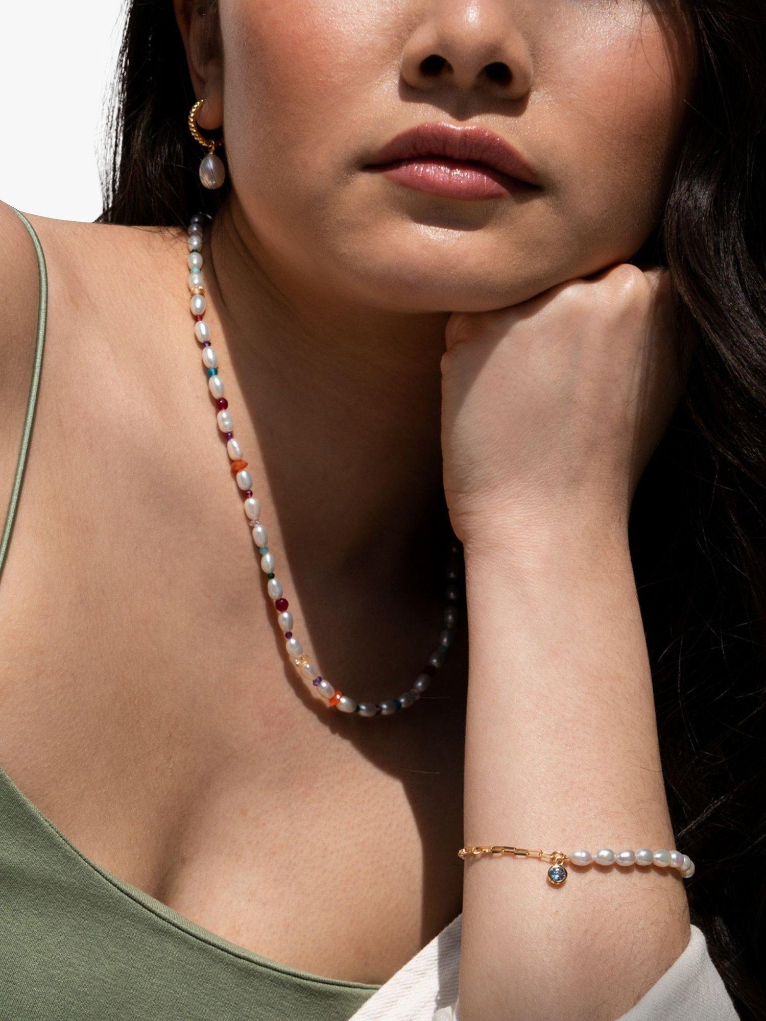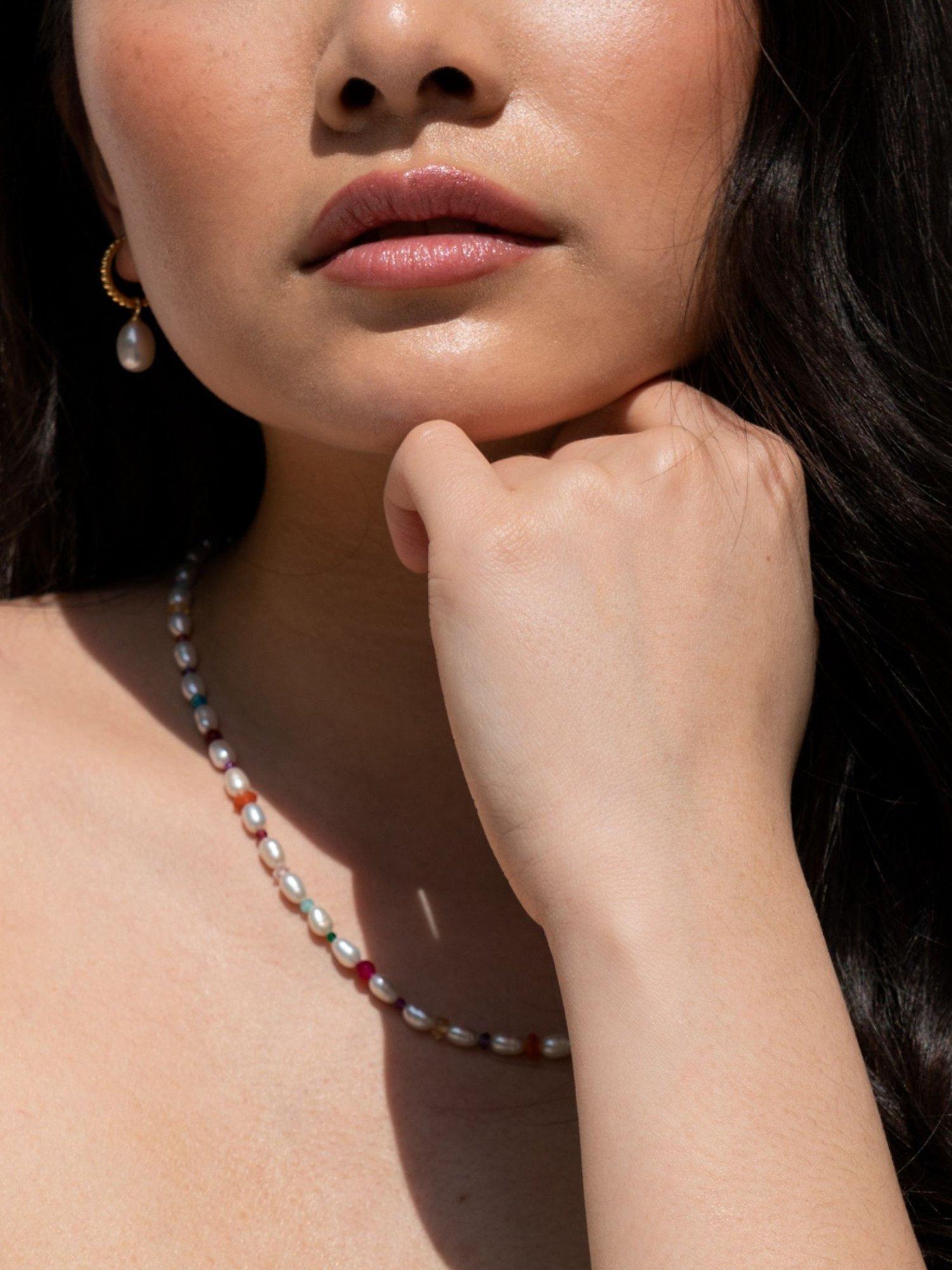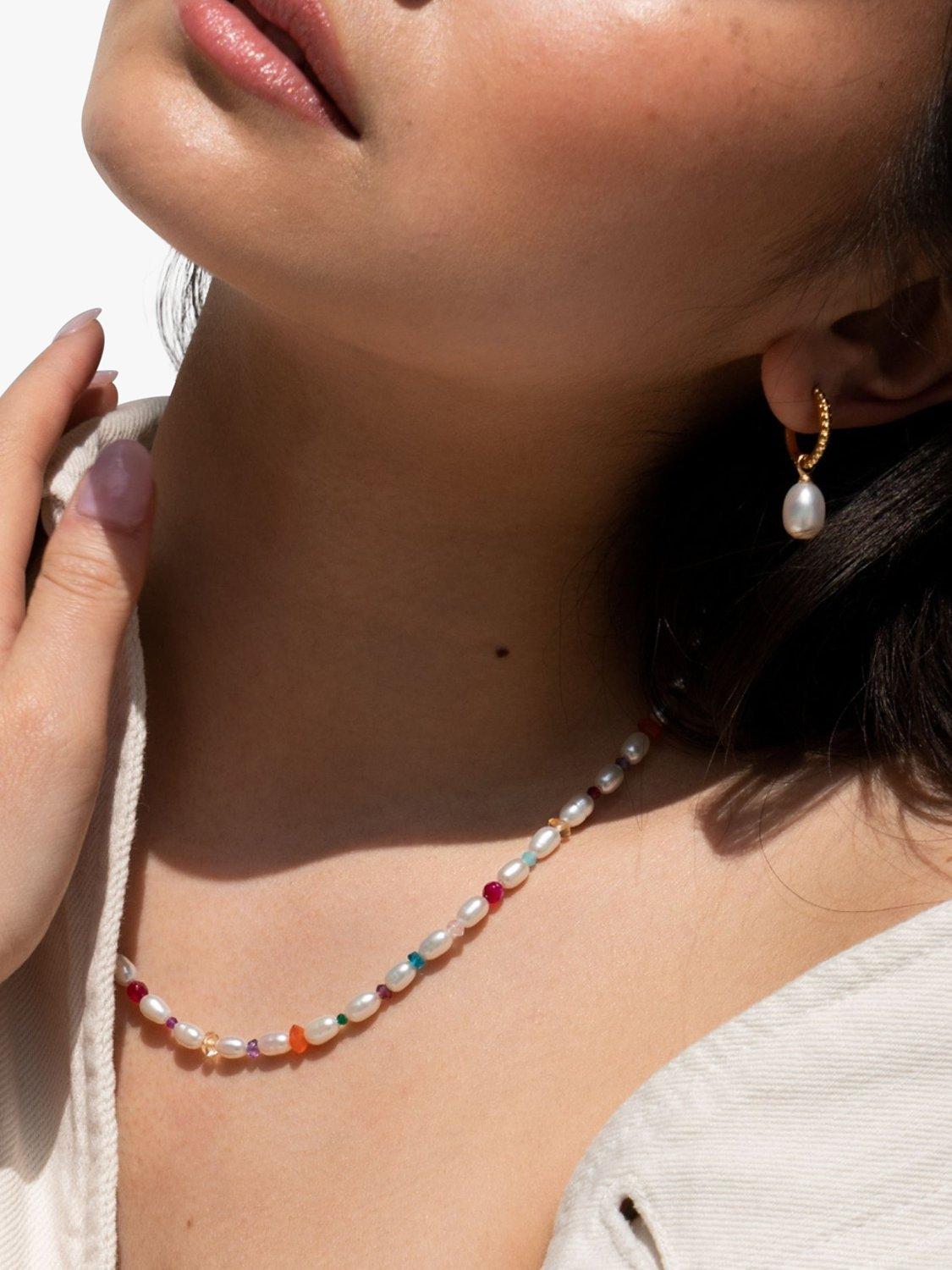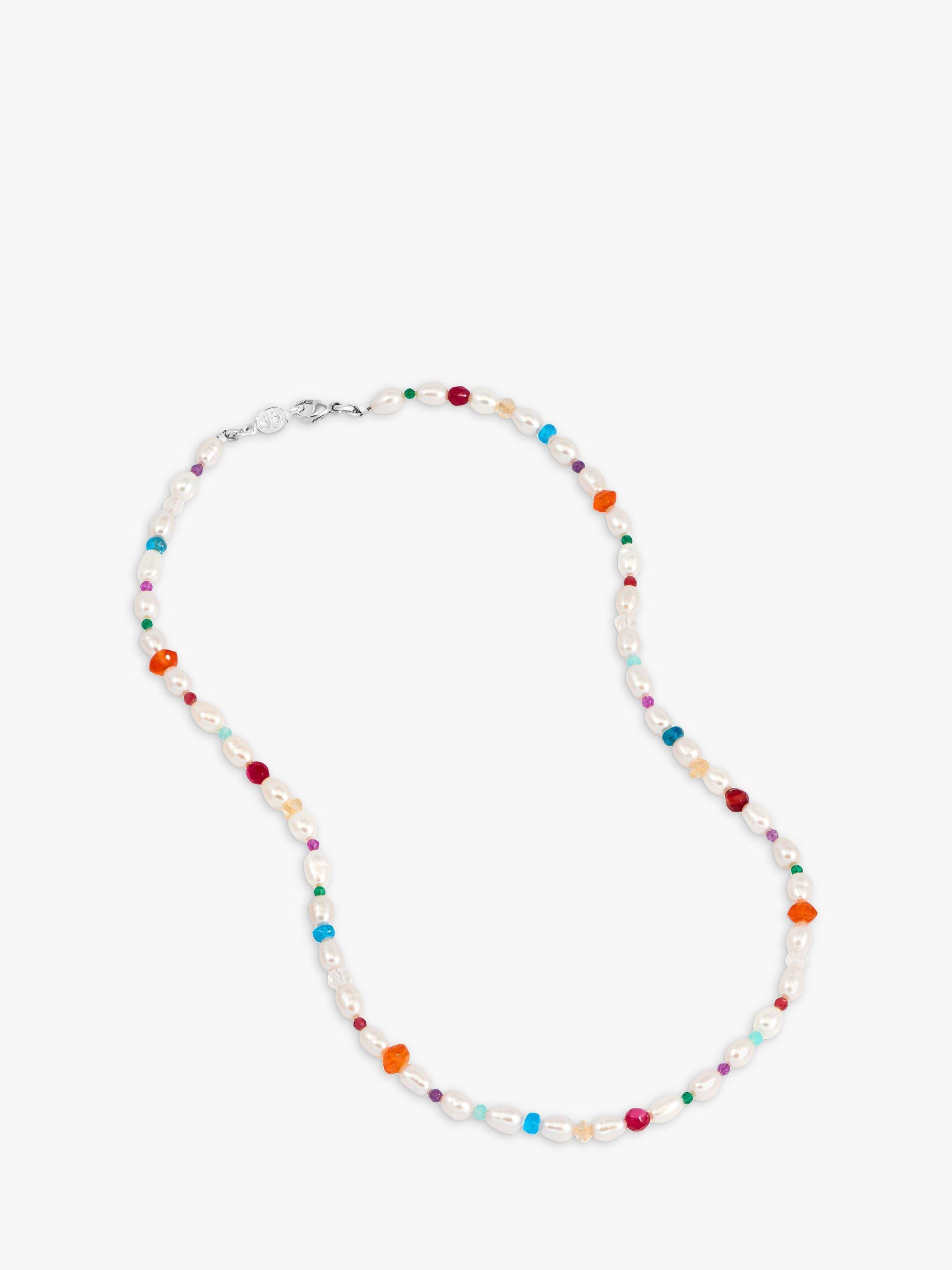 Pearls but not as you know them. This vibrant collar necklace features oval white freshwater pearls interspersed with a colourful combination of mixed gemstone beads. Ideal for special occasions or just to add an elegant twist to your look, it is finished with the designer's signature beaten loop and t-bar catch.