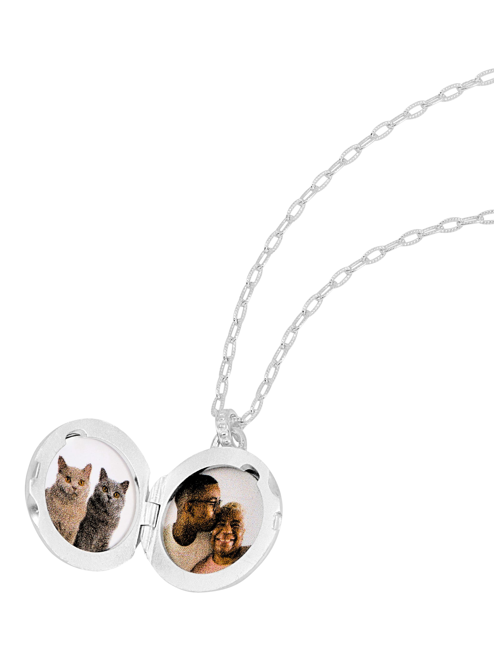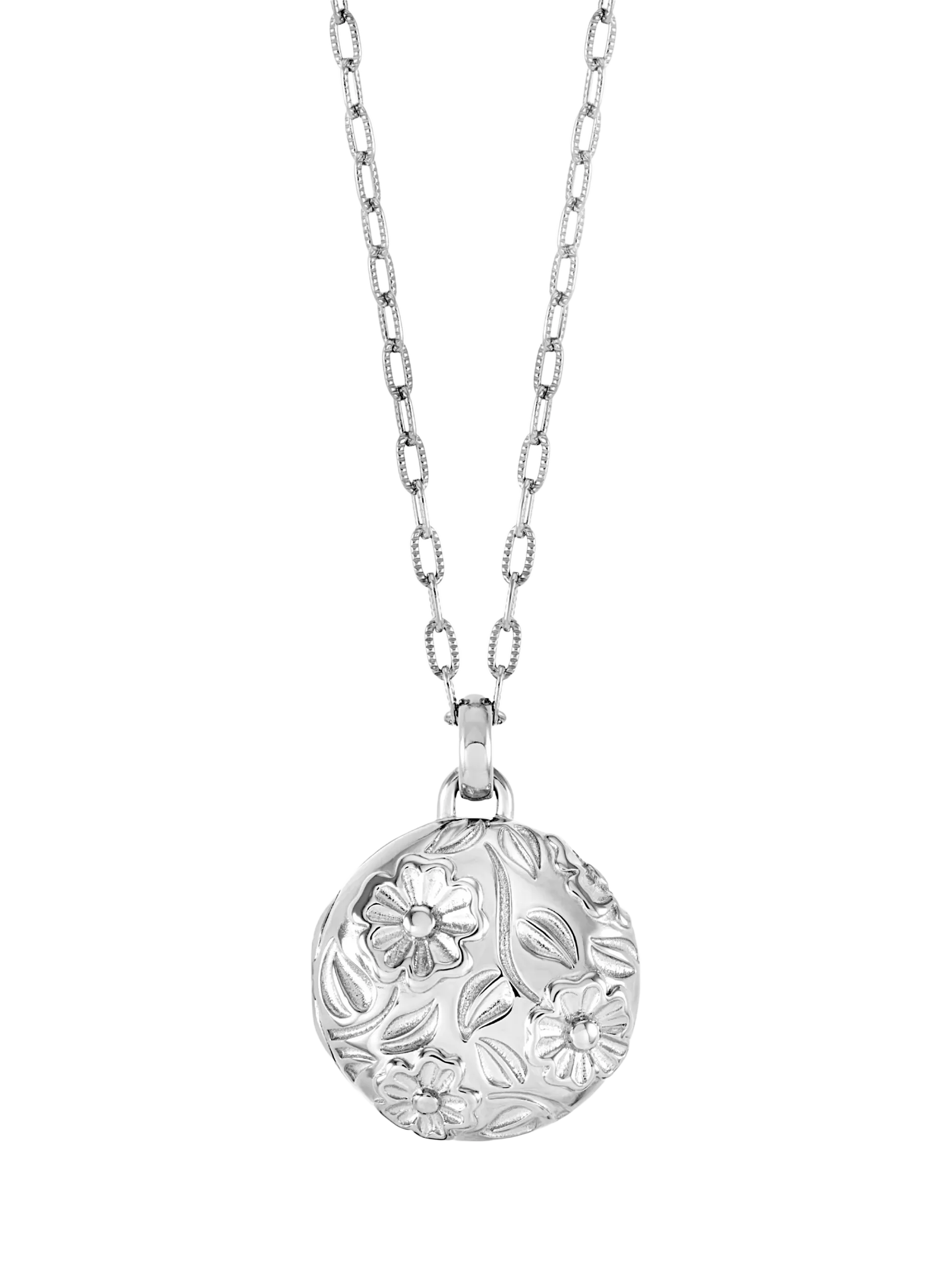 Engraved with the famous flower, celebrate your precious stories with the 'Forget-Me-Not' locket. This round-shaped locket is suspended on a beautifully-textured, adjustable millie-grain chain and finished with the brand's signature D&H lobster catch. Locket holds two images.