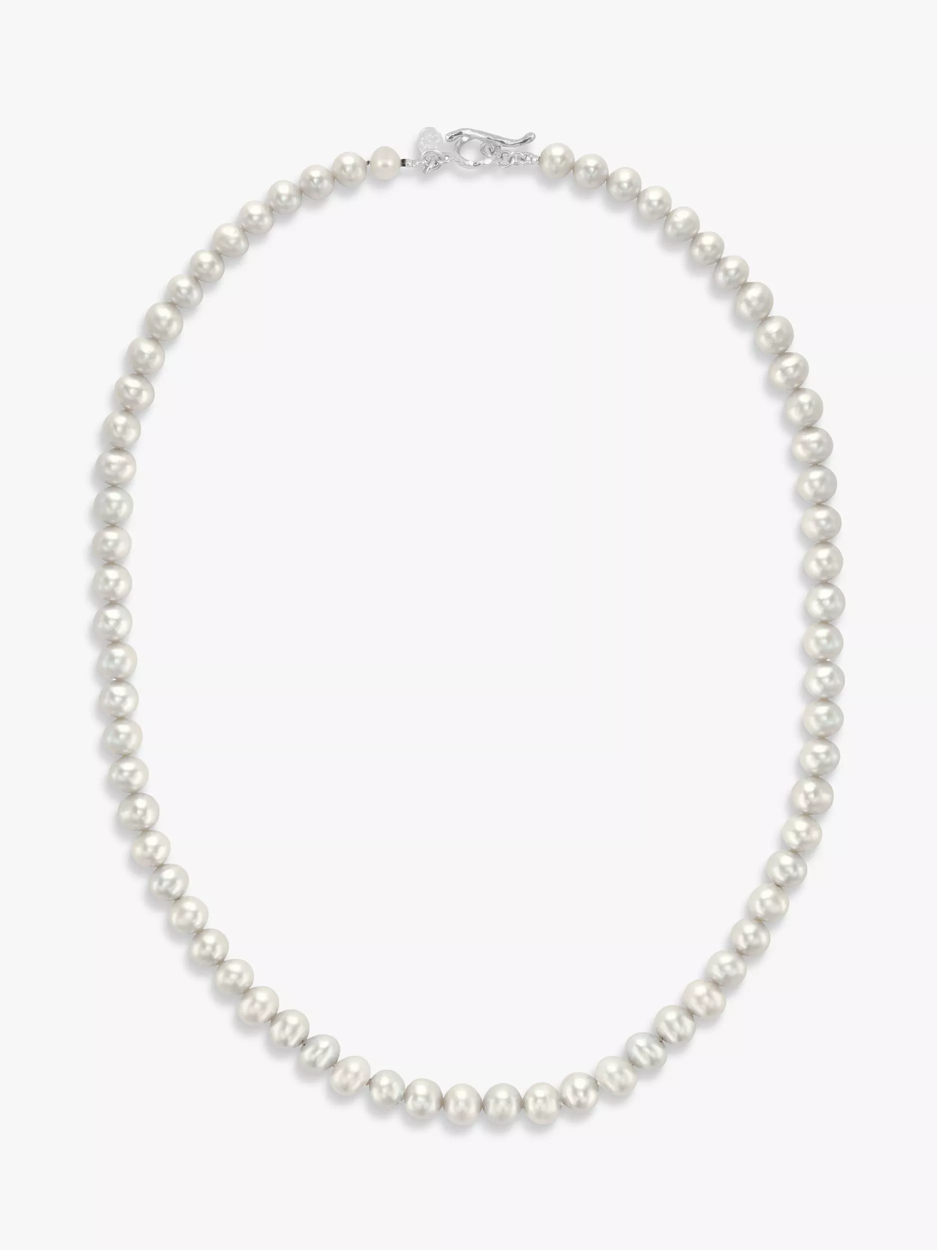 Nothing beats a good pearl necklace. A truly classical style, this pearl necklace for Dower & Hall will make a great finishing touch to your look. Made with a strand of lustrous freshwater pearls, it is finished with the brand's signature sterling silver hammered loop and t-bar clasp.