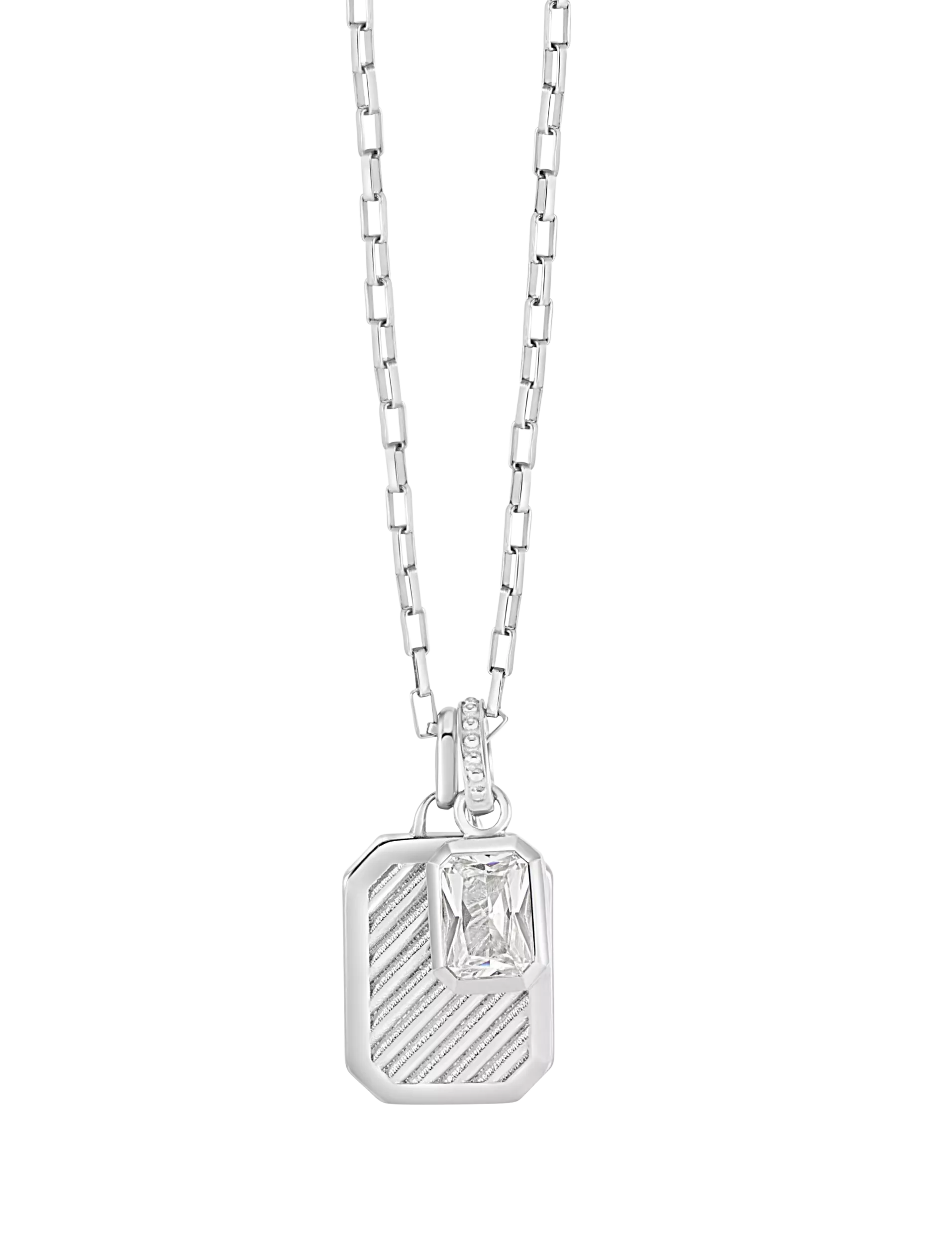 Find the perfect balance between colour and style with this two-charm Humbug Necklace. Suspended on sterling silver paperclip chain, the lozenge-shaped silver pendant is carved with a humbug stripe design and paired with an eye-catching octagon white topaz gemstone.