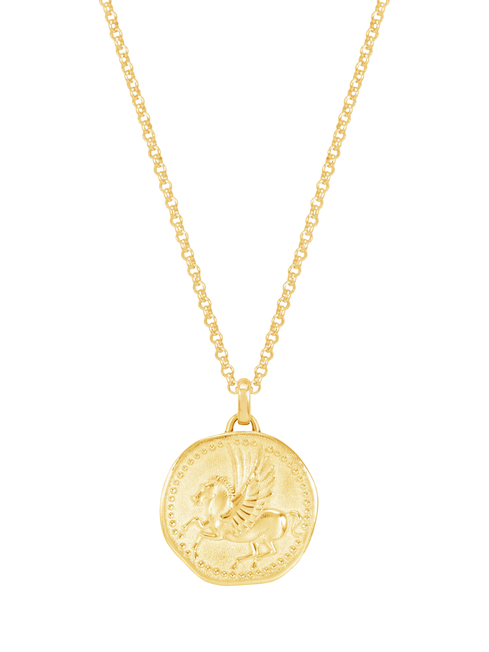 Navigate life's journey protected and guided by your own collection of amulets and talismans. This sterling silver Talisman necklace features Pegasus, the mythological flying horse which is long believed to be the the symbol of overcoming adversity and challenges.Suspended on belcher chain with our signature lobster catch, this unique sterling silver pendant has a yellow gold vermeil finish.