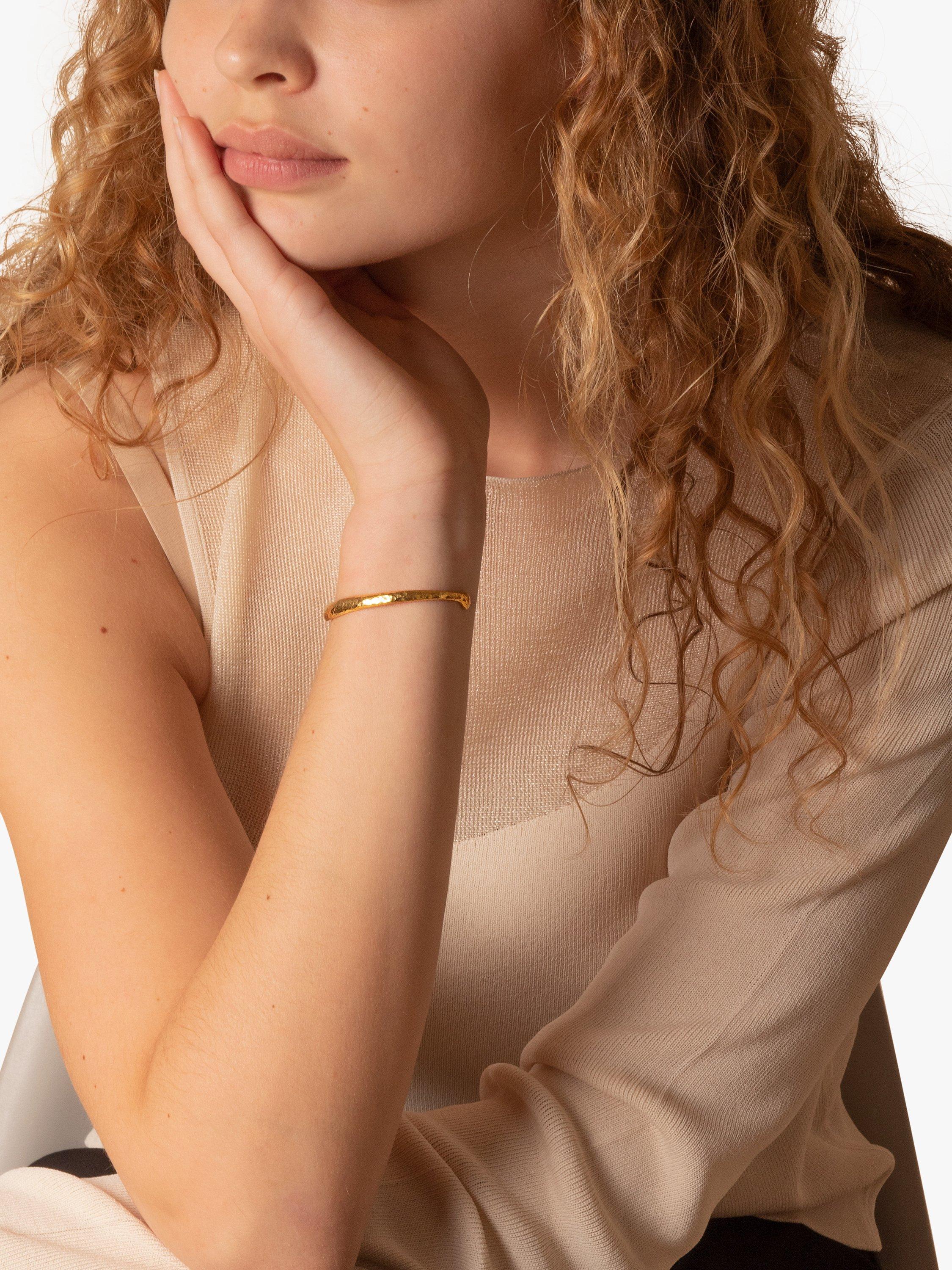 Nomad bangle from Dower & Hall. 18ct gold vermeil on sterling silver with a hammered finish. The bangle is 5.5mm in height at the widest point.