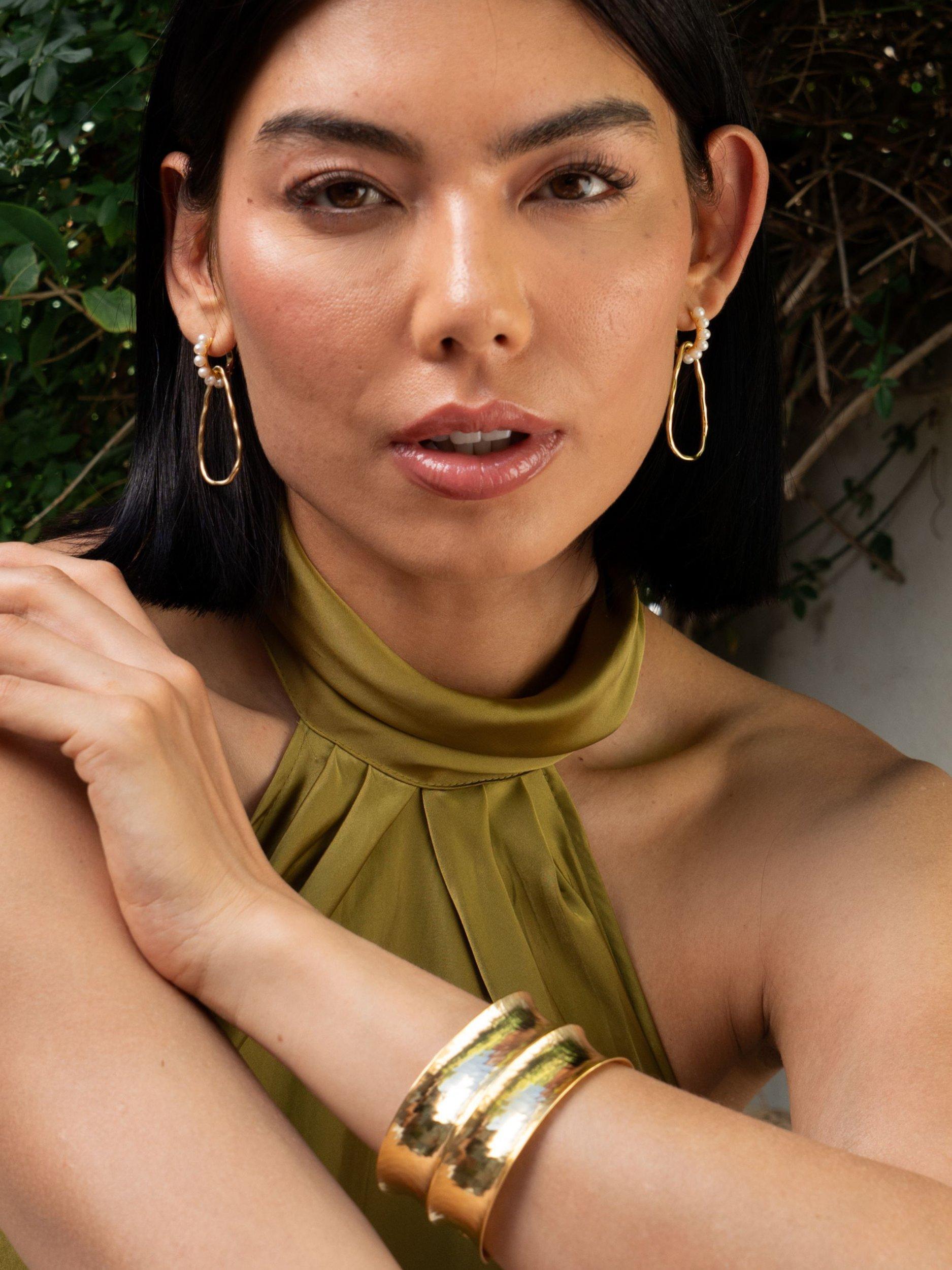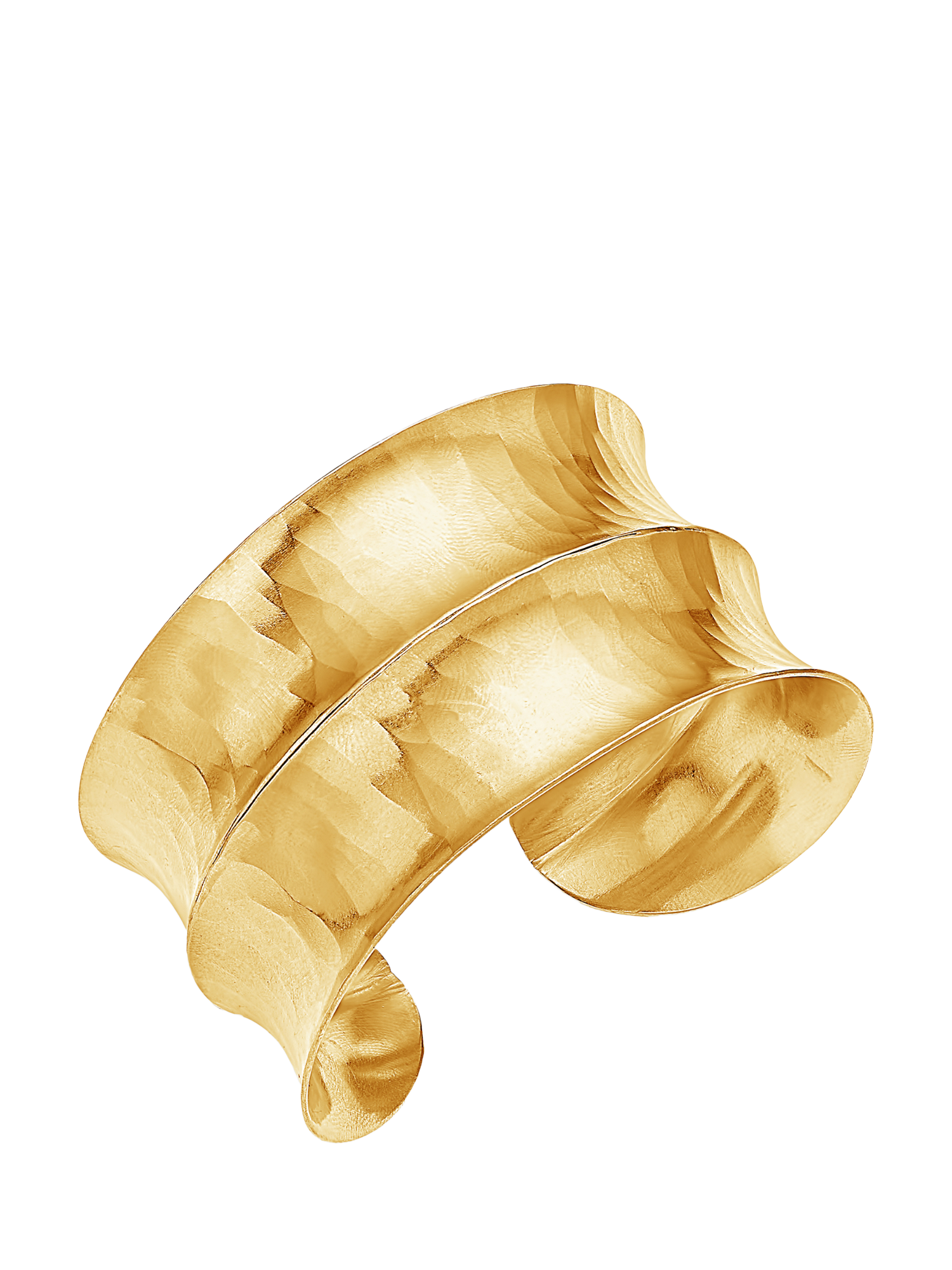 This beautiful, chunky cuff is perfect for adding an ethnic touch to any ensemble. Handmade, this 18ct gold vermeil on sterling silver piece features a ridged and hammered finish making it the perfect statement piece worn alone or stacked.