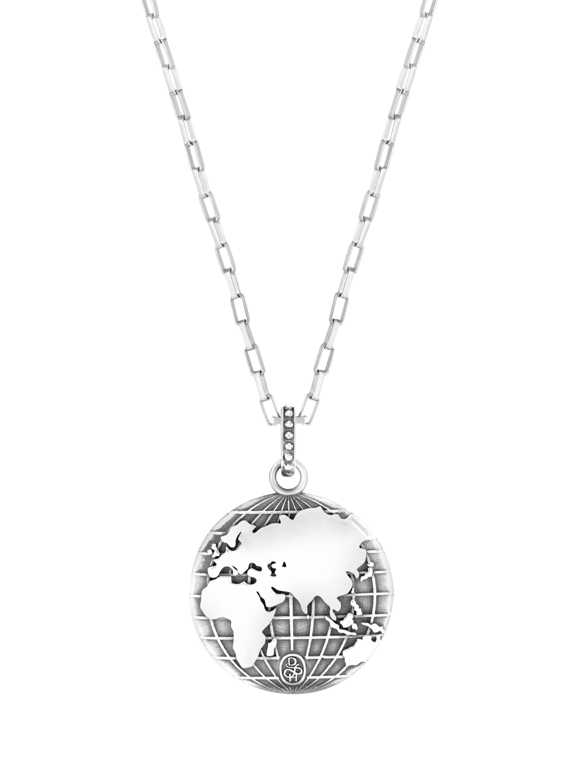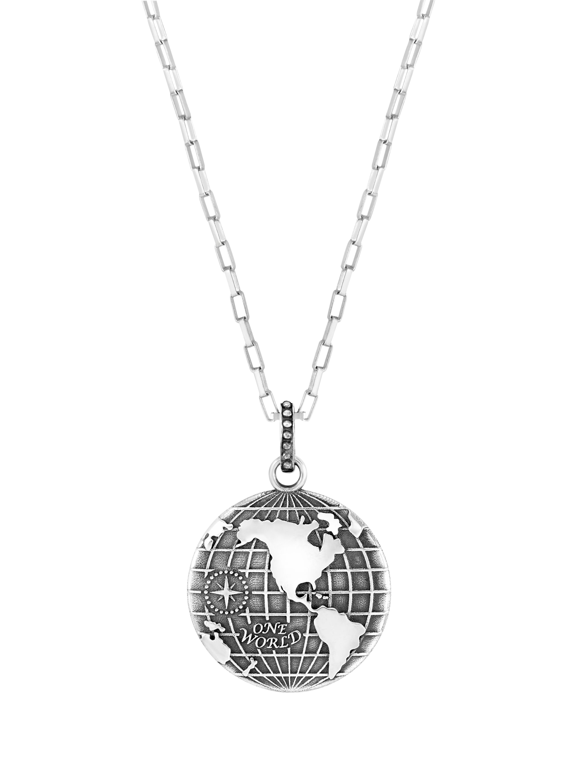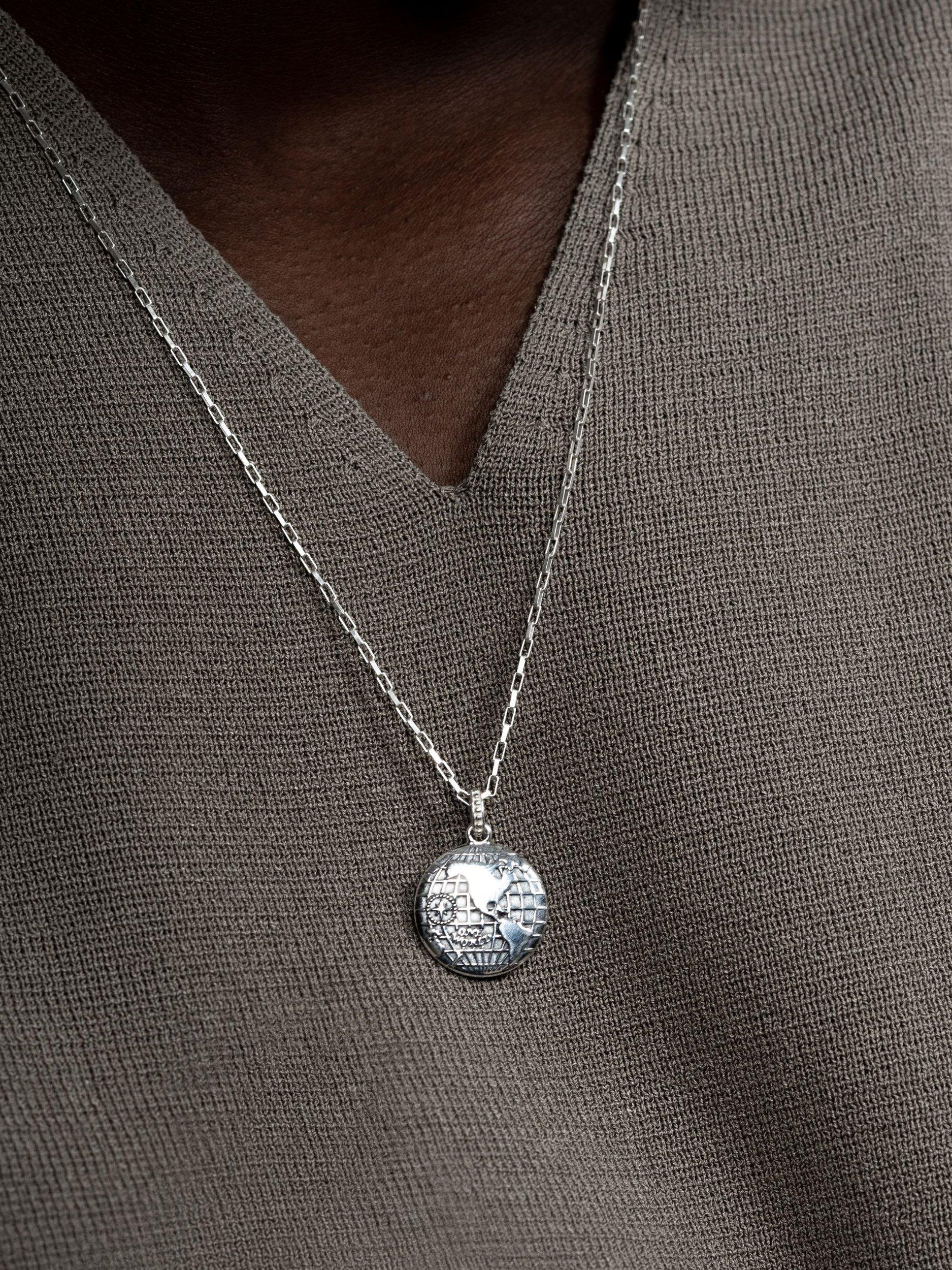 This talisman necklace features a detailed globe design, accompanied by a guiding compass and the words "One World". The western and eastern hemispheres are in clear view, along with the longitude and latitude lines that span the planet and connect everything together.